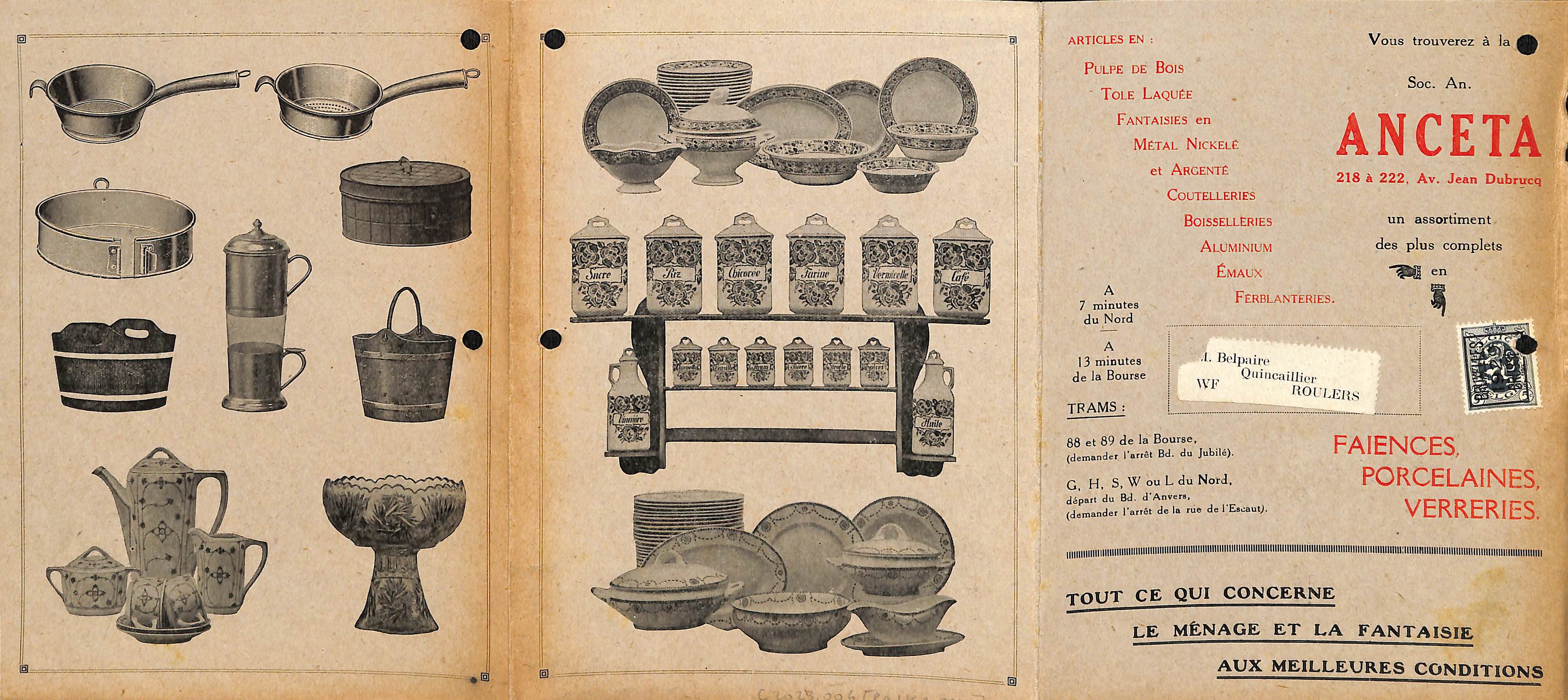 Dépliant ANCETA, faïences, porcelaines, verreries, Avenue Jean Dubrucq, 218-222 (Molenbeek-Saint-Jean), s.d.