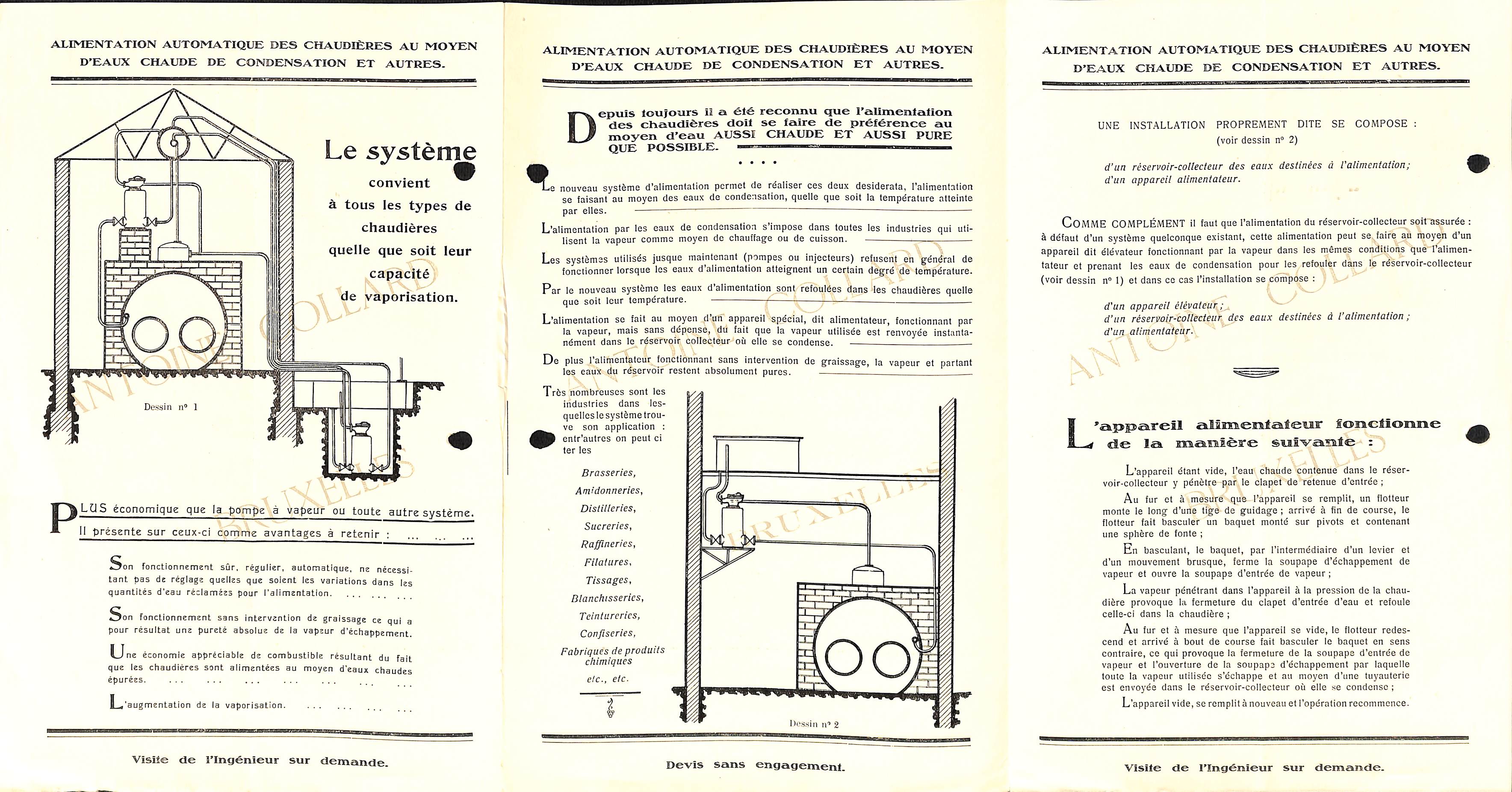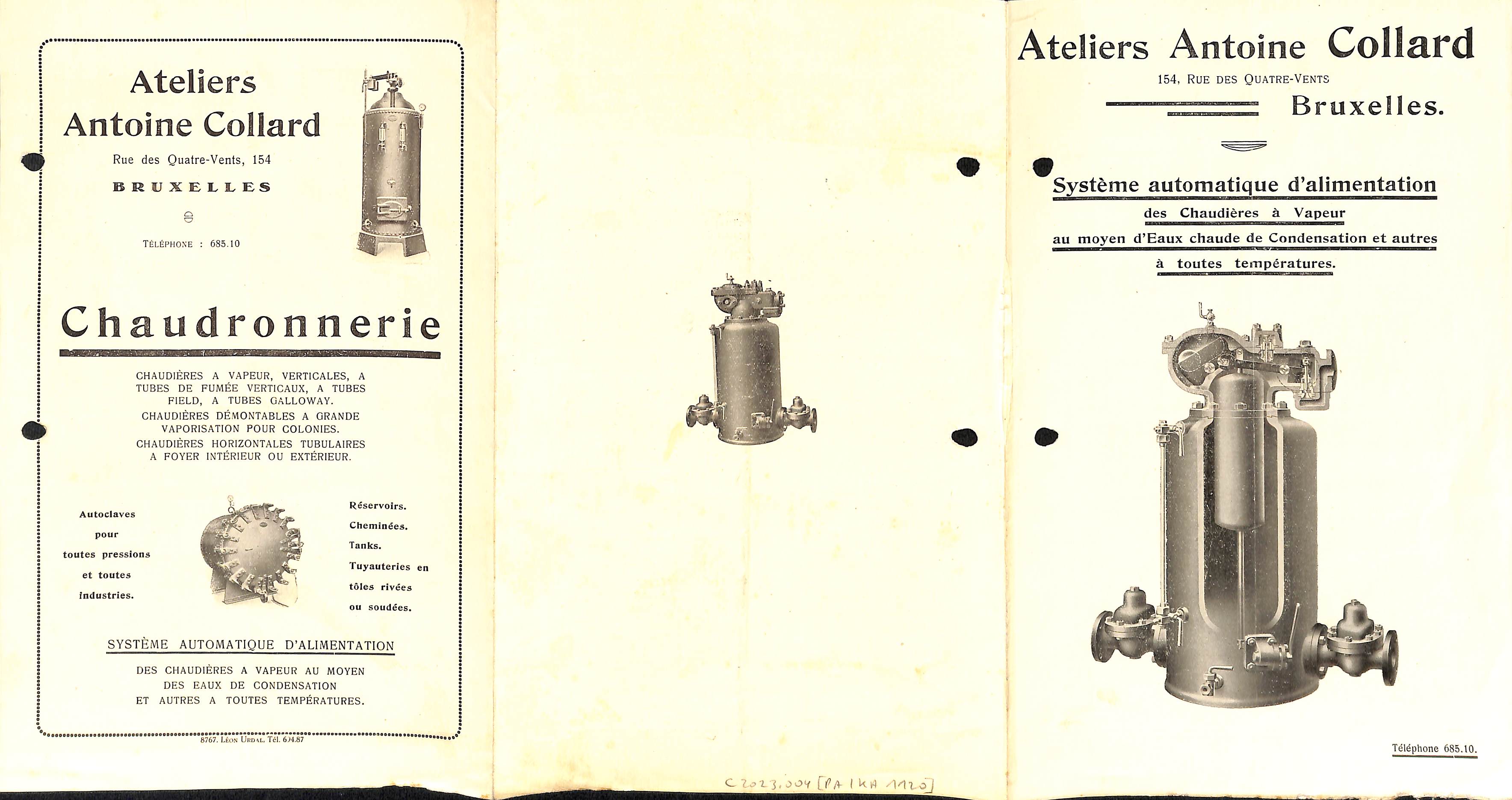 Dépliant Ateliers Antoine Collard, chaudronnerie, Rue des Quatre-Vents, 154 (Molenbeek-Saint-Jean), s.d. [années 1910-1920].