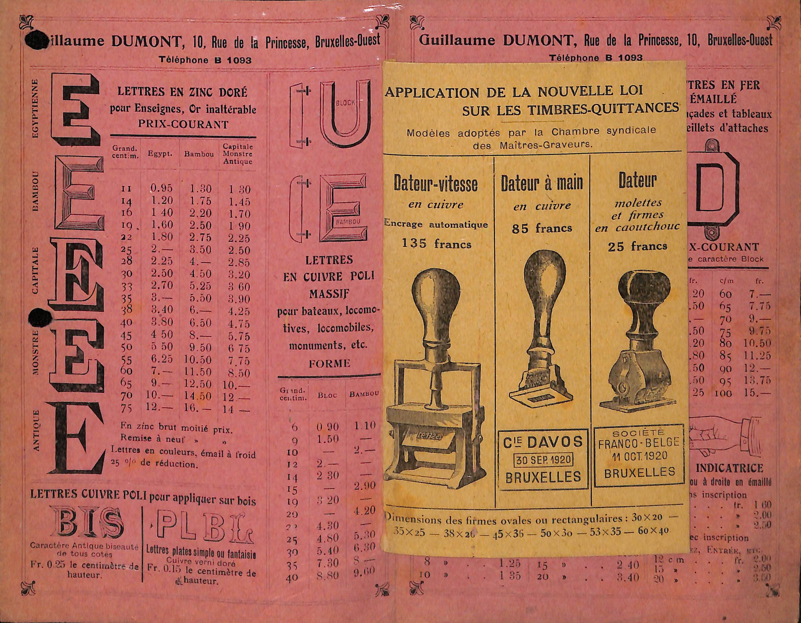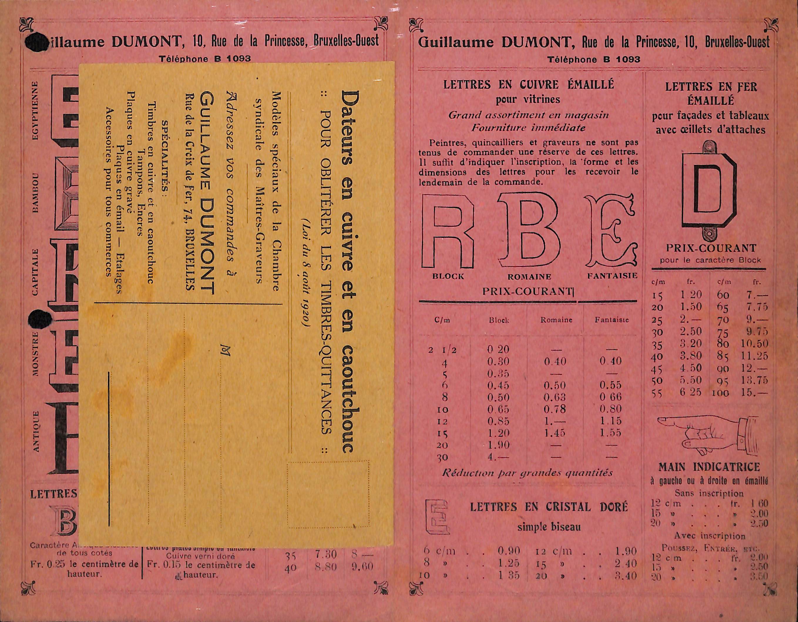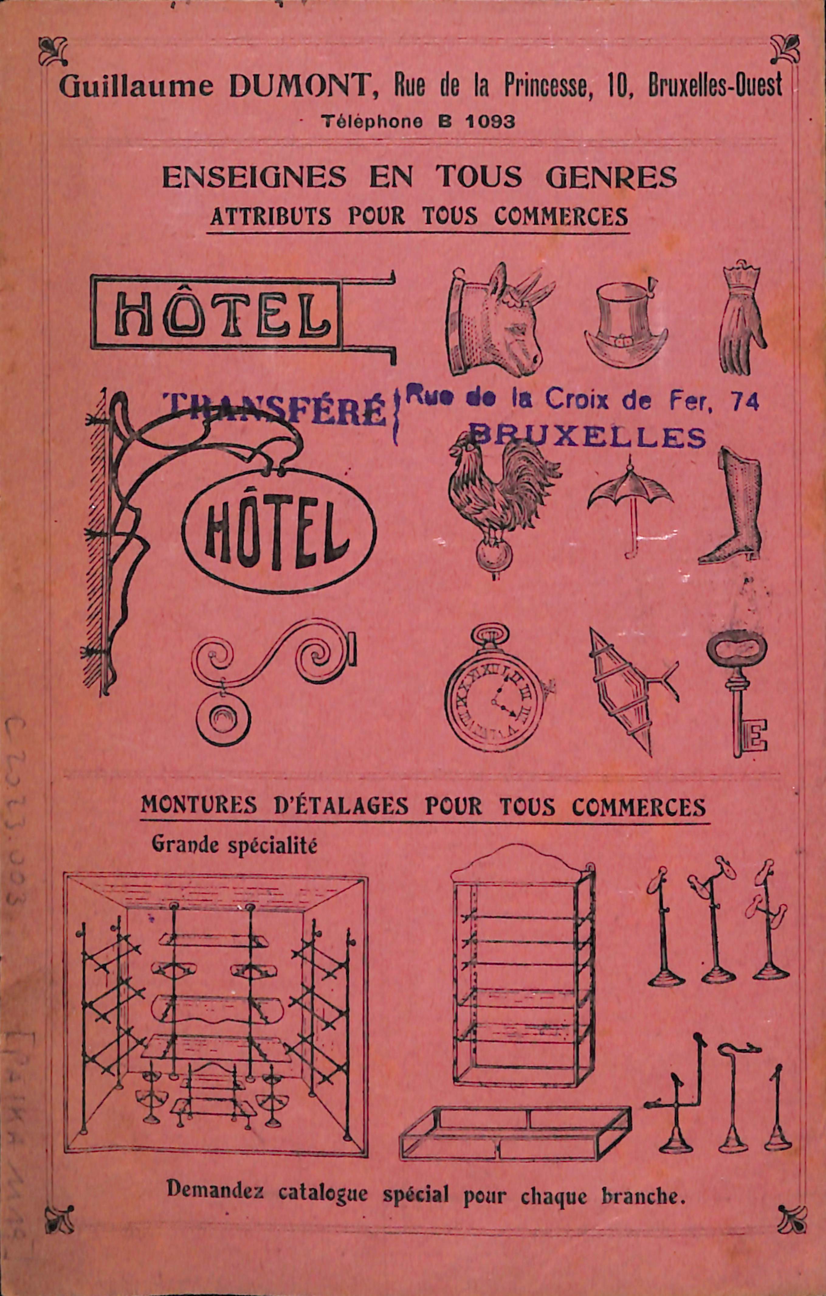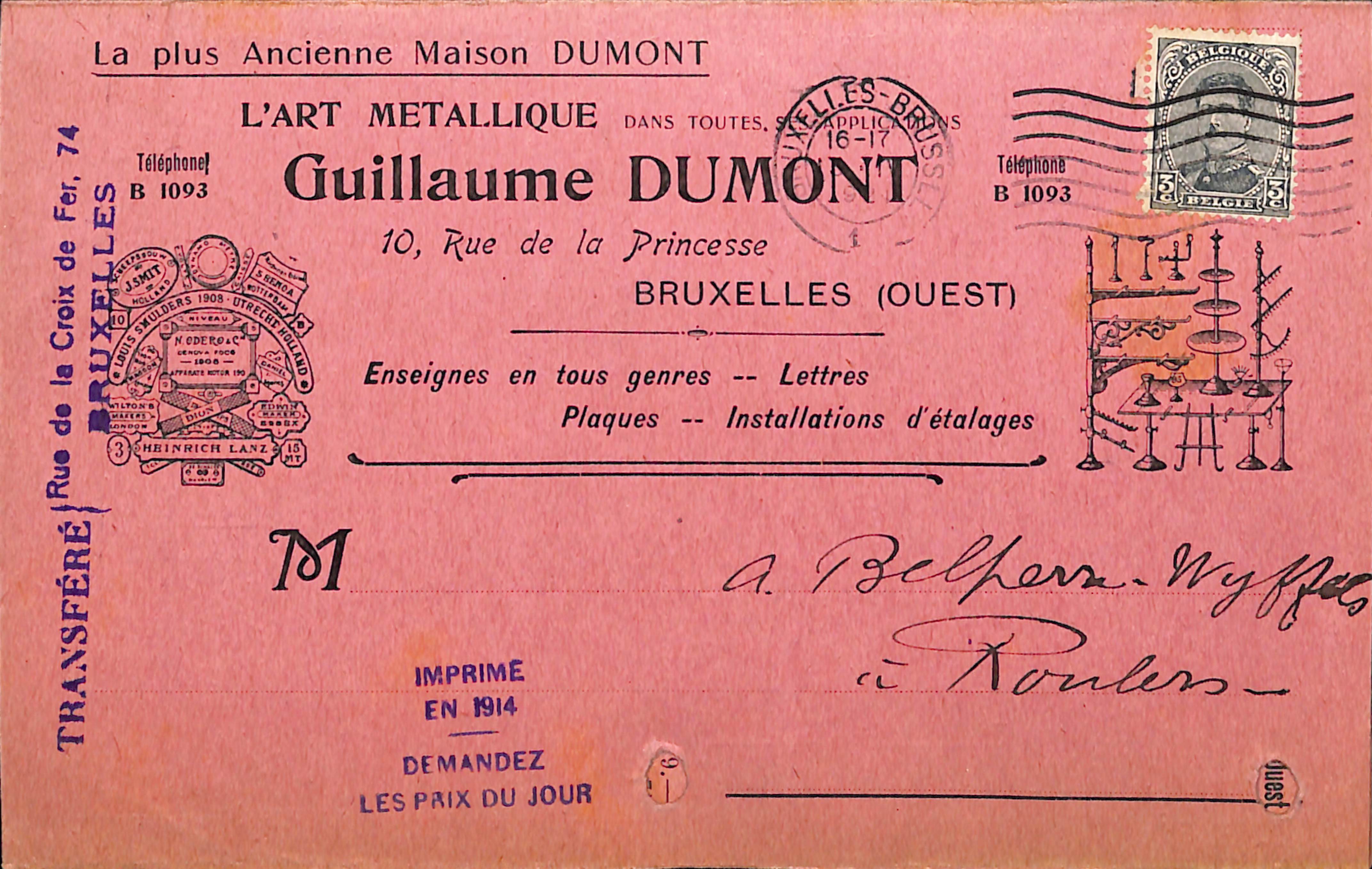 Carte postale commerciale Guillaume Dumont, L'Art métallique, Rue de la Princesse, 10 (Molenbeek-Saint-Jean), 1914.