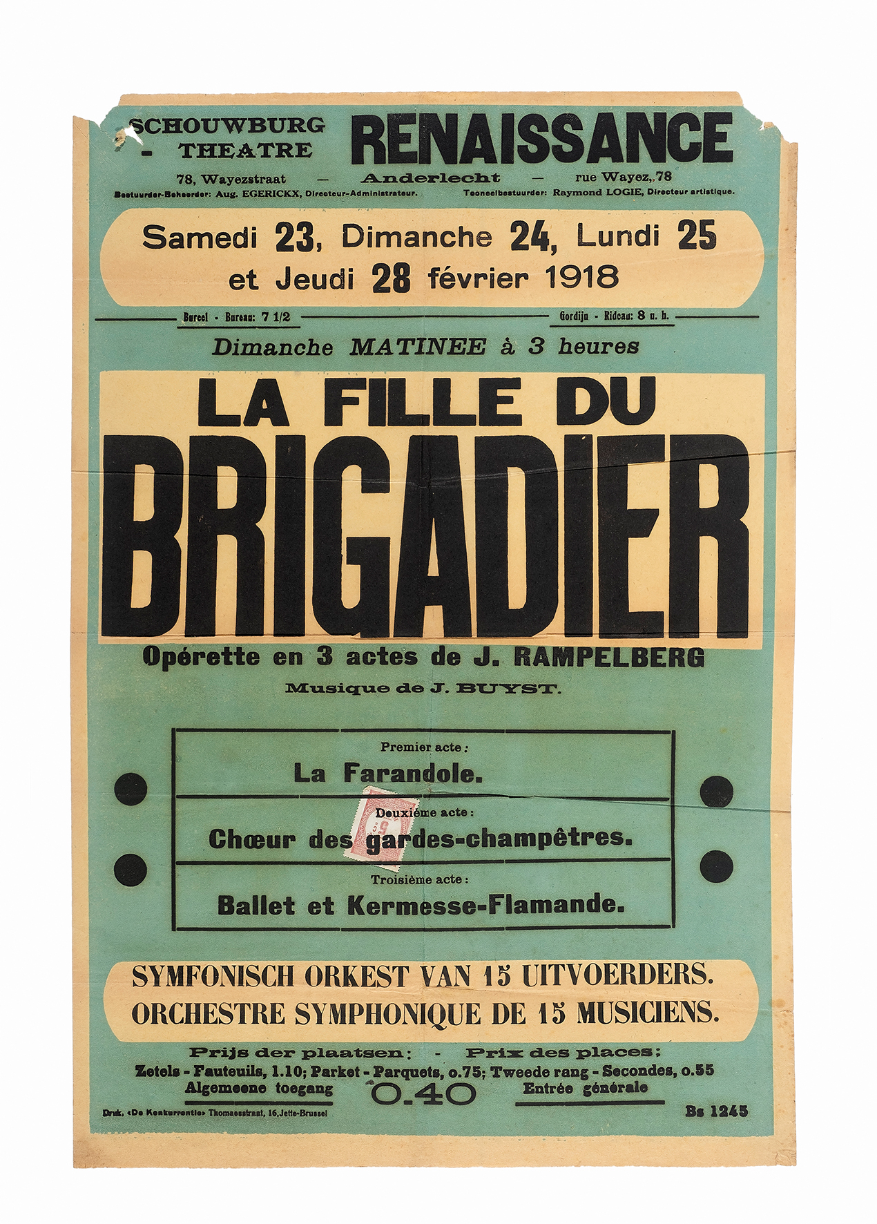 Affiche La fille du brigadier, opérette en trois actes par J[osse] Rampelberg, Théâtre Renaissance (Anderlecht), 1918.