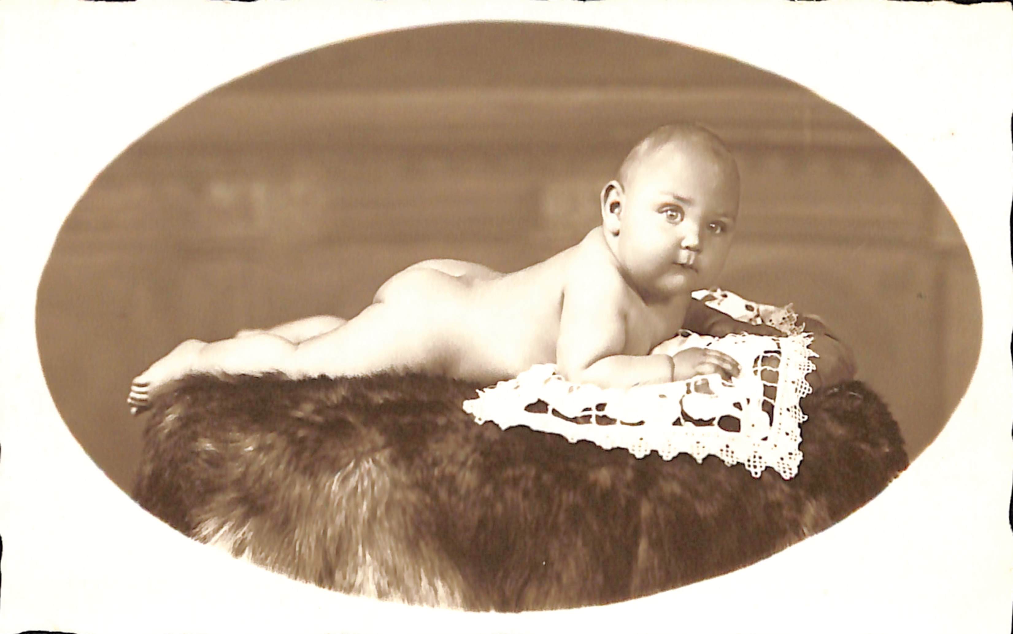 Carte photo Jeune enfant posant sur une fourrure, photogr. G. Mesmaeker (Molenbeek-Saint-Jean), s.d. [vers 1900].