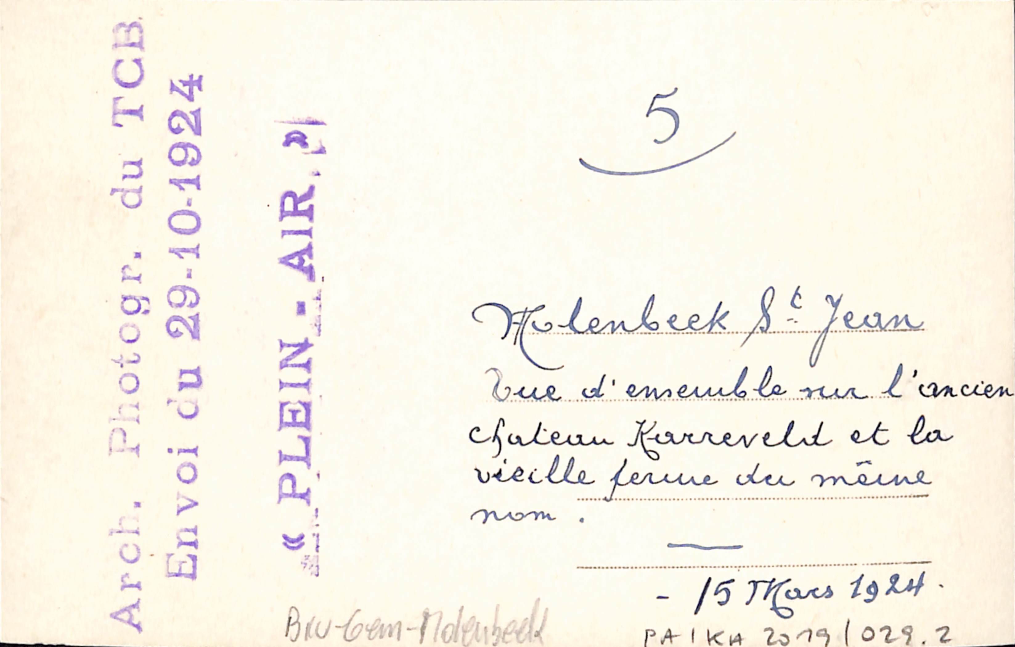 "Molenbeek St Jean / Vue d'ensemble sur l'ancien / chateau [sic !] Karreveld et la / vieille ferme du même / nom. / 15 Mars 1924 "