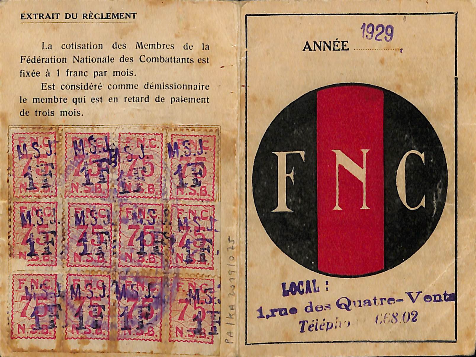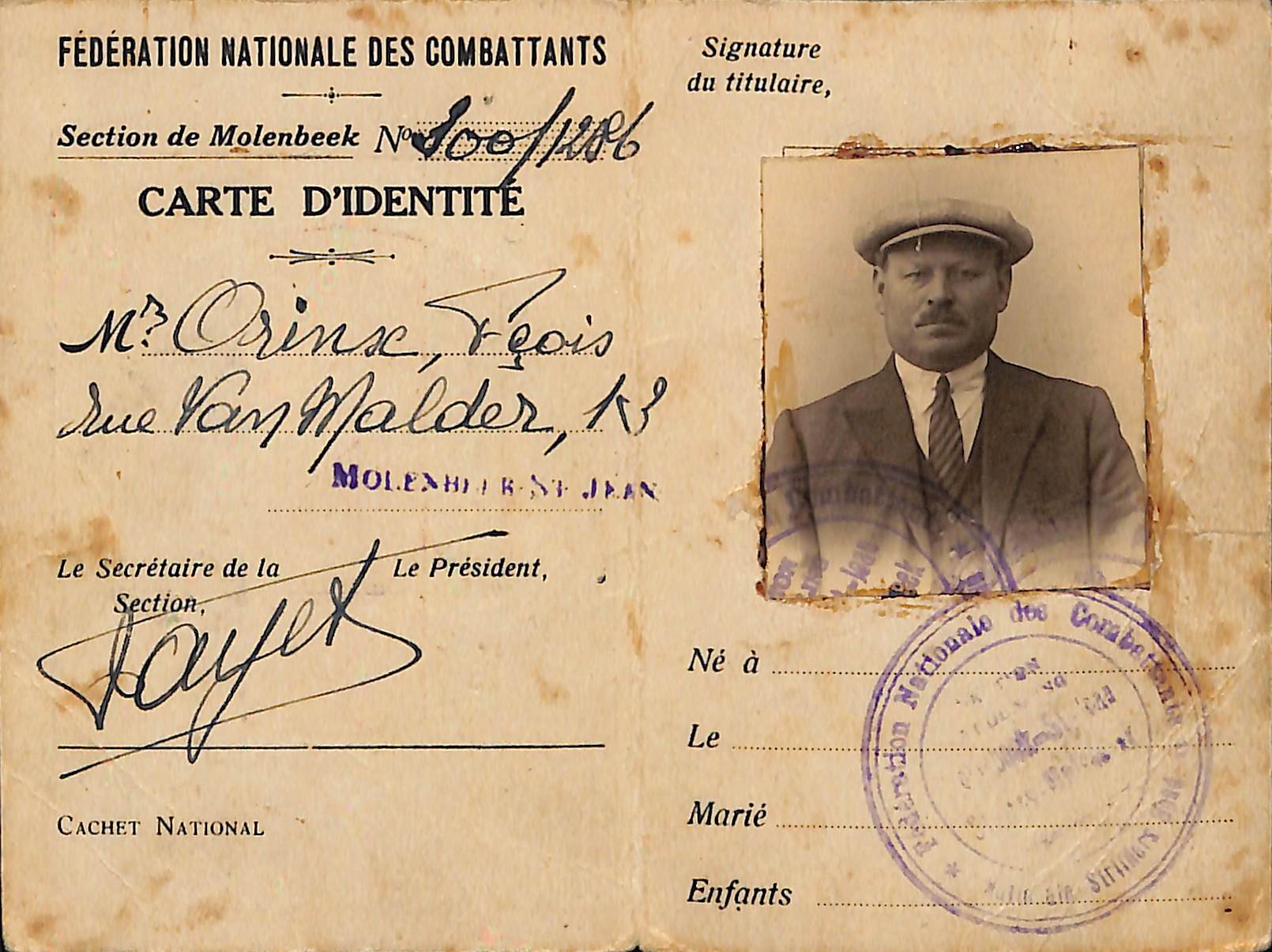 Carte de membre Fédération nationale des combattants François Orinx, Rue Van Malder, 1-3 (Molenbeek-Saint-Jean), 1929.