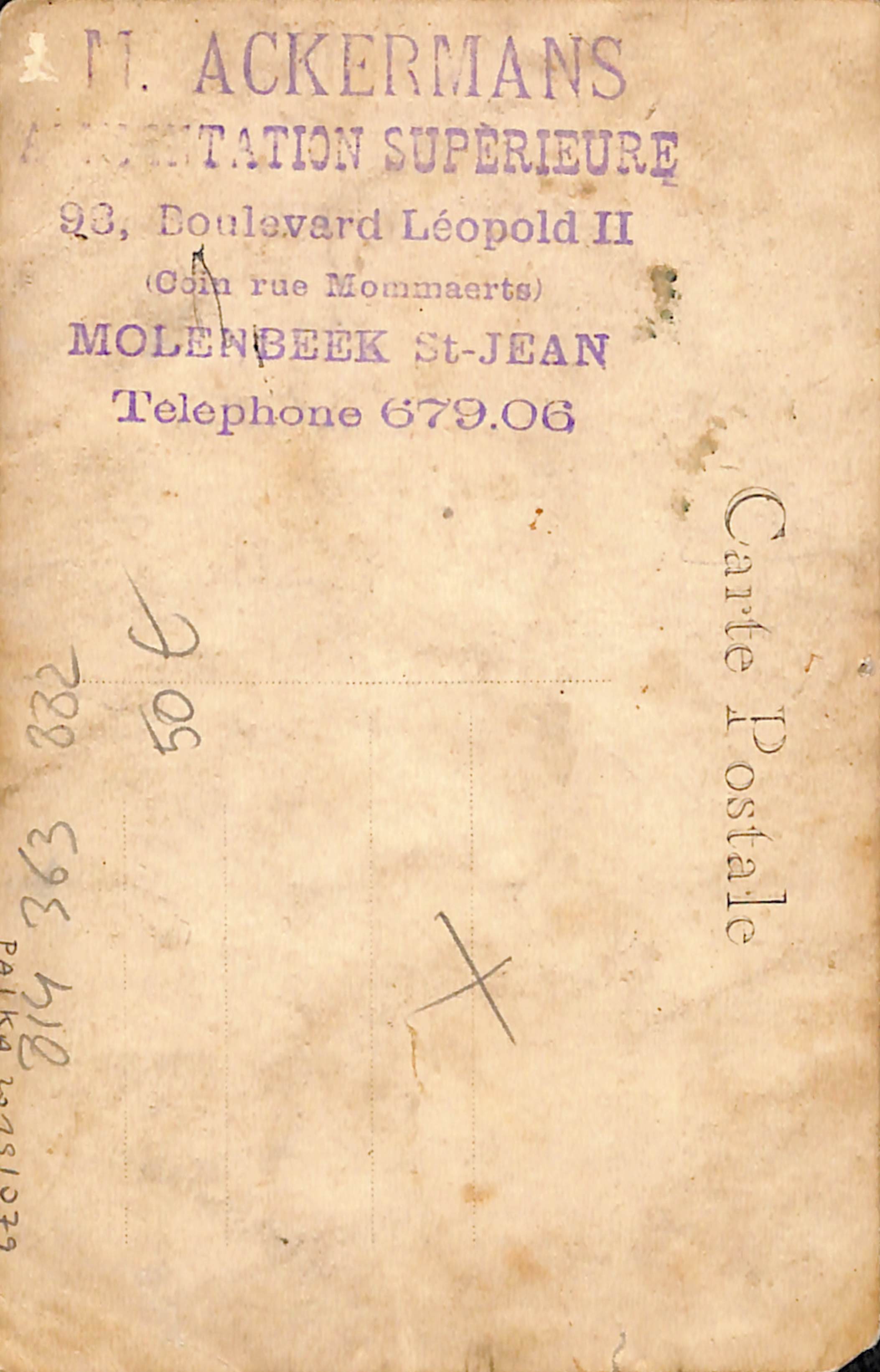 "M. Ackermans / Alimentation supérieure / 98, Boulevard Léopold II / (Coin rue Mommaerts) / Molenbeek St-Jean / Téléphone 679.06" (cachet au verso)