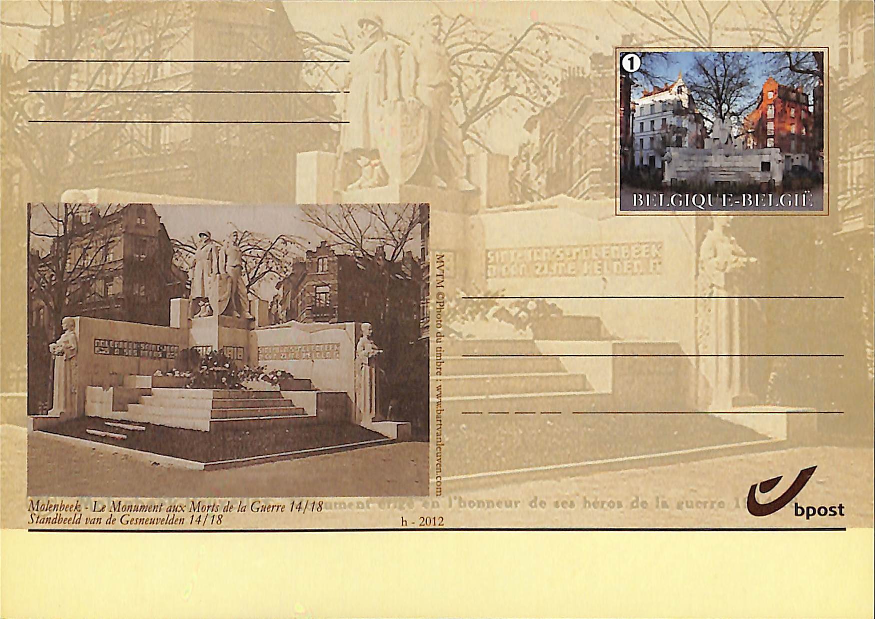 Carte-vue Monument aux morts de la Première Guerre mondiale, en 1925 et 2012, Square des Libérateurs (Molenbeek-Saint-Jean), éd. bpost, 2012.