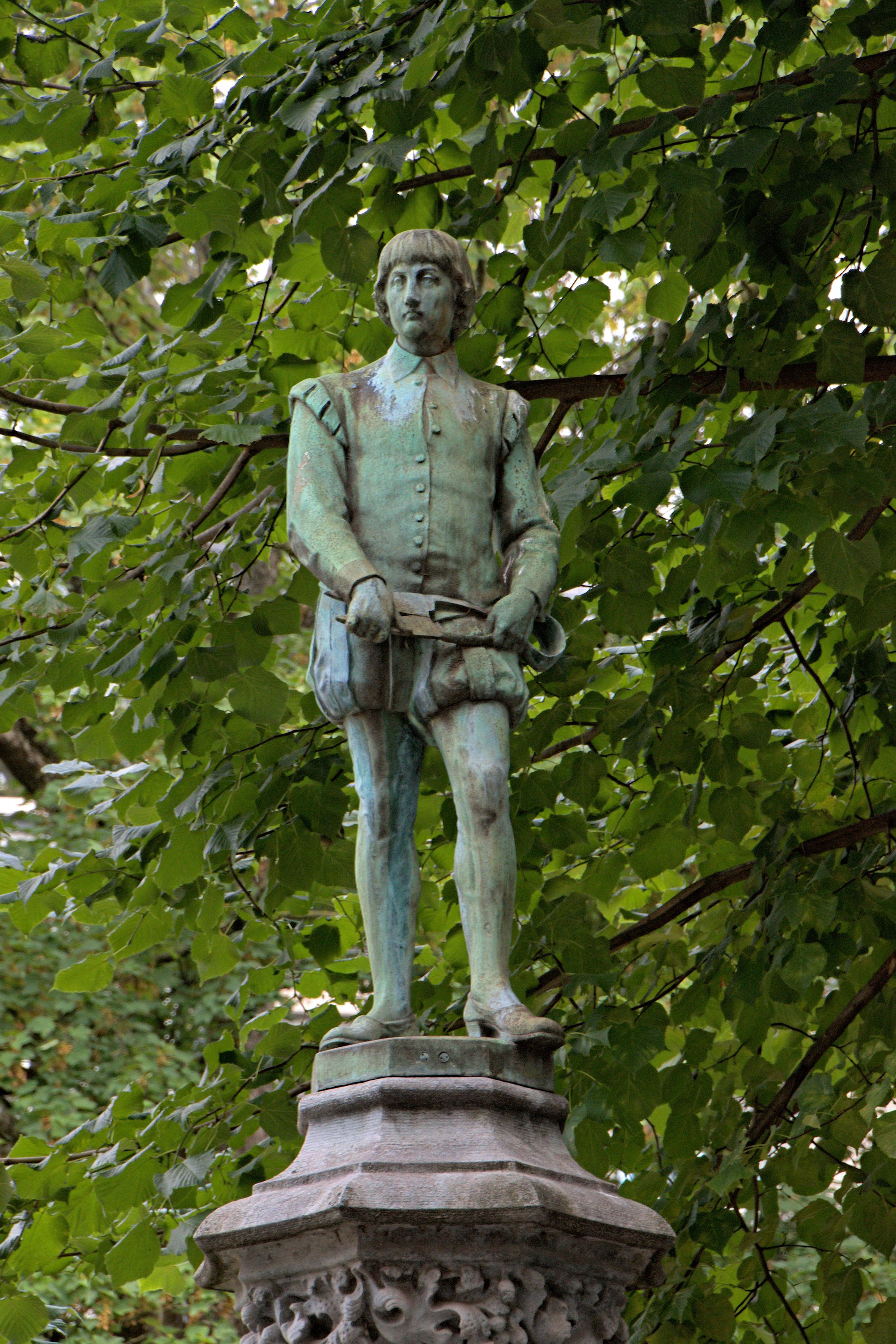 Cette statue de bronze fait partie des 48 statues qui ornent les colonnes gothiques de l'enceinte en fer forgé du Petit Sablon, chacune représentant une corporation bruxelloise du XVIe siècle. En 1880, 27 sculpteurs différents ont été sollicités pour réaliser les statues. Cependant, leur conception a été confiée à un seul artiste : Xavier Mellery. Mellery, peintre, dessinateur et illustrateur bruxellois, est considéré comme un précurseur du Symbolisme. Il est surtout connu pour ses peintures telles que L’églantier et La ronde des heures, toutes deux faisant partie de la collection Gillion Crowet.