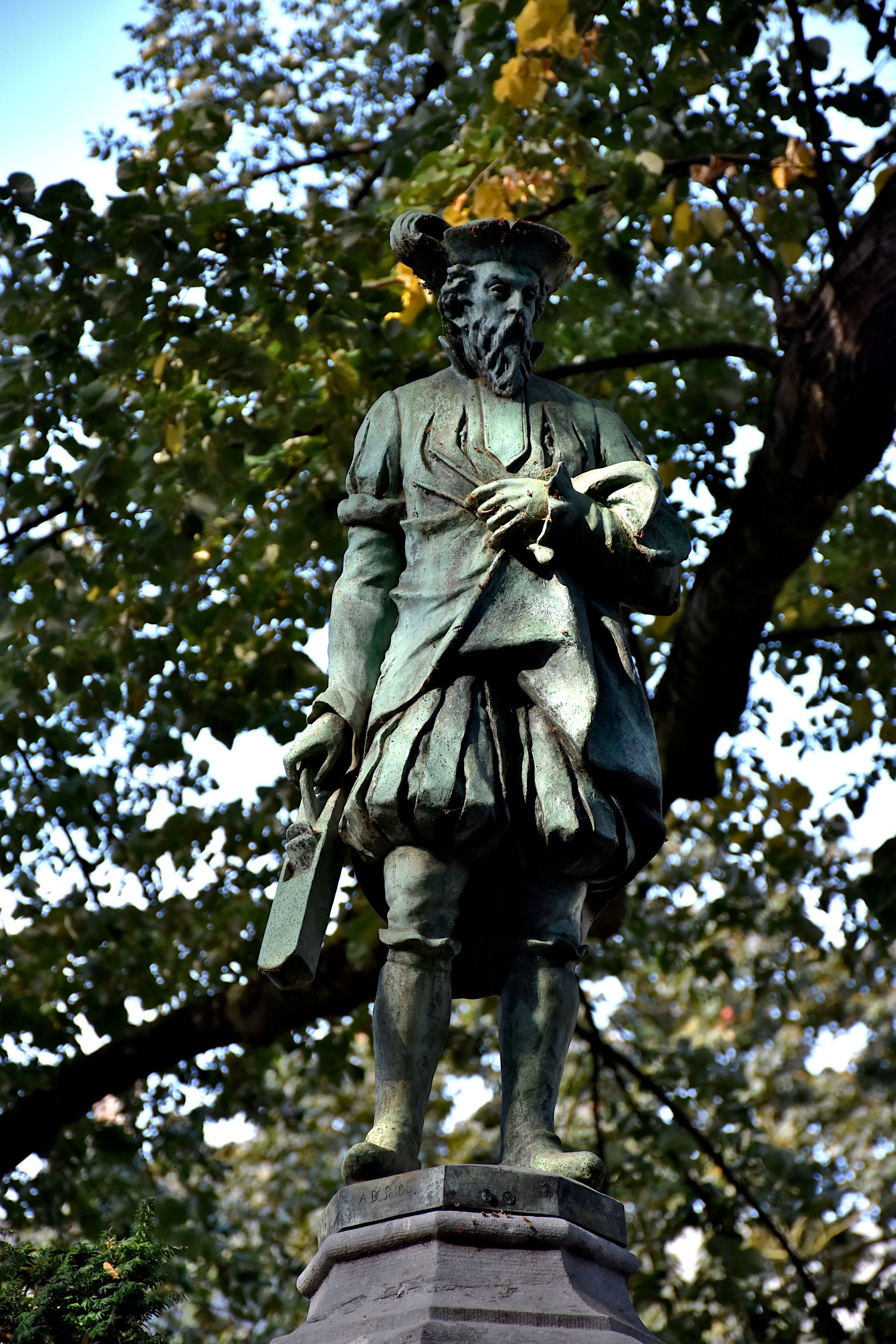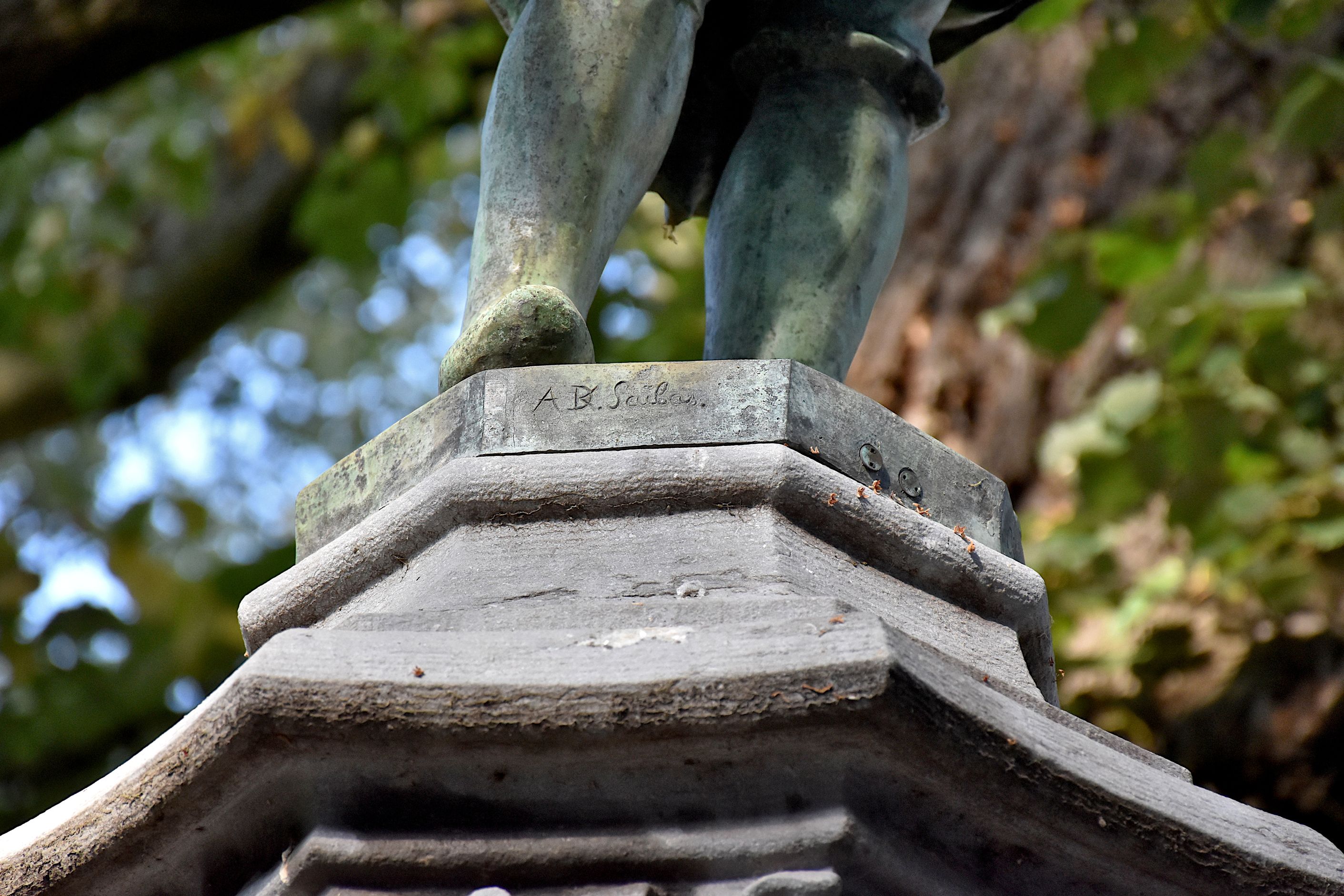 Cette statue a été réalisée par Augustin Van den Kerckhove et fondue par la Compagnie des Bronzes. Peintre et sculpteur belge, Van Den Kerckhove signait ses peintures de son propre nom, mais utilisait le pseudonyme Saïbas pour ses sculptures. Il a notamment réalisé l’une des douze statues en bronze doré pour la salle gothique de la Maison du Roi, ainsi qu’un buste de Léopold, duc de Brabant (1859-1869), qui fait partie de la collection des Musées royaux des Beaux-Arts de Belgique. (PIRON, P. op.cit.,Tome 2, p. 585.) Ici, l’artiste a représenté un artisan tenant un compas dans la main gauche, qu’il presse contre sa poitrine, et un rabot dans la main droite.