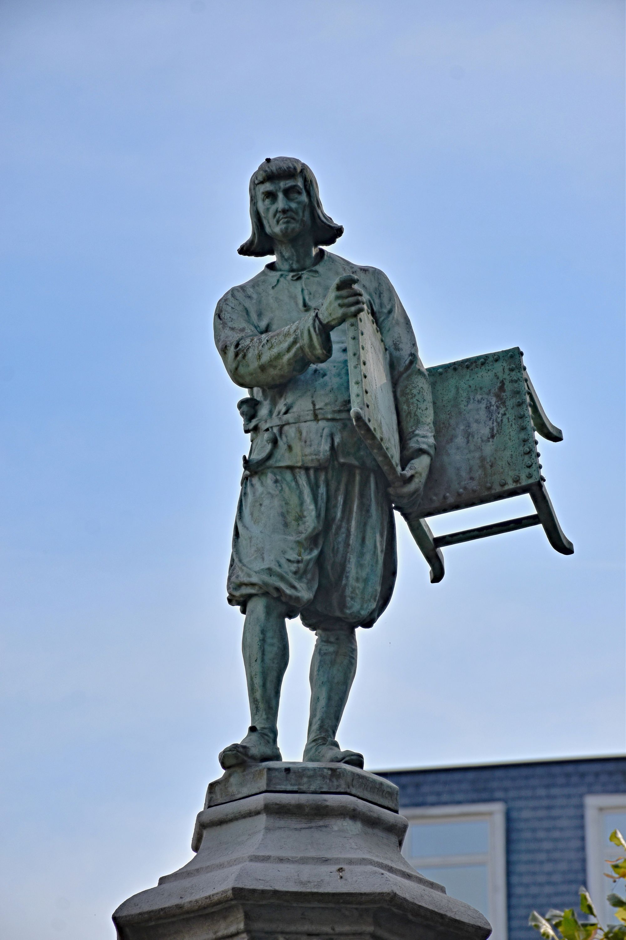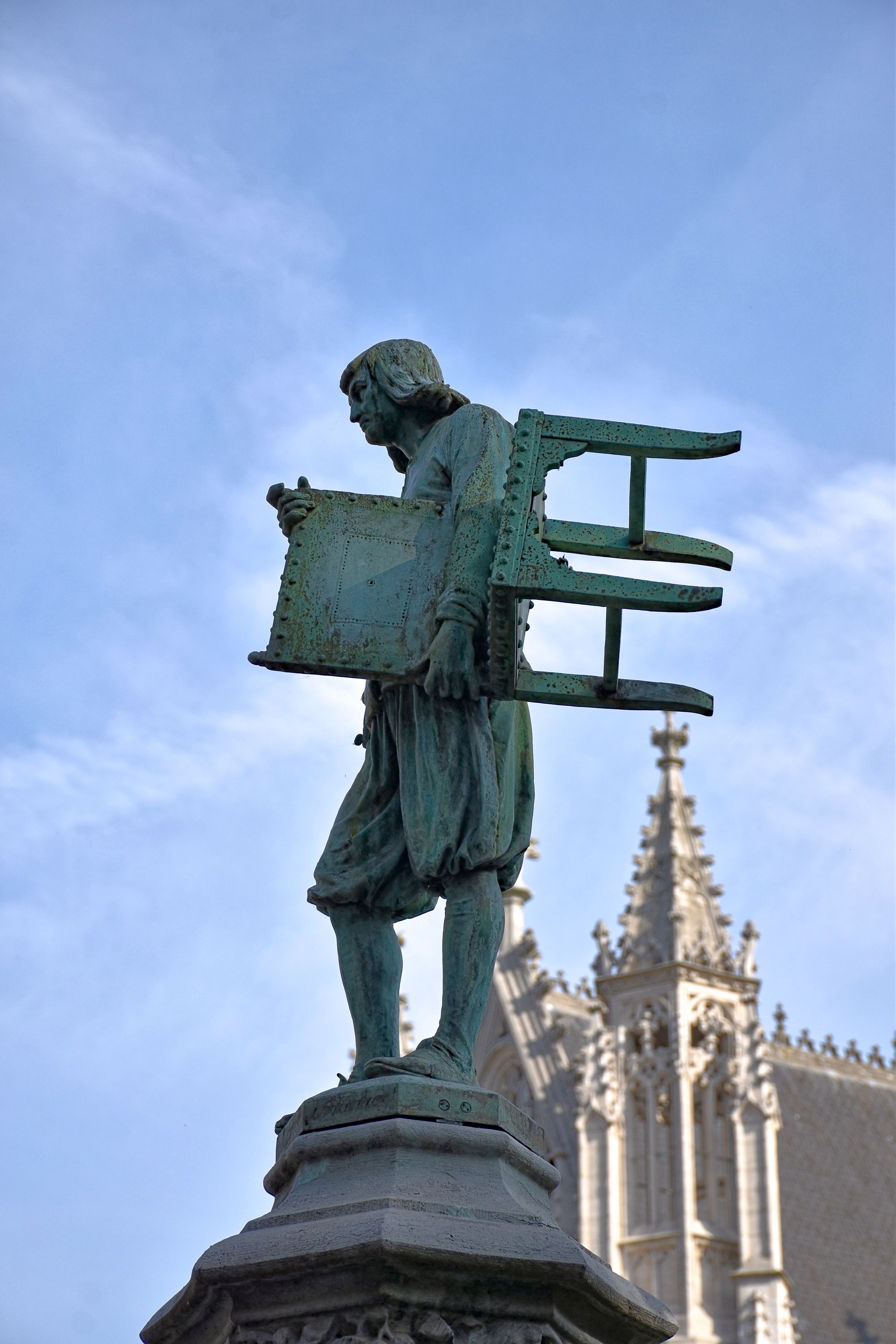 Cette statue a été réalisée par Jules Courroix et fondue par la Compagnie des Bronzes. Courroix (parfois appelé Courroit dans la littérature) était un sculpteur belge, notamment connu pour un buste de Jean Joseph Thonissen (1816-1891) qui est exposé au Het Stadsmus à Hasselt. L’artisan est représenté portant une perruque, tenant sous son bras gauche une chaise à assise en cuir. (PIRON, P., op.cit., Tome 1, p. 262.) Il porte à la ceinture une chignole et un peigne. Ces deux métiers, bien que très différents, ont pour point commun l’utilisation du crin de cheval. Toutefois, il est incertain que les perruquiers étaient déjà réunis en corporation au XVIe siècle.