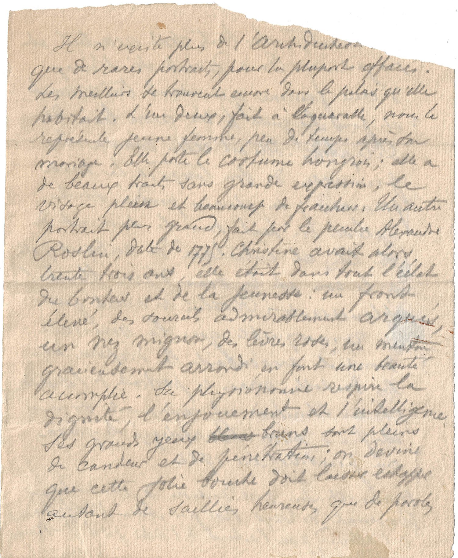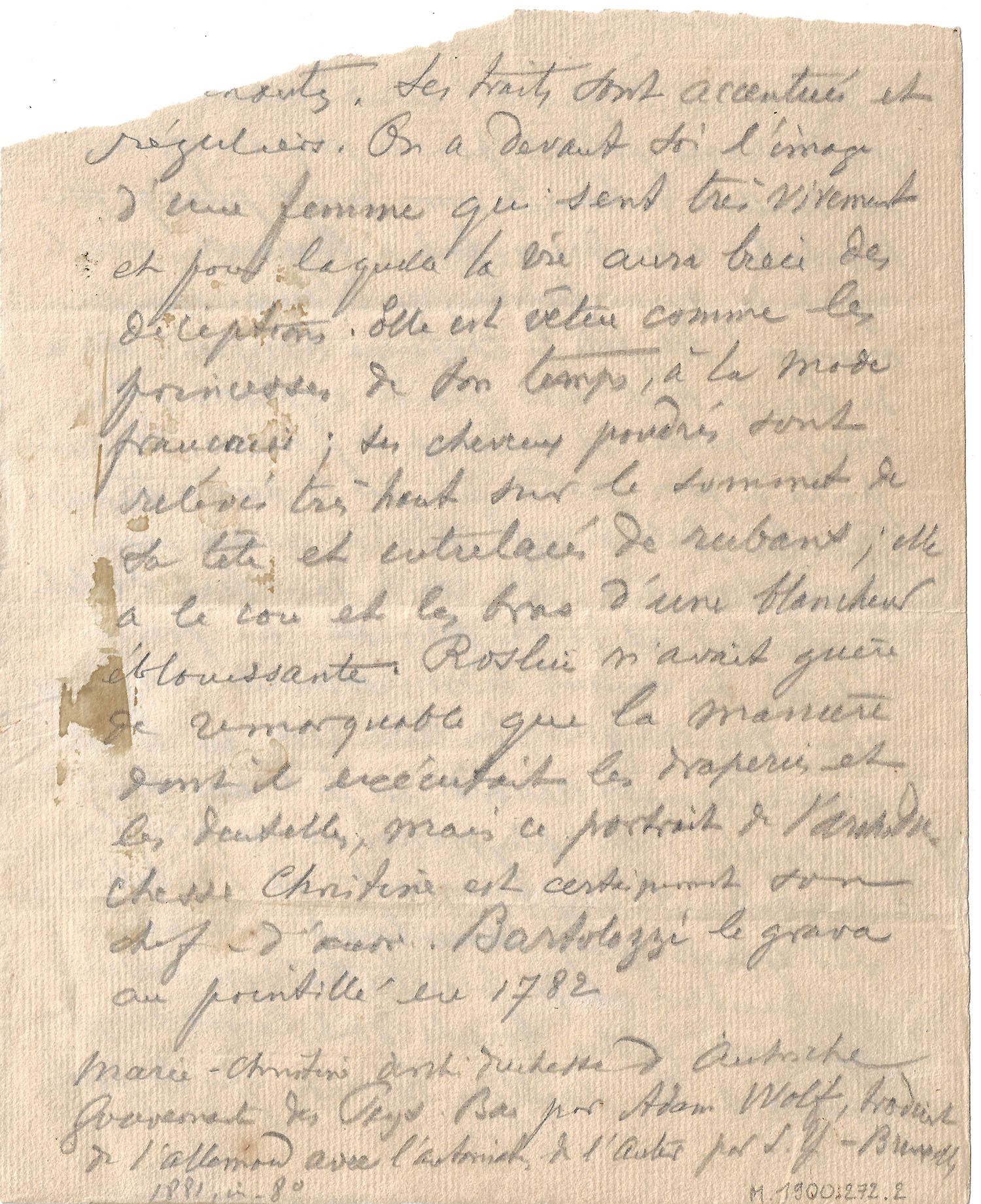 Tekstfragment over verschillende portretten van Maria Christina van Oostenrijk. De tekst bevat onder meer verwijzingen naar een vroege aquarel, een portret door Alexander Roslin uit 1775 en de prent die Bartolozzi in 1782 naar het portret van Roslin maakte (zie ook M.1950.1).