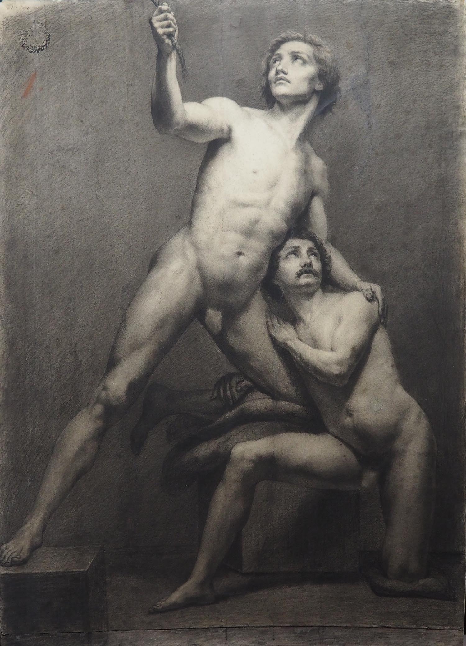 Naaktstudie van twee mannen. Eén van de mannen staat recht en trekt aan een koord. De andere zit er op één knie naast naast en houdt zich vast aan het bovenbeen van de staande man.