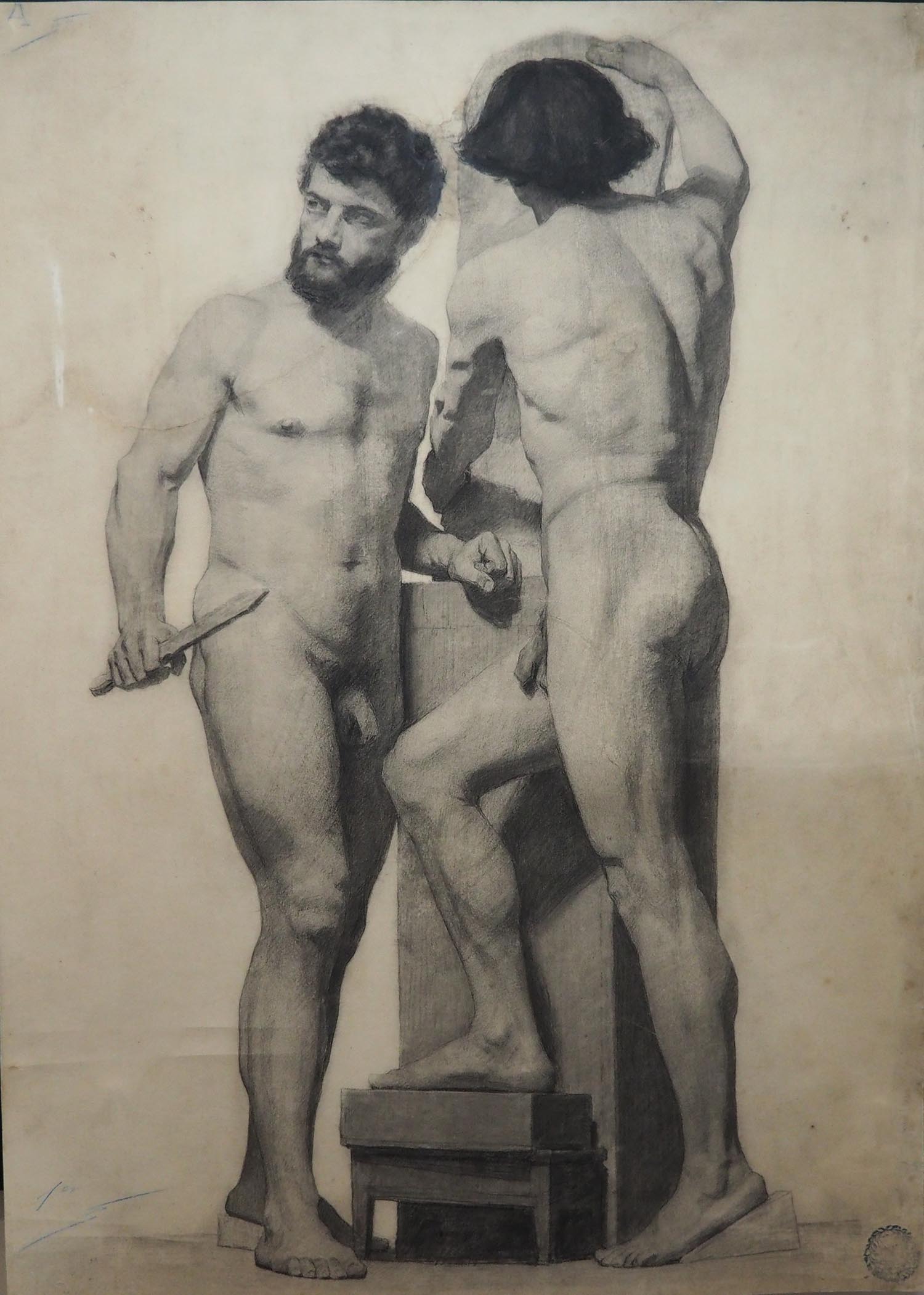 Naaktstudie van twee mannen. De ene man staat met de rug naar de toeschouwer en houdt met beide handen een steen vast op een sokkel. De andere rust met één hand op diezelfde sokkel en houdt in de andere een kort zwaard. Rémi Cogghe won met dit werk de eerste prijs voor modeltekenen aan de Koninklijke Academie voor Schone Kunsten te Brussel.