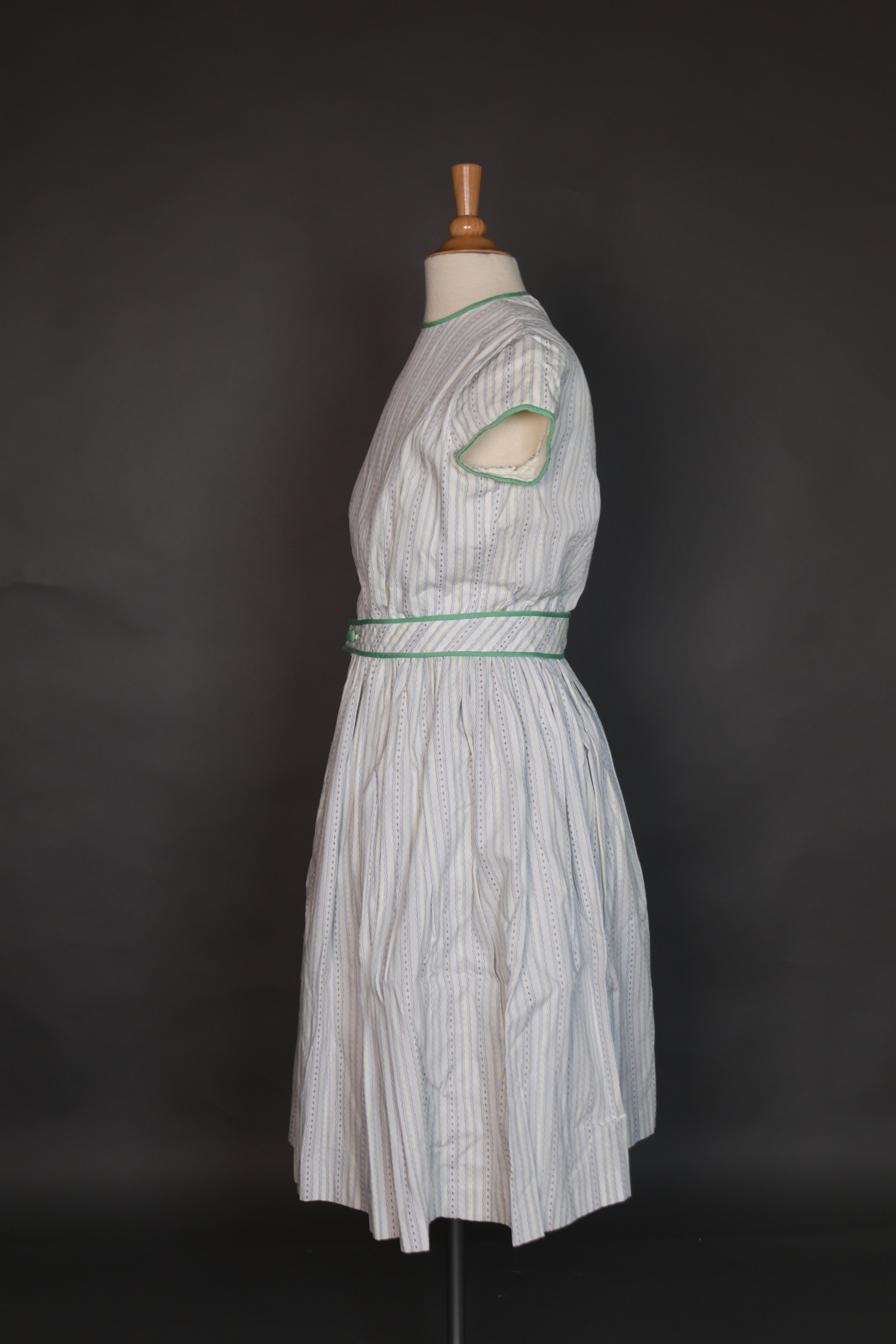 Ensemble korte jurk, katoenen platbinding, en gilet, katoenen gebreid, c. 1960.