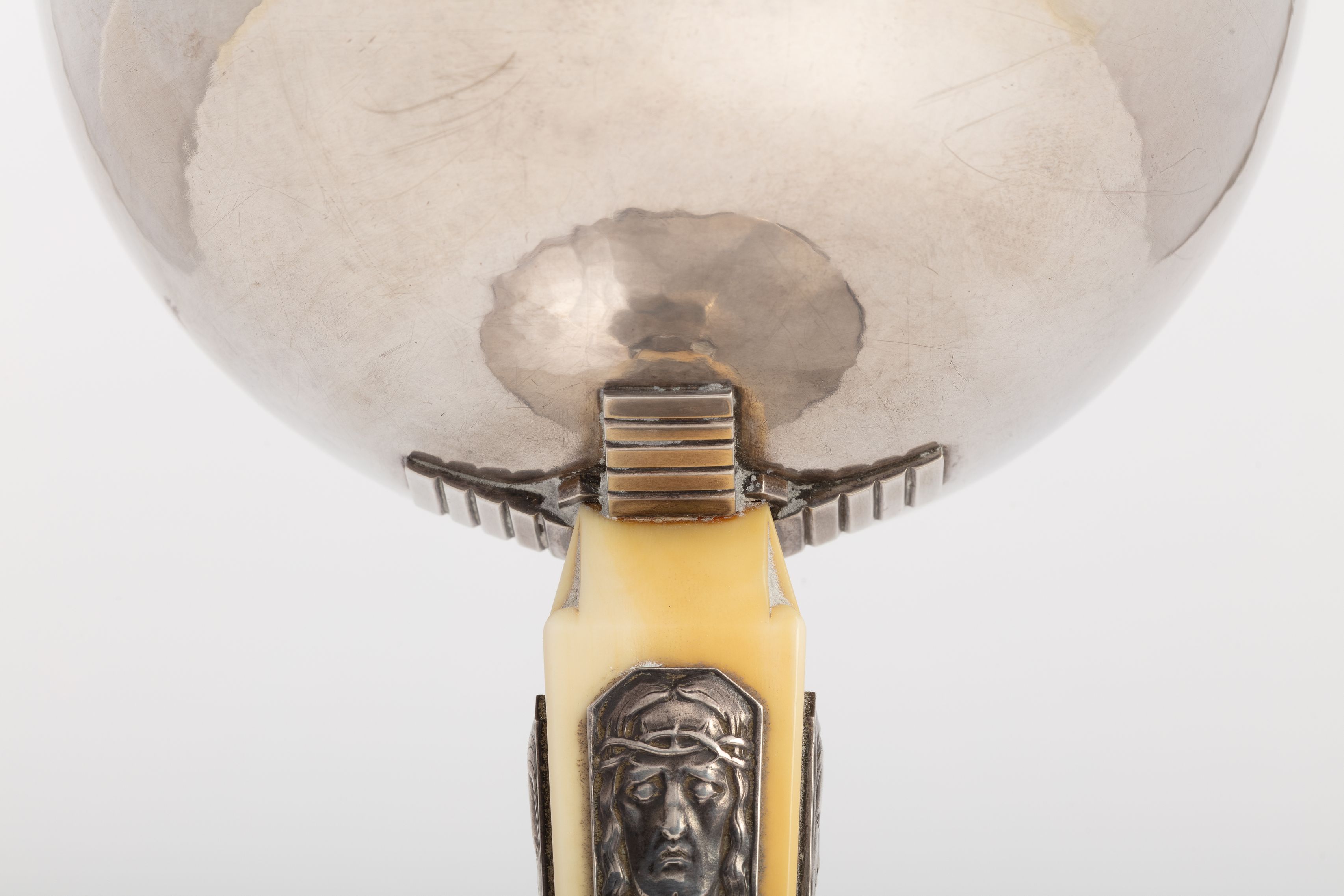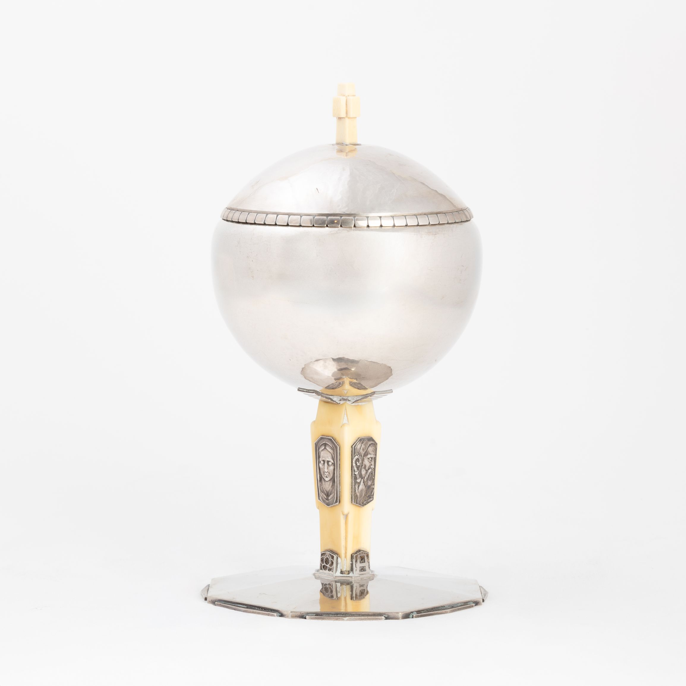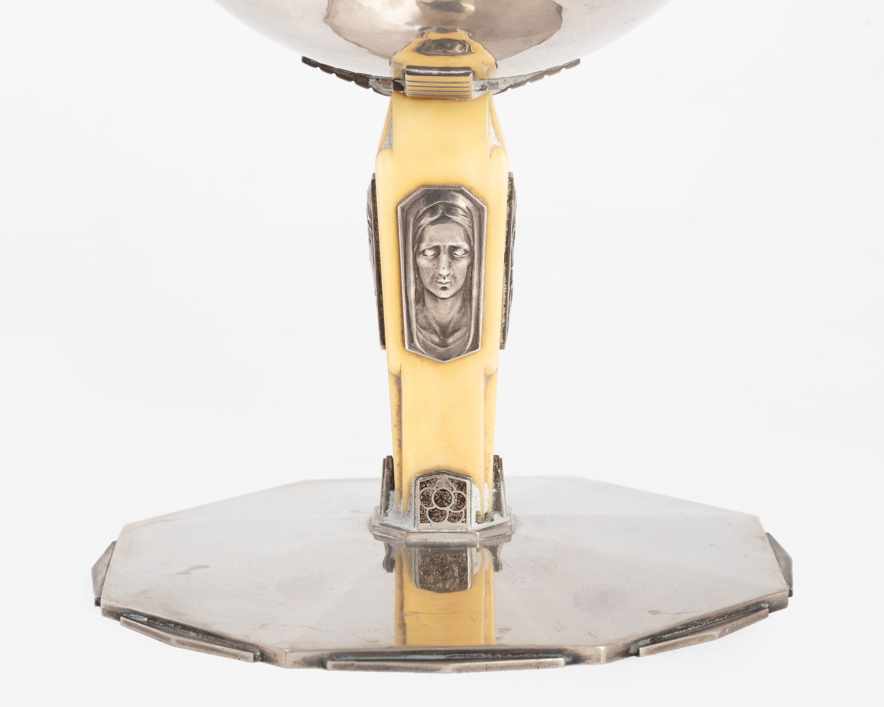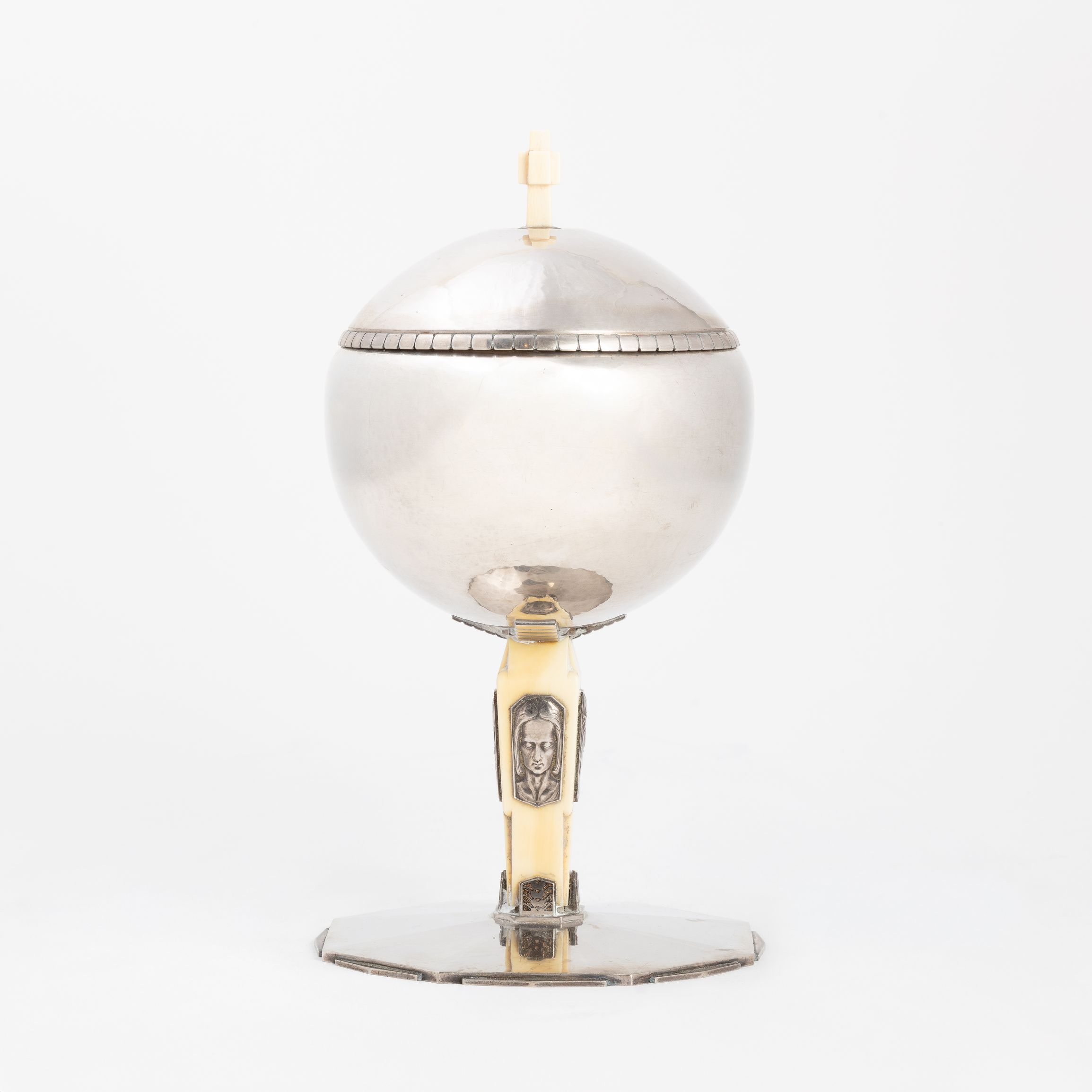Deze bolvormige ciborie, gemaakt door Henri-Joseph Holemans, lijkt op het eerste gezicht eenvoudig van vorm, maar getuigt niettemin van een bijzonder subtiele esthetische zoektocht. Zo worden de zijden van de zeshoekige voet geaccentueerd door uitstekende elementen en is de rand van het deksel versierd met vierkante motieven die in het metaal zijn aangebracht. Een ivoren kruis bekroont het geheel. De belangrijkste decoratieve elementen bevinden zich op de steel, die eveneens van ivoor is. Daarop zijn vier zilveren plaatjes aangebracht met reliëfgezichten, afkomstig uit het motievenrepertoire van de edelsmid en ook gebruikt op andere werken. Het gematigde gebruik van decoratieve elementen en de strakke, precieze lijnen maken de vormen bijzonder duidelijk, wat kenmerkend is voor de art-decostijl. Een inscriptie geeft aan dat het een schenking is van de zussen Simone en Lucienne (Lucette) Tschaggeny, ter nagedachtenis aan hun ouders, en maakt het mogelijk het object te dateren op 1955.