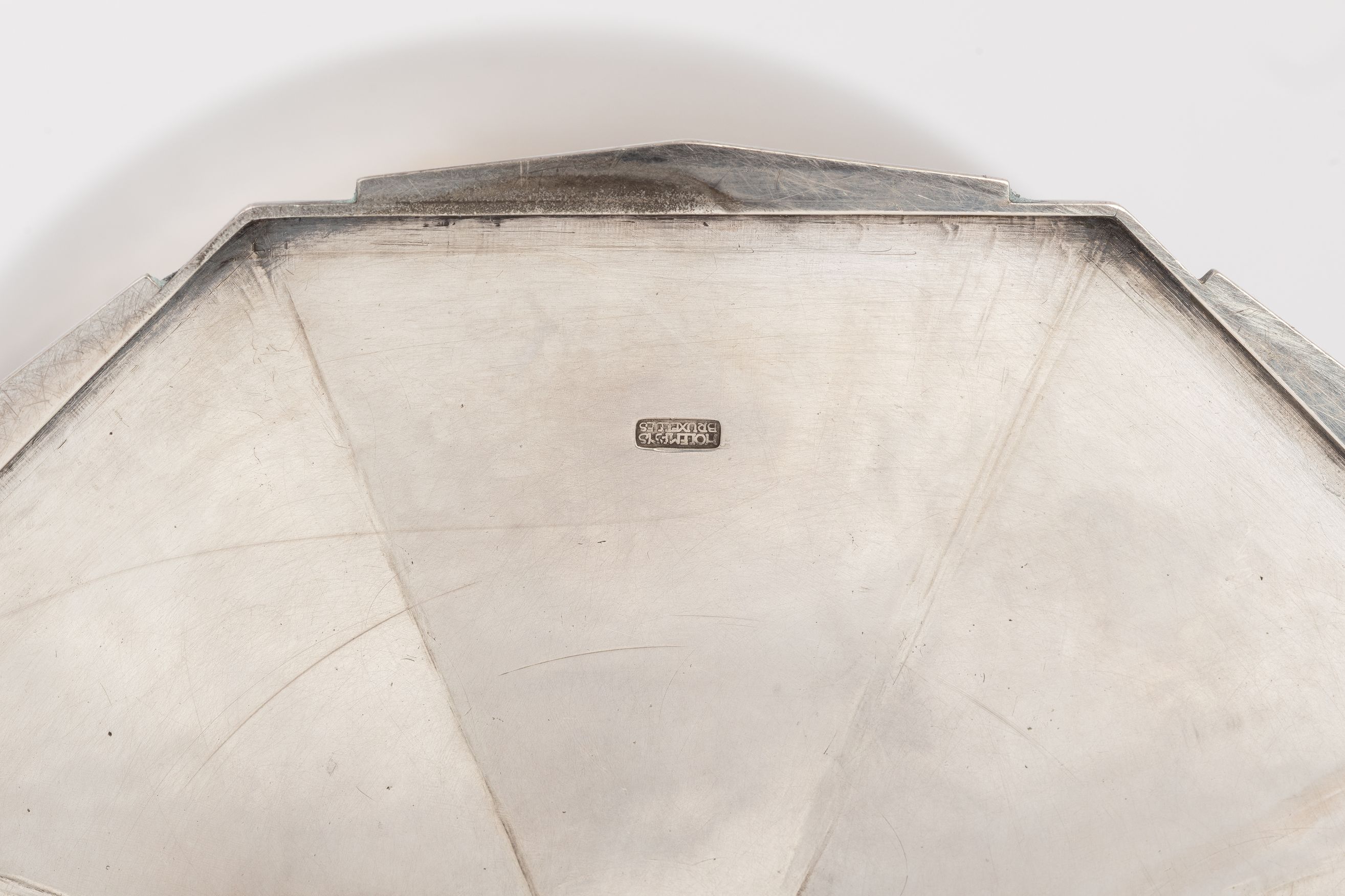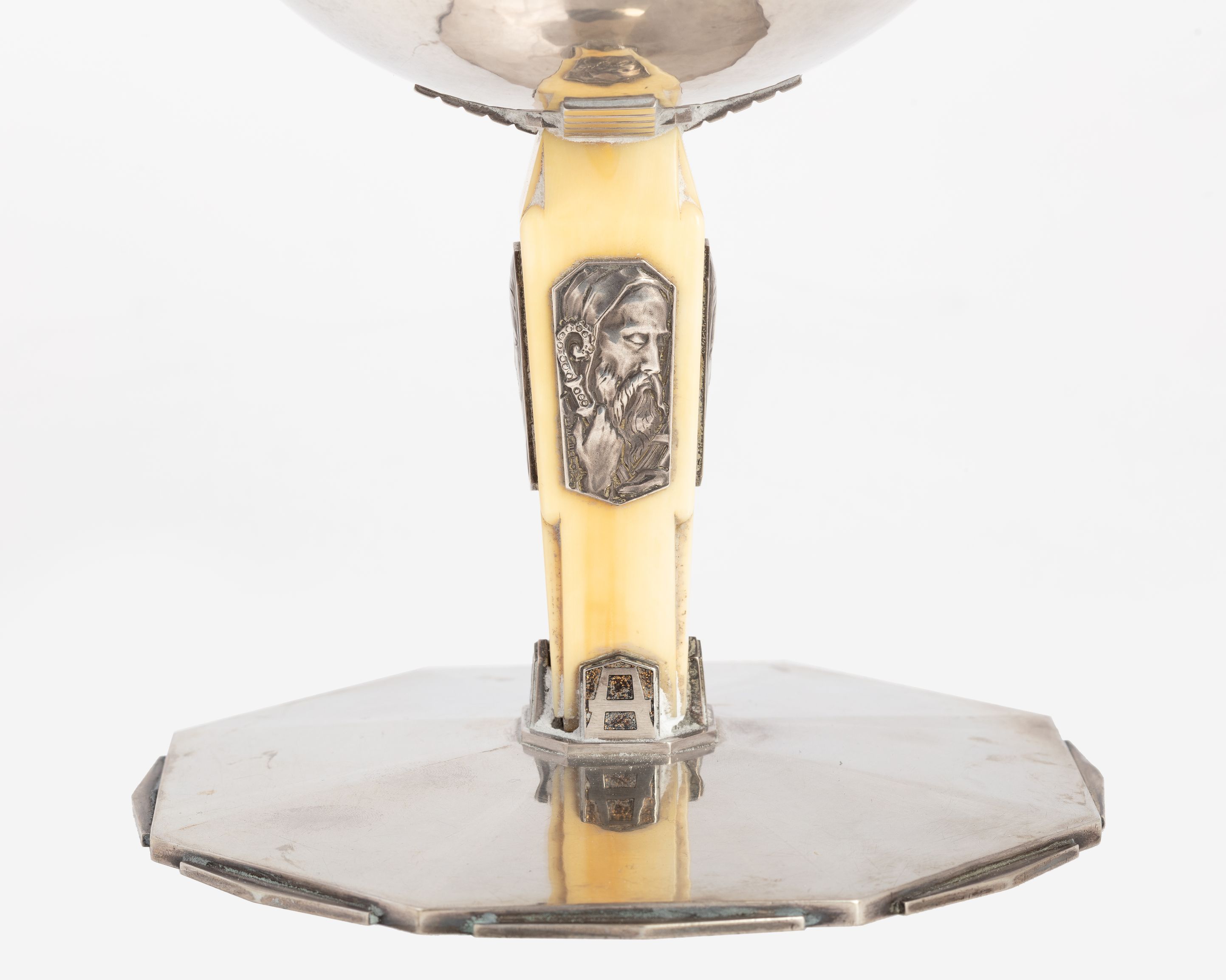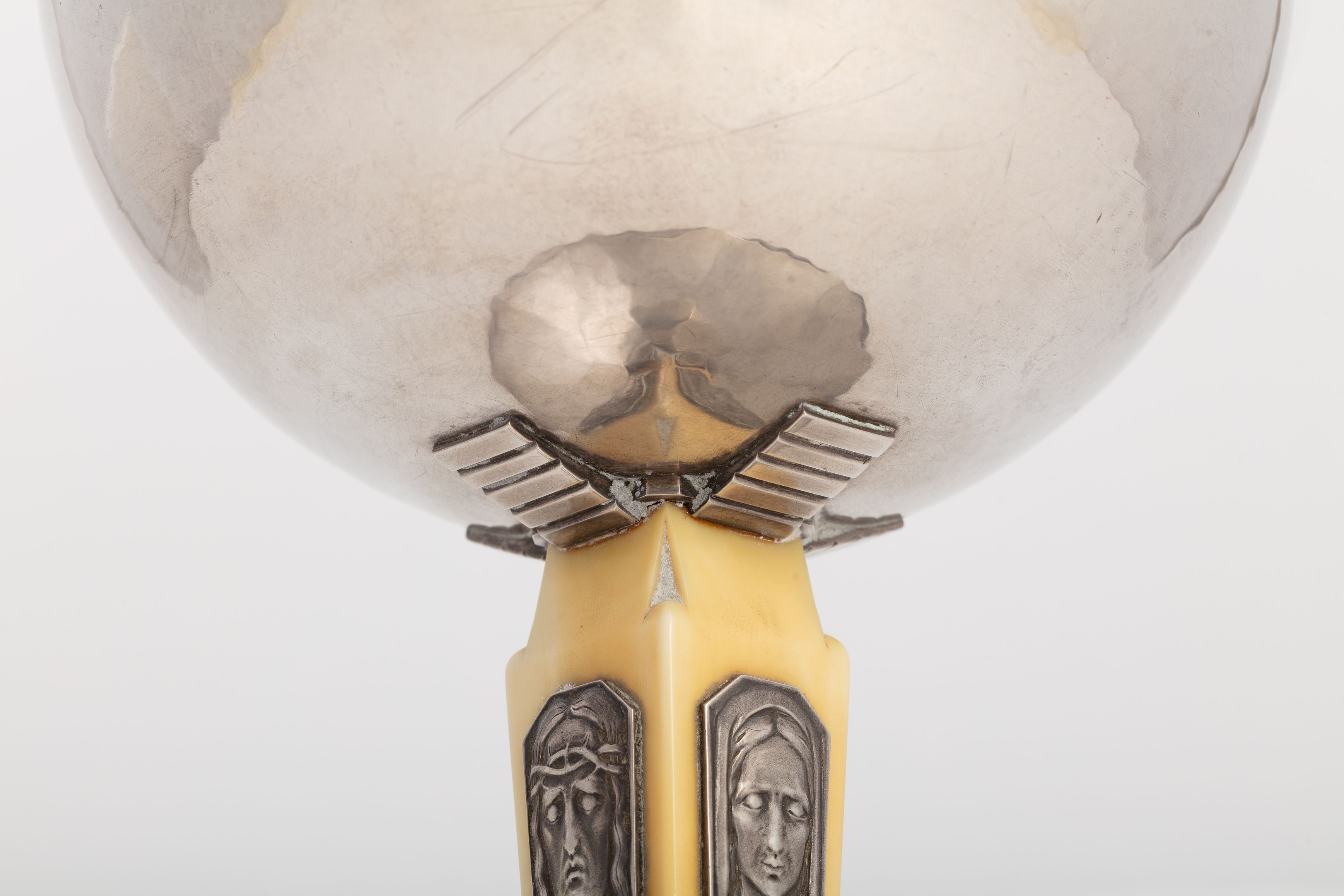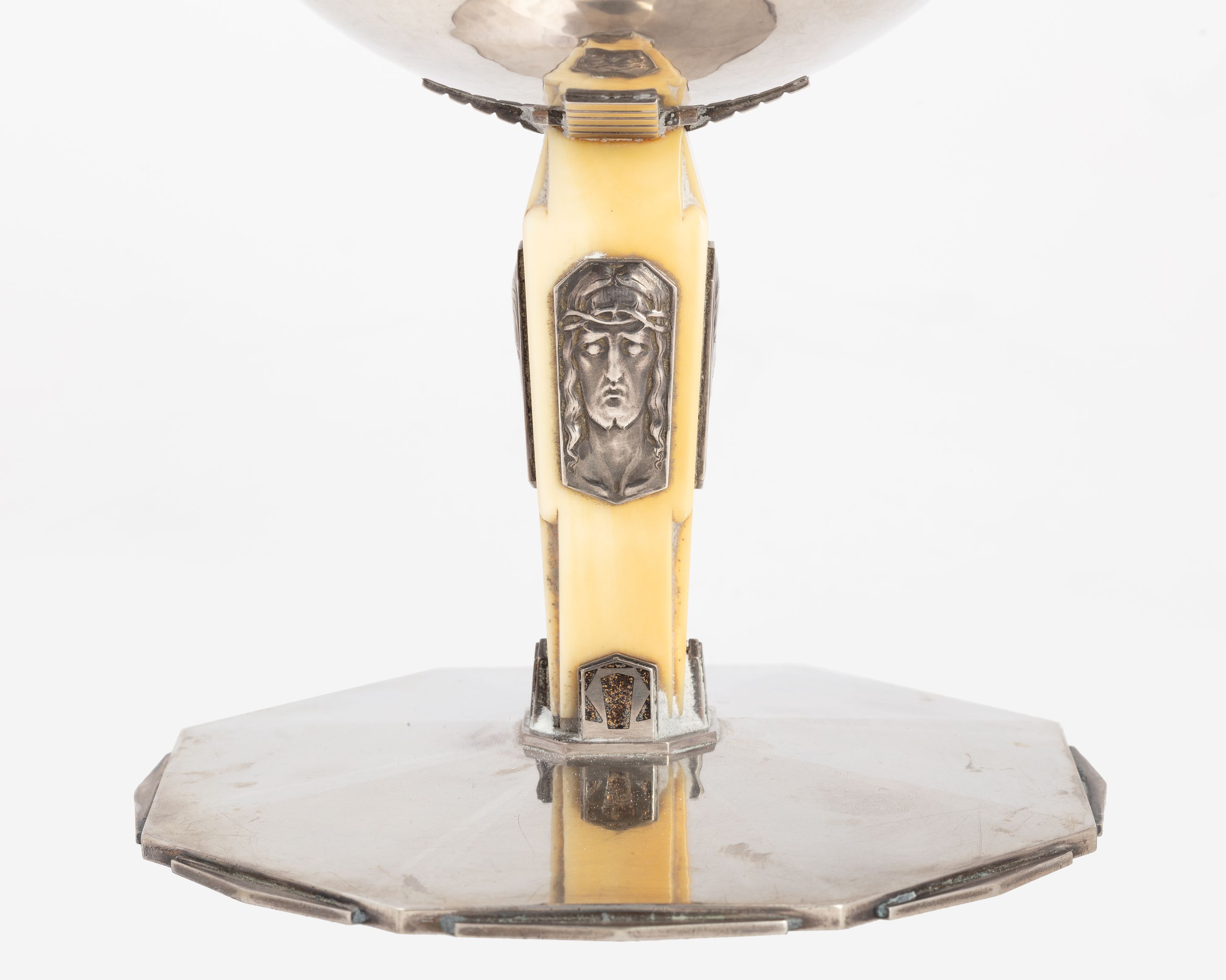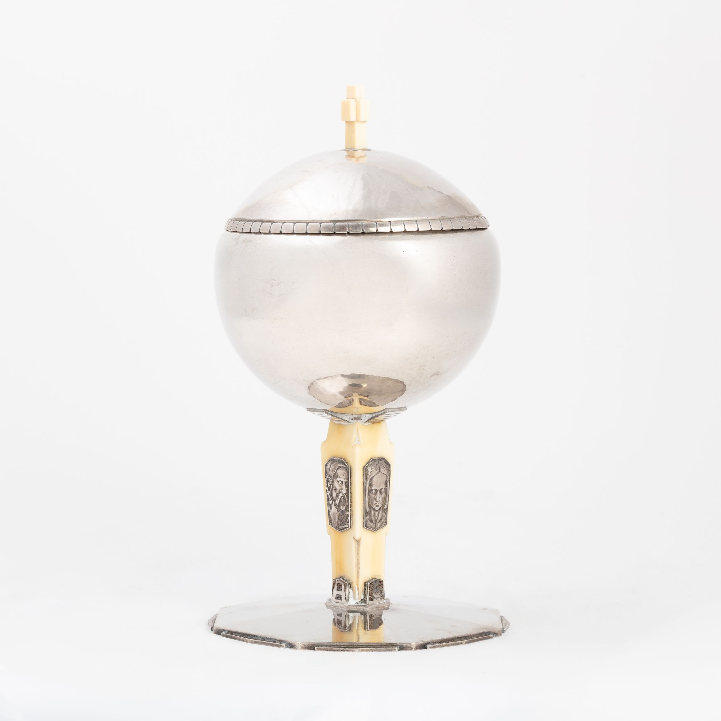 Deze bolvormige ciborie, gemaakt door Henri-Joseph Holemans, lijkt op het eerste gezicht eenvoudig van vorm, maar getuigt niettemin van een bijzonder subtiele esthetische zoektocht. Zo worden de zijden van de zeshoekige voet geaccentueerd door uitstekende elementen en is de rand van het deksel versierd met vierkante motieven die in het metaal zijn aangebracht. Een ivoren kruis bekroont het geheel. De belangrijkste decoratieve elementen bevinden zich op de steel, die eveneens van ivoor is. Daarop zijn vier zilveren plaatjes aangebracht met reliëfgezichten, afkomstig uit het motievenrepertoire van de edelsmid en ook gebruikt op andere werken. Het gematigde gebruik van decoratieve elementen en de strakke, precieze lijnen maken de vormen bijzonder duidelijk, wat kenmerkend is voor de art-decostijl. Een inscriptie geeft aan dat het een schenking is van de zussen Simone en Lucienne (Lucette) Tschaggeny, ter nagedachtenis aan hun ouders, en maakt het mogelijk het object te dateren op 1955.