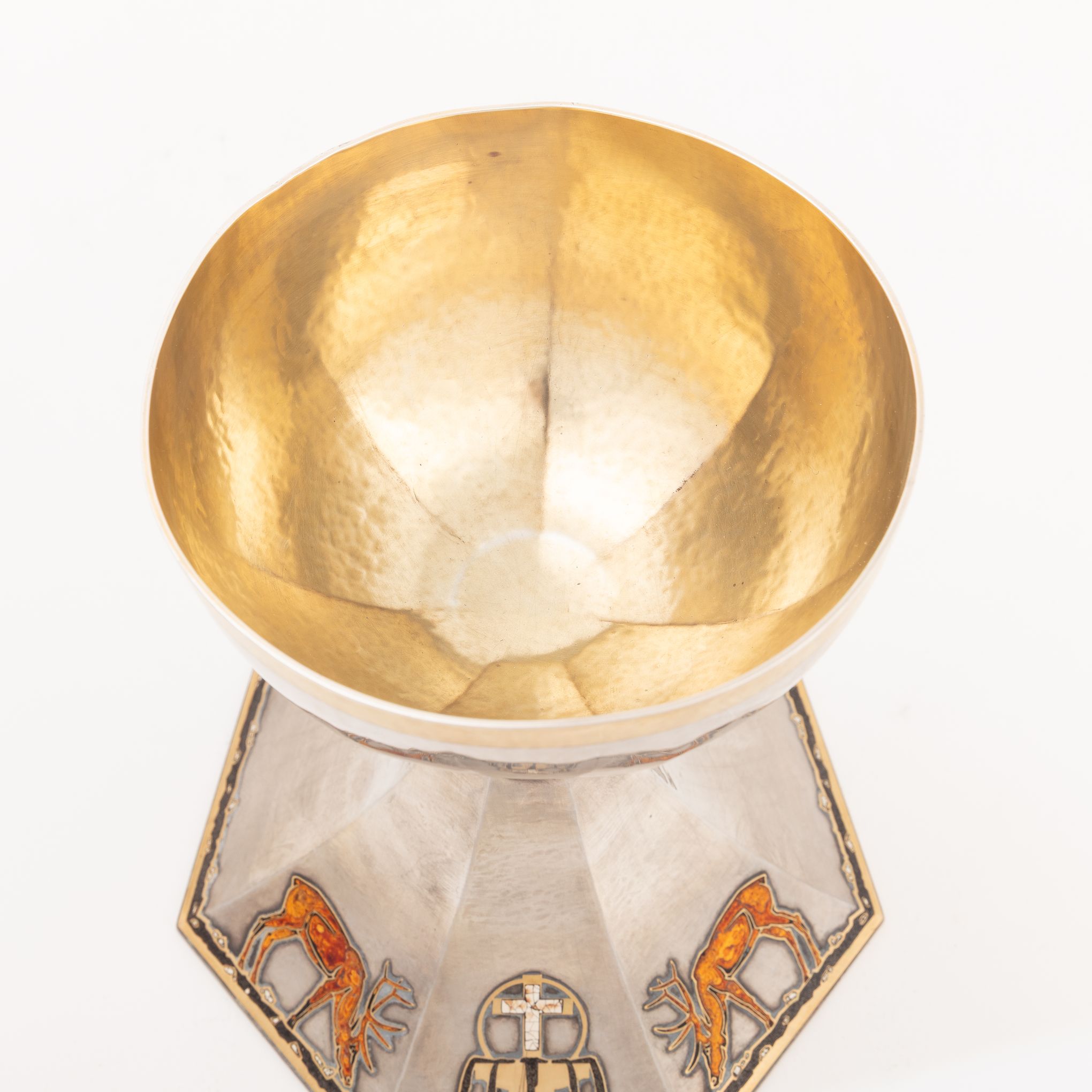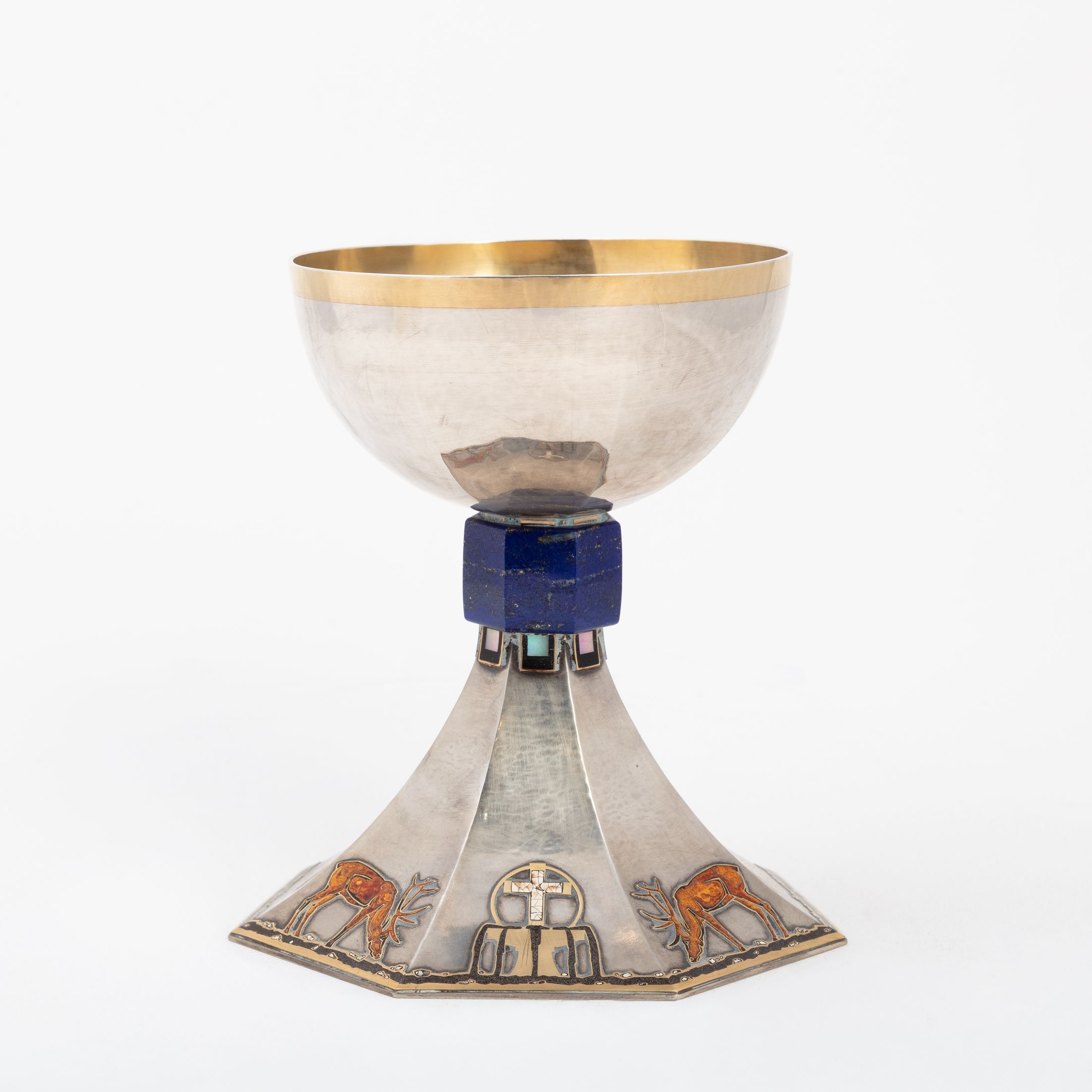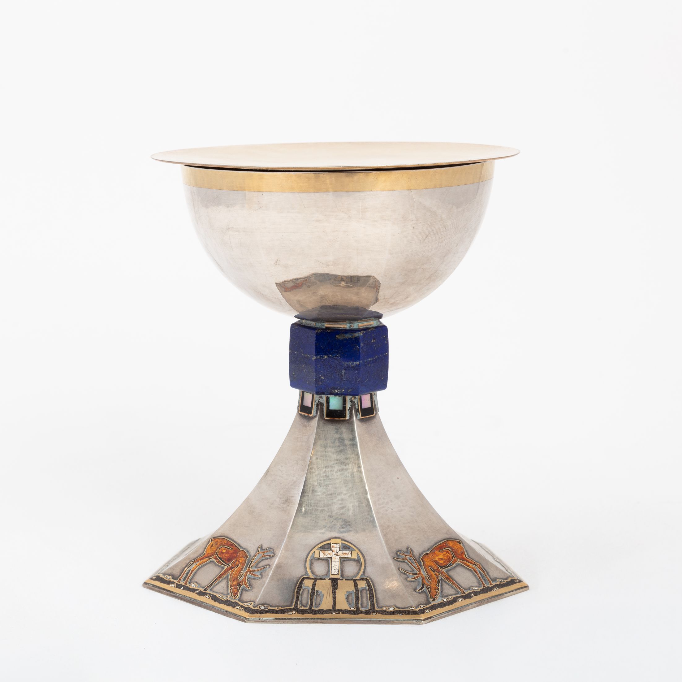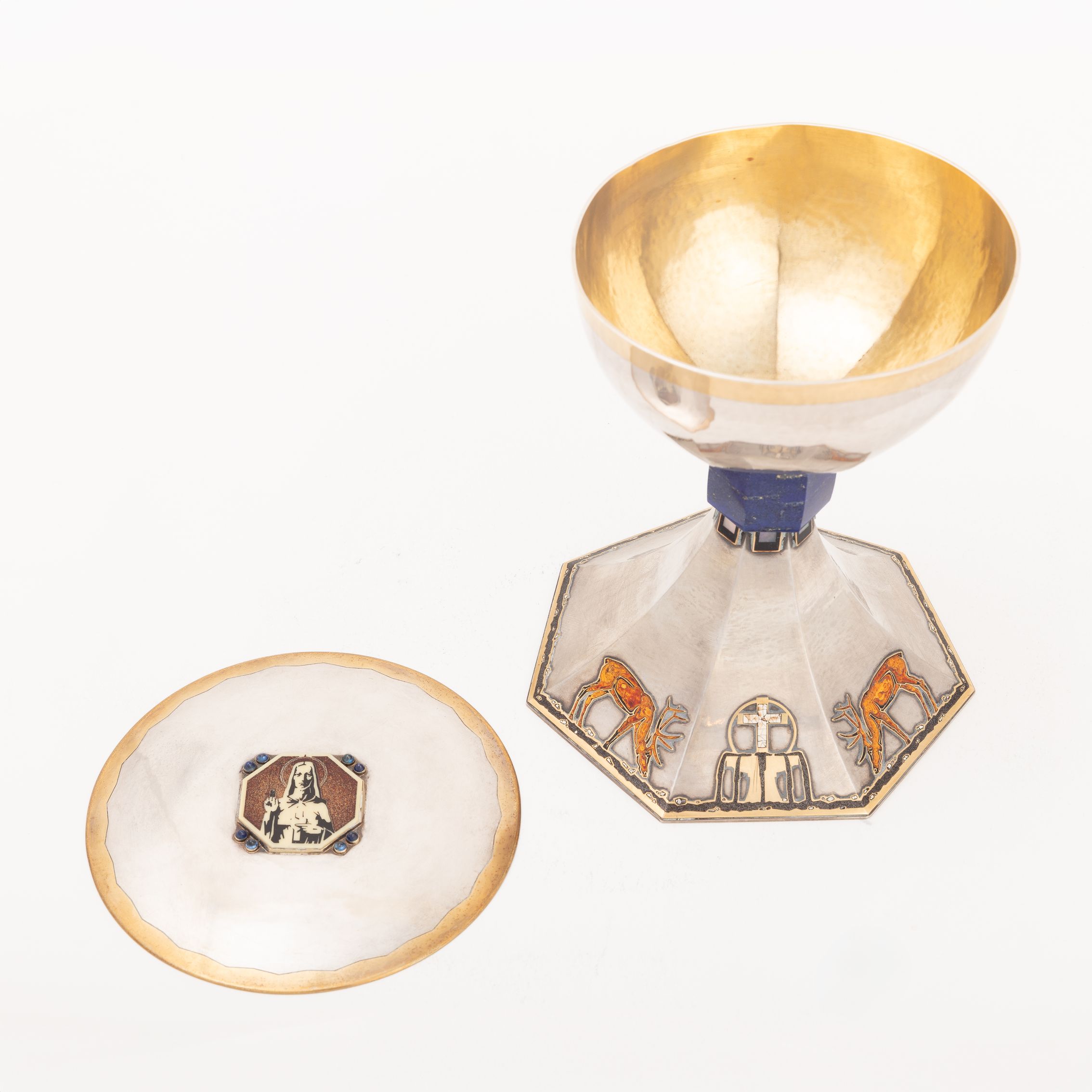 Deze kelk zou door Holemans zijn gemaakt voor kanunnik Théophile Joseph Barette, de eerste pastoor van de Nationale Basiliek van Koekelberg. De versiering is sober, de verhouding tussen de esthetiek en de verscheidenheid aan gebruikte materialen is evenwichtig. De rondingen zijn strak en de vormen nauwkeurig en verfijnd, waardoor het object perfect leesbaar blijft. Lapis lazuli, een steen die bekend staat om zijn zeer uitgesproken blauwe pigment, wordt gebruikt voor de knoop van de kelk, net zoals malachiet bij andere heilige vazen die gemaakt zijn door Holemans. Onder de knoop bevindt zich een fries van kleine vierkante parelmoeren cabochons. Het motief op de voet – twee herten die drinken uit een fontein – wordt door Holemans in verschillende van zijn werken hergebruikt. Om aan de groeiende vraag te voldoen, ontwikkelt de edelsmid namelijk een repertoire en verwisselbare modellen die van het ene werk naar het andere kunnen worden hergebruikt, maar toch individueel aanpasbaar blijven. De waterbron, met daarboven het kruis, is een symbool van leven. Het stromende water vormt een rand die de hele omtrek van de zevenhoekige voet benadrukt. De silhouetten van de herten zijn gelakt en het kruis bestaat uit fragmenten van eierschalen. De ronding van de schaal wordt gemarkeerd door licht uitstekende randen die die van de voet verlengen. De binnenkant van de schaal, in verguld zilver, is gehamerd.