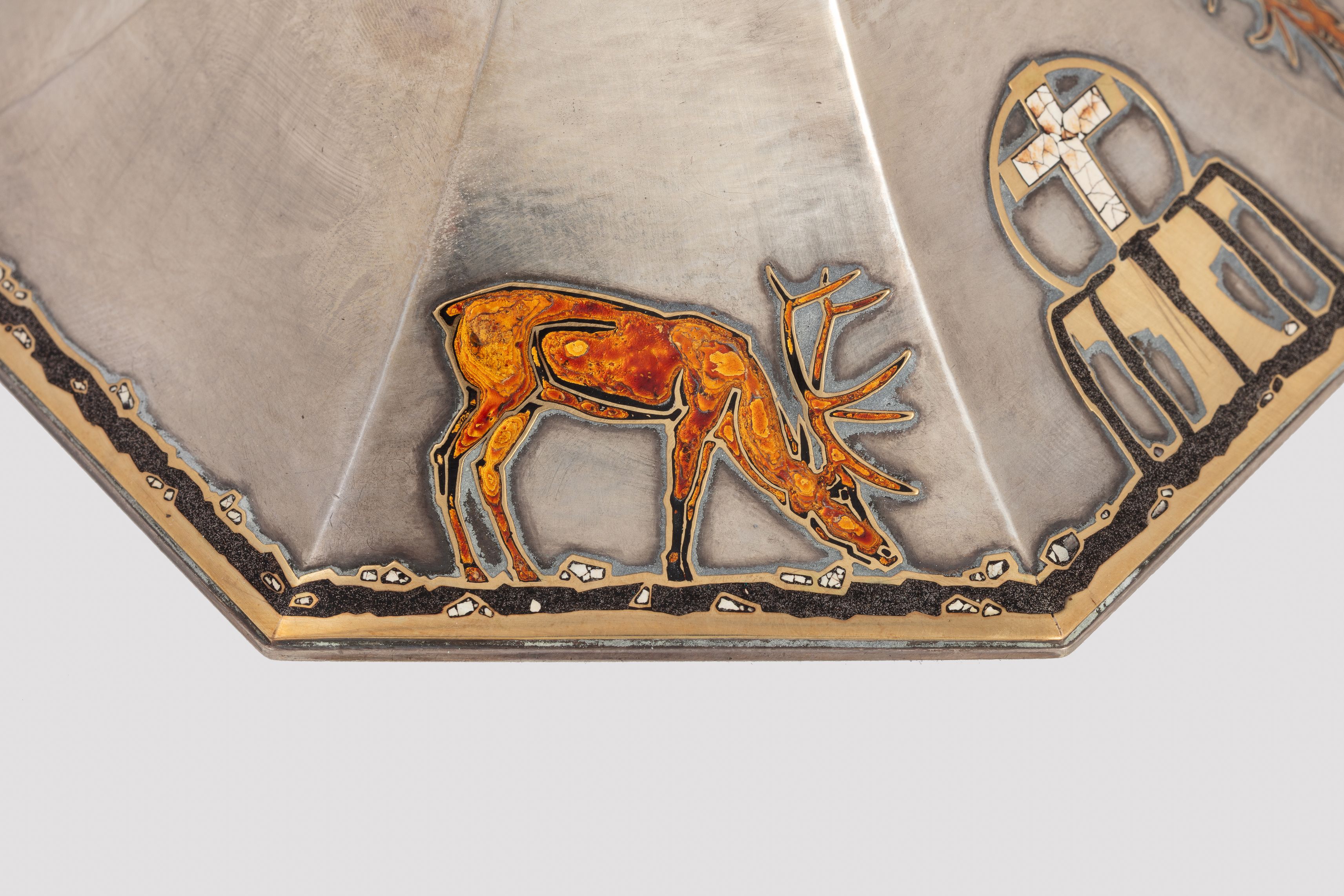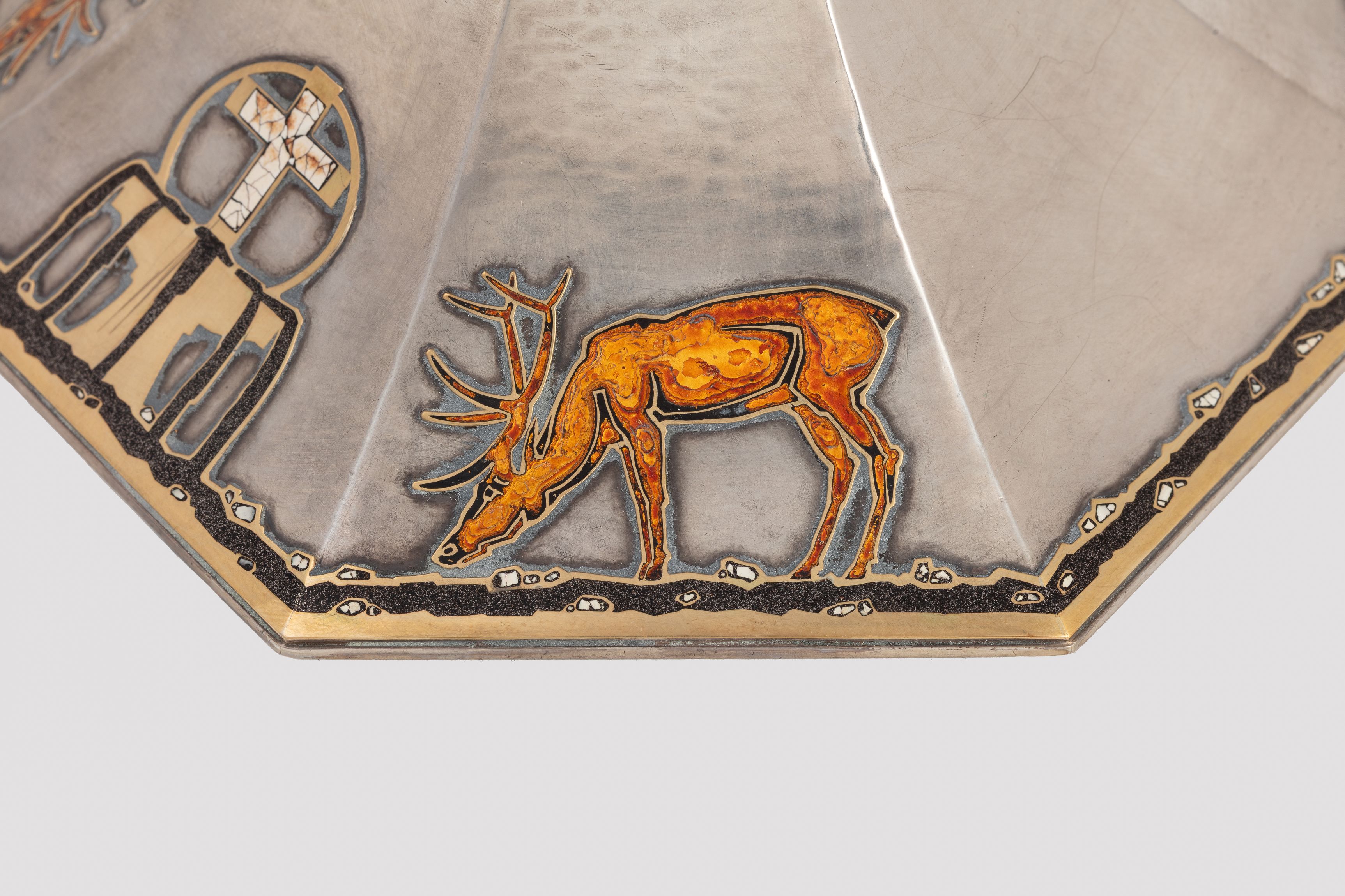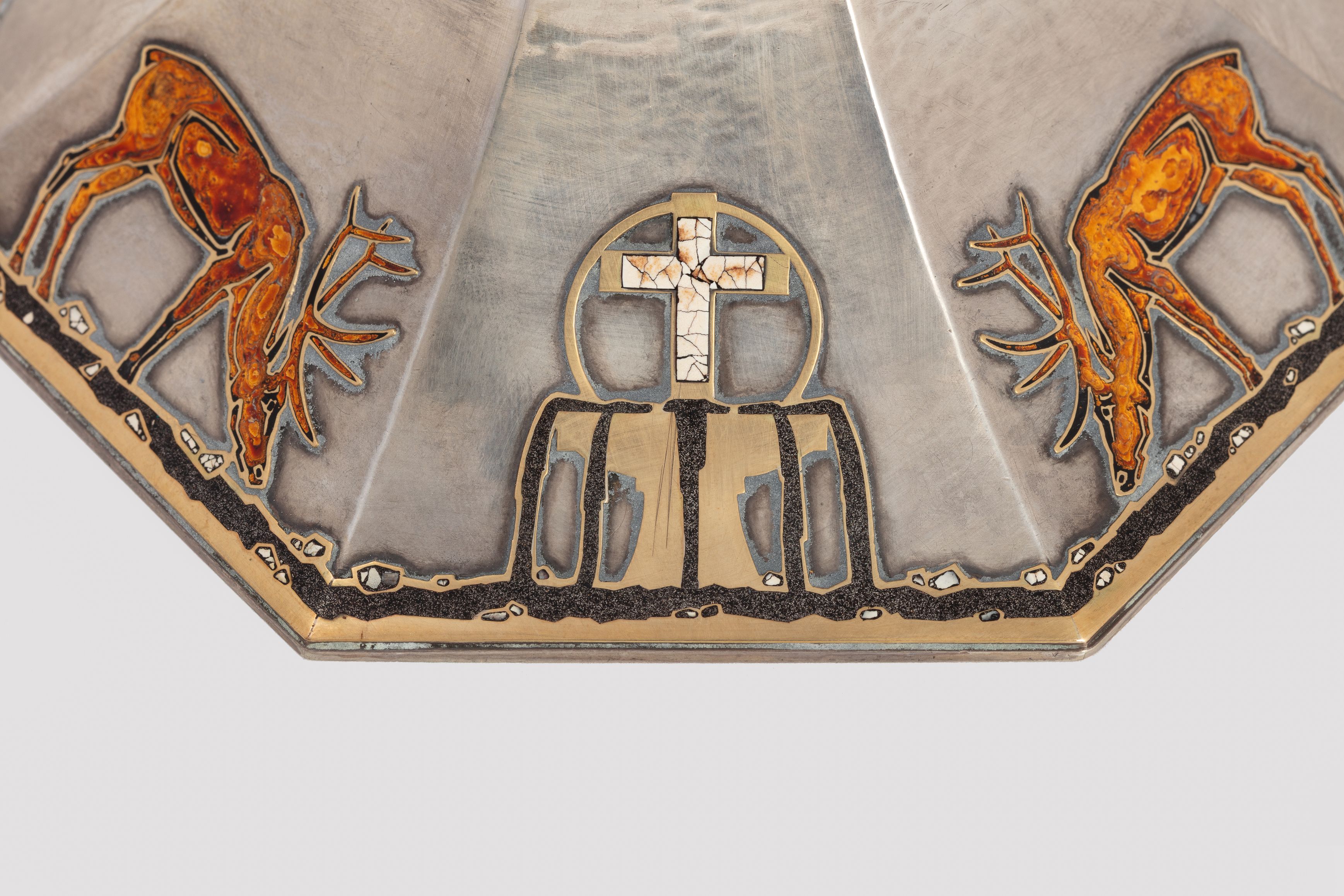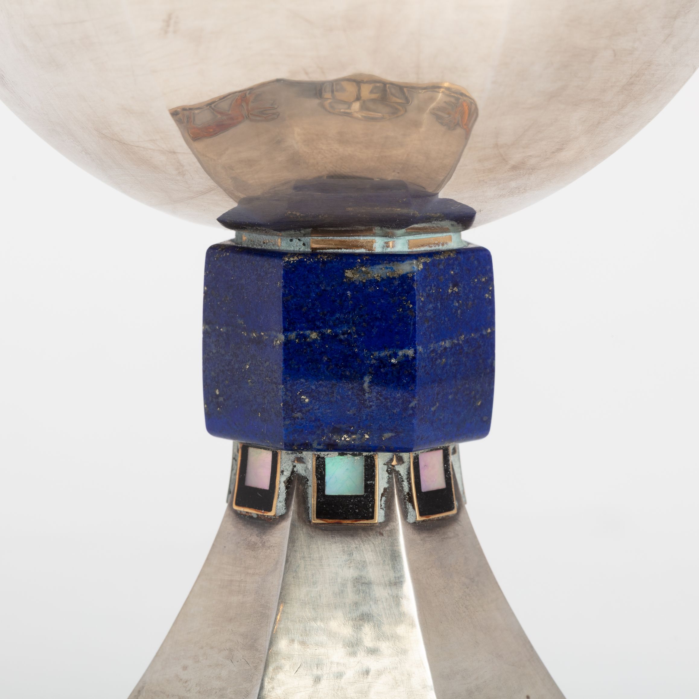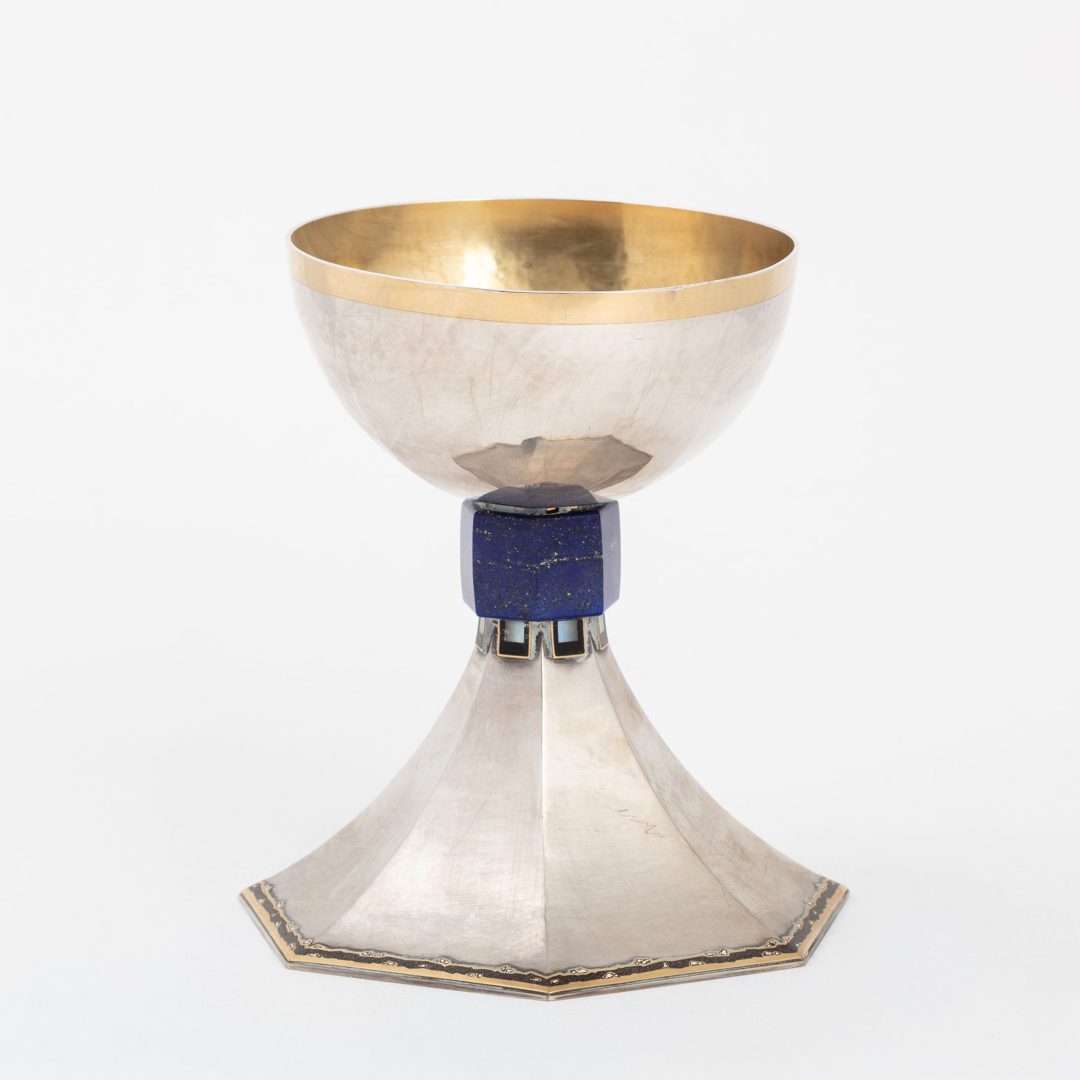 Deze kelk zou door Holemans zijn gemaakt voor kanunnik Théophile Joseph Barette, de eerste pastoor van de Nationale Basiliek van Koekelberg. De versiering is sober, de verhouding tussen de esthetiek en de verscheidenheid aan gebruikte materialen is evenwichtig. De rondingen zijn strak en de vormen nauwkeurig en verfijnd, waardoor het object perfect leesbaar blijft. Lapis lazuli, een steen die bekend staat om zijn zeer uitgesproken blauwe pigment, wordt gebruikt voor de knoop van de kelk, net zoals malachiet bij andere heilige vazen die gemaakt zijn door Holemans. Onder de knoop bevindt zich een fries van kleine vierkante parelmoeren cabochons. Het motief op de voet – twee herten die drinken uit een fontein – wordt door Holemans in verschillende van zijn werken hergebruikt. Om aan de groeiende vraag te voldoen, ontwikkelt de edelsmid namelijk een repertoire en verwisselbare modellen die van het ene werk naar het andere kunnen worden hergebruikt, maar toch individueel aanpasbaar blijven. De waterbron, met daarboven het kruis, is een symbool van leven. Het stromende water vormt een rand die de hele omtrek van de zevenhoekige voet benadrukt. De silhouetten van de herten zijn gelakt en het kruis bestaat uit fragmenten van eierschalen. De ronding van de schaal wordt gemarkeerd door licht uitstekende randen die die van de voet verlengen. De binnenkant van de schaal, in verguld zilver, is gehamerd.