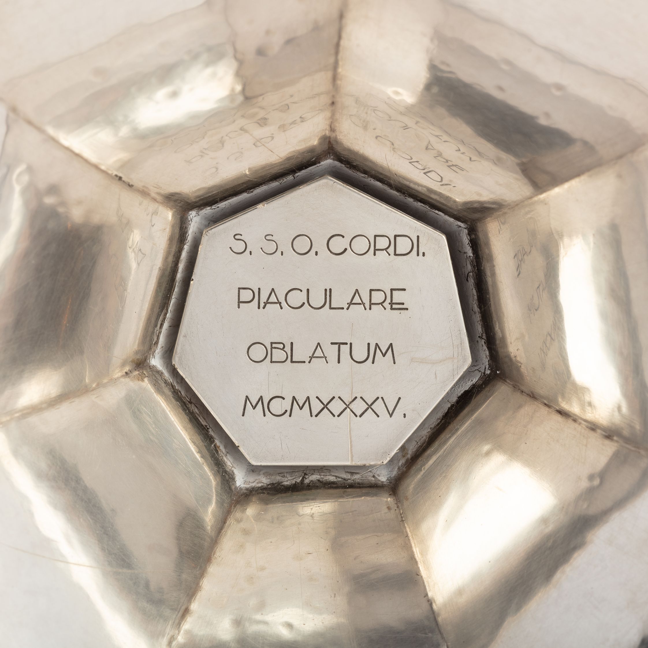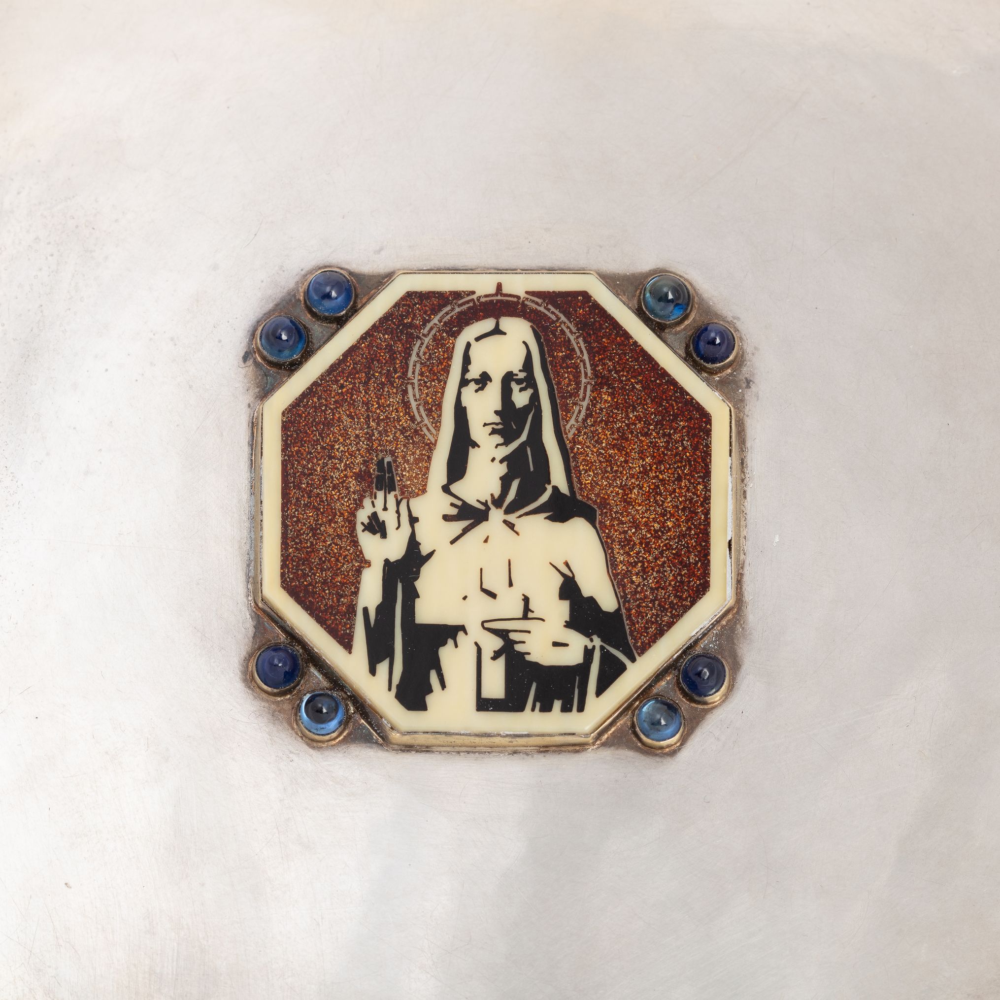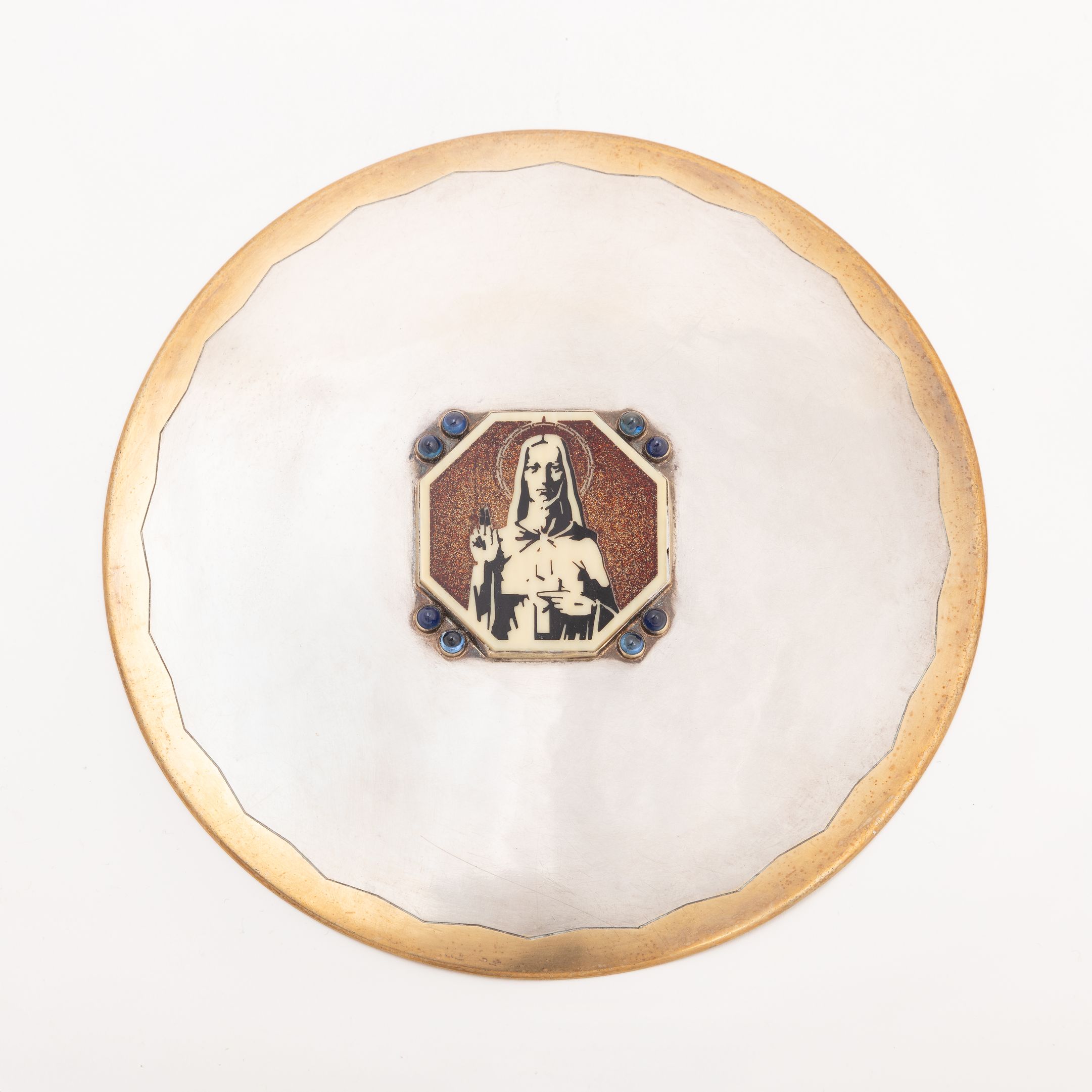 De vaas wordt vergezeld door een pateen van zilver en verguld zilver. De achterkant is versierd met een golvende gouden rand en in het midden bevindt zich een achthoekig plaatje met het Heilig Hart van Christus. Acht blauwe halfedelstenen maken het geheel compleet.