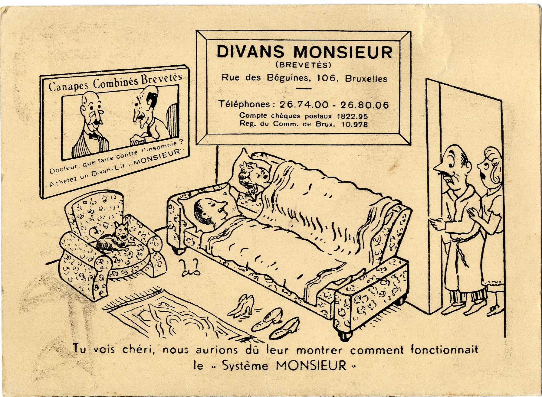 Reclameprentkaart "Divans Monsieur", meubelfabrikant, Begijnenstraat 106 (Sint-Jans-Molenbeek), 1950.