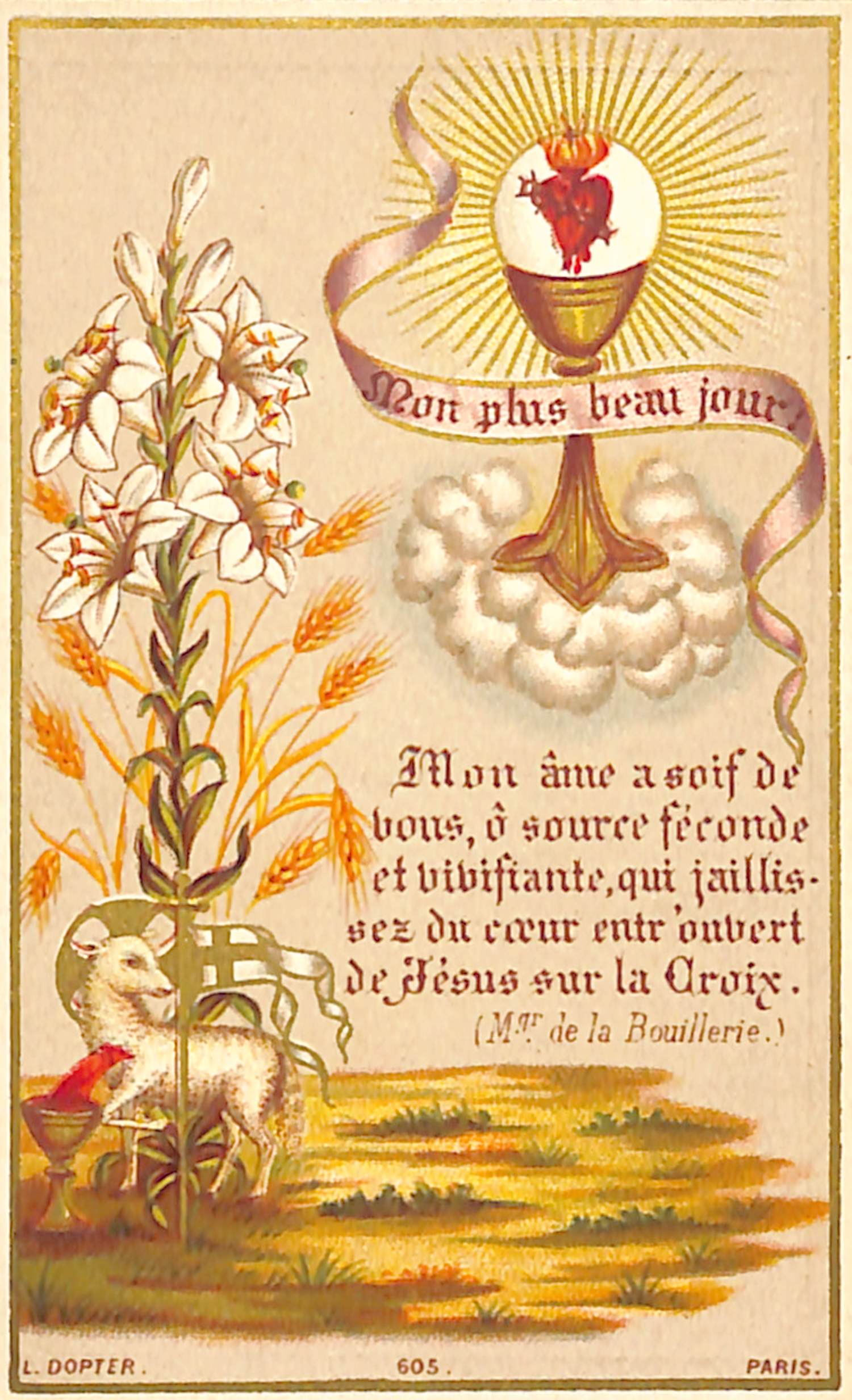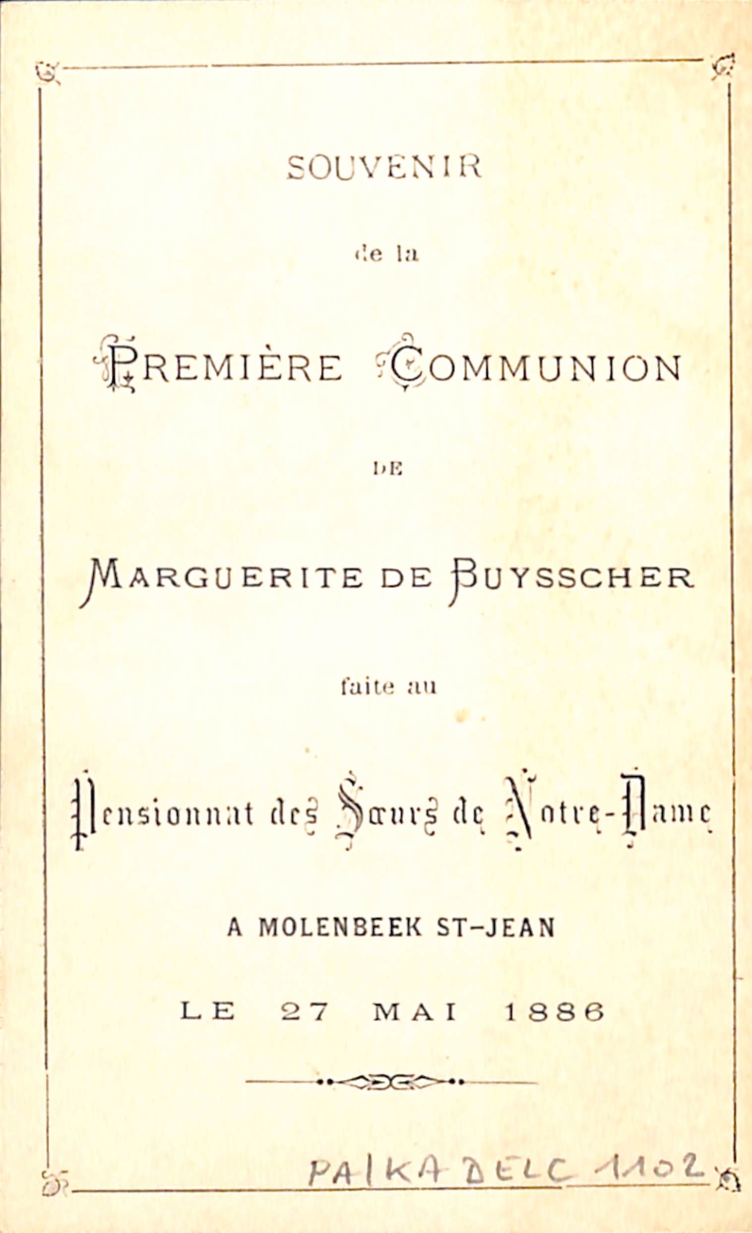 Souvenir van Eerste communie Marguerite De Buysscher, "Pensionnat des Soeurs de Notre-Dame" (Sint-Jans-Molenbeek), uitg. L. Dopter (Parijs), 1886.