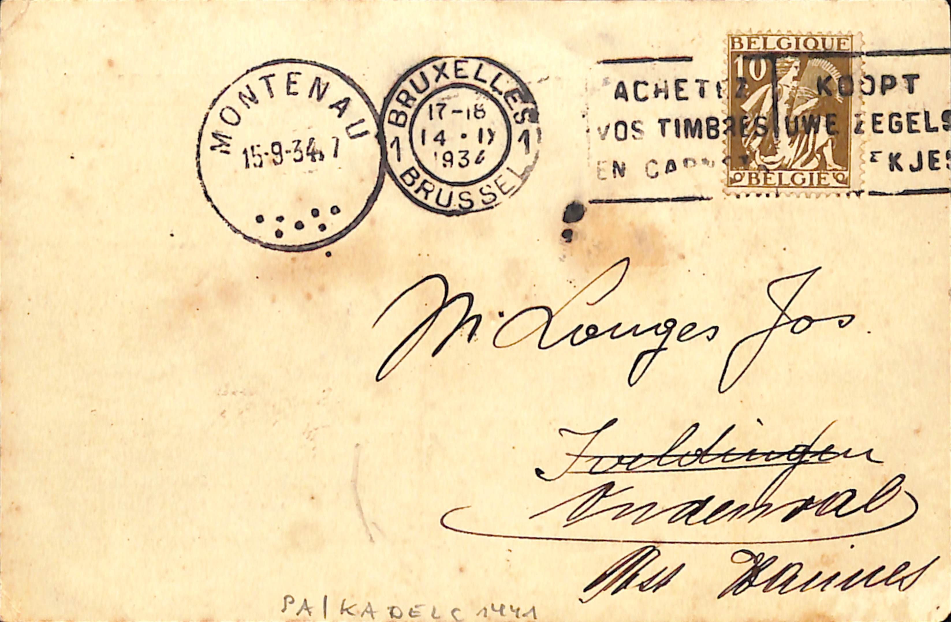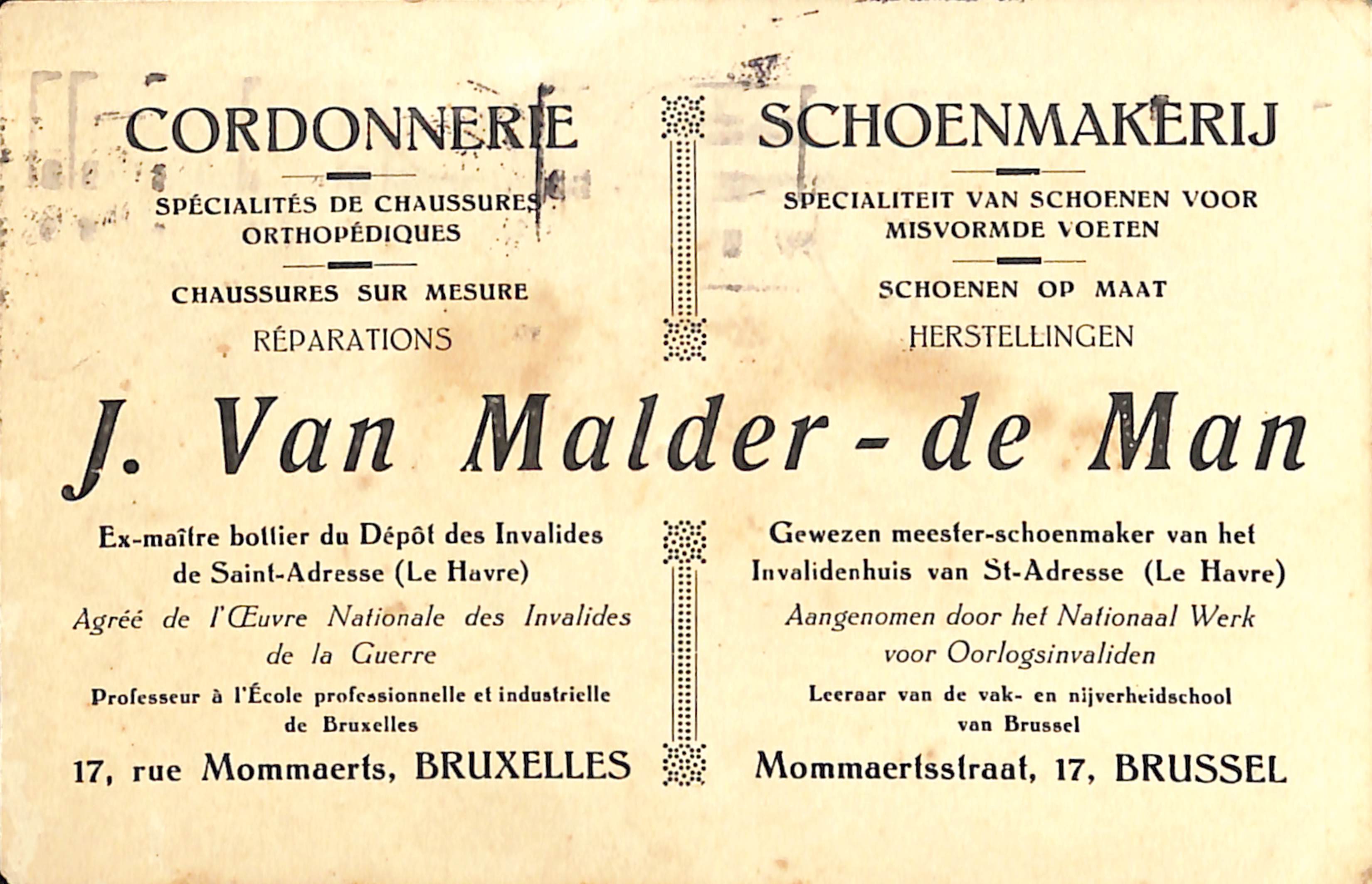 Reclamepostkaart Orthopedische schoenmakerij J. Van Malder-de Man, Mommaertsstraat 17 (Sint-Jans-Molenbeek), 1934.