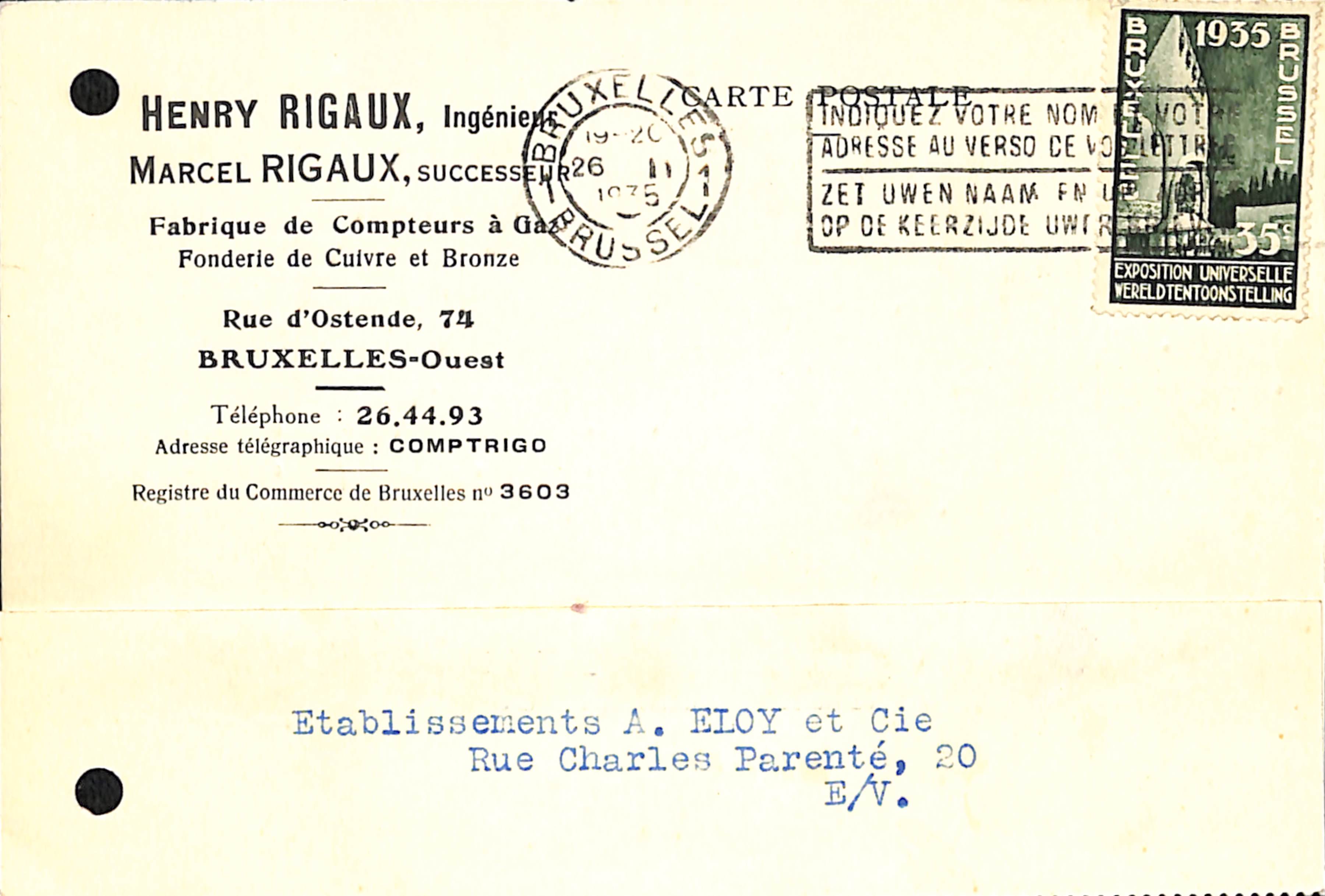 Commerciële prentkaart Henri Rigaux - Marcel Rigaux, opvolger, fabriek van gasmeters, Oostendestraat 74 (Sint-Jans-Molenbeek), 1935.