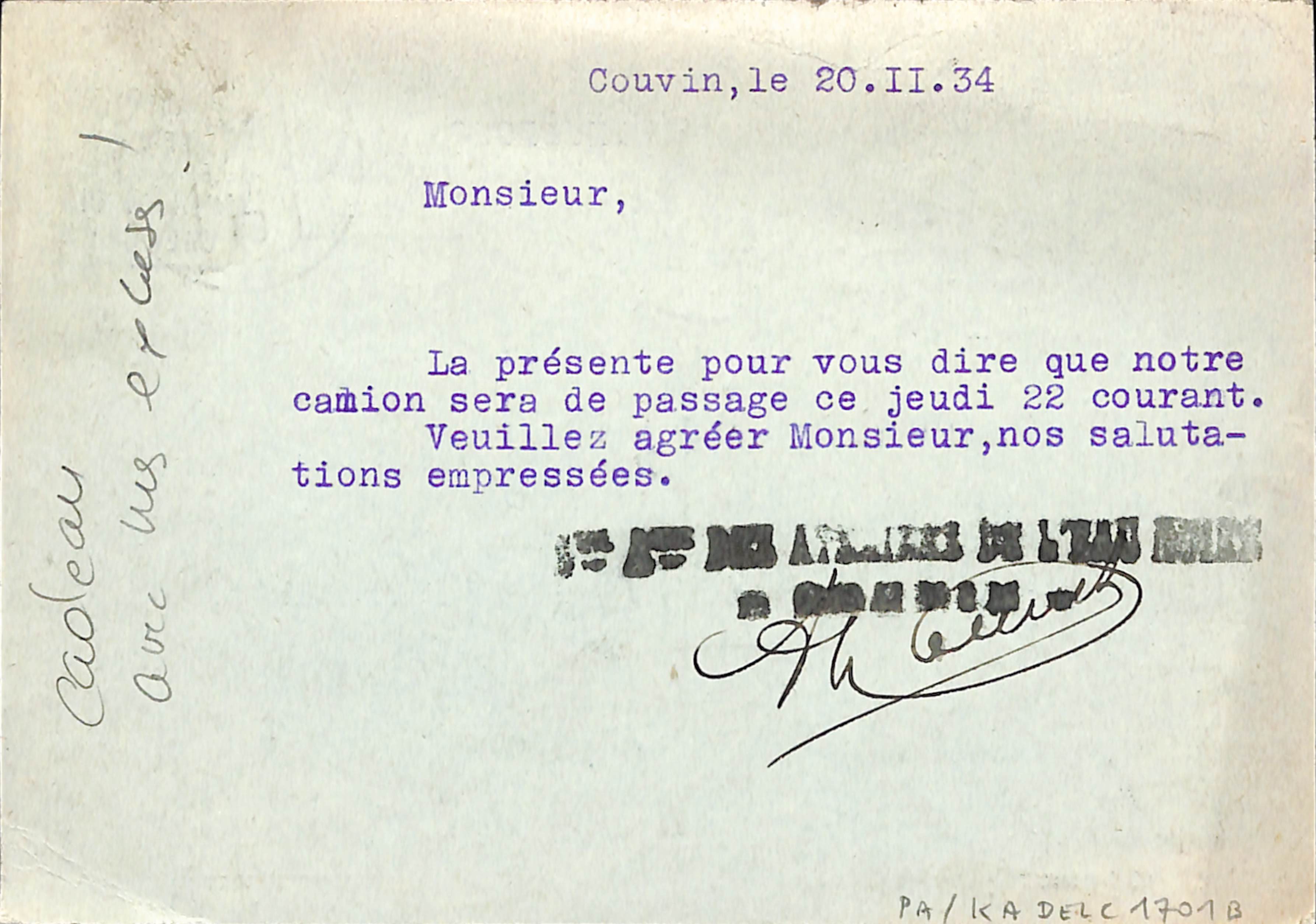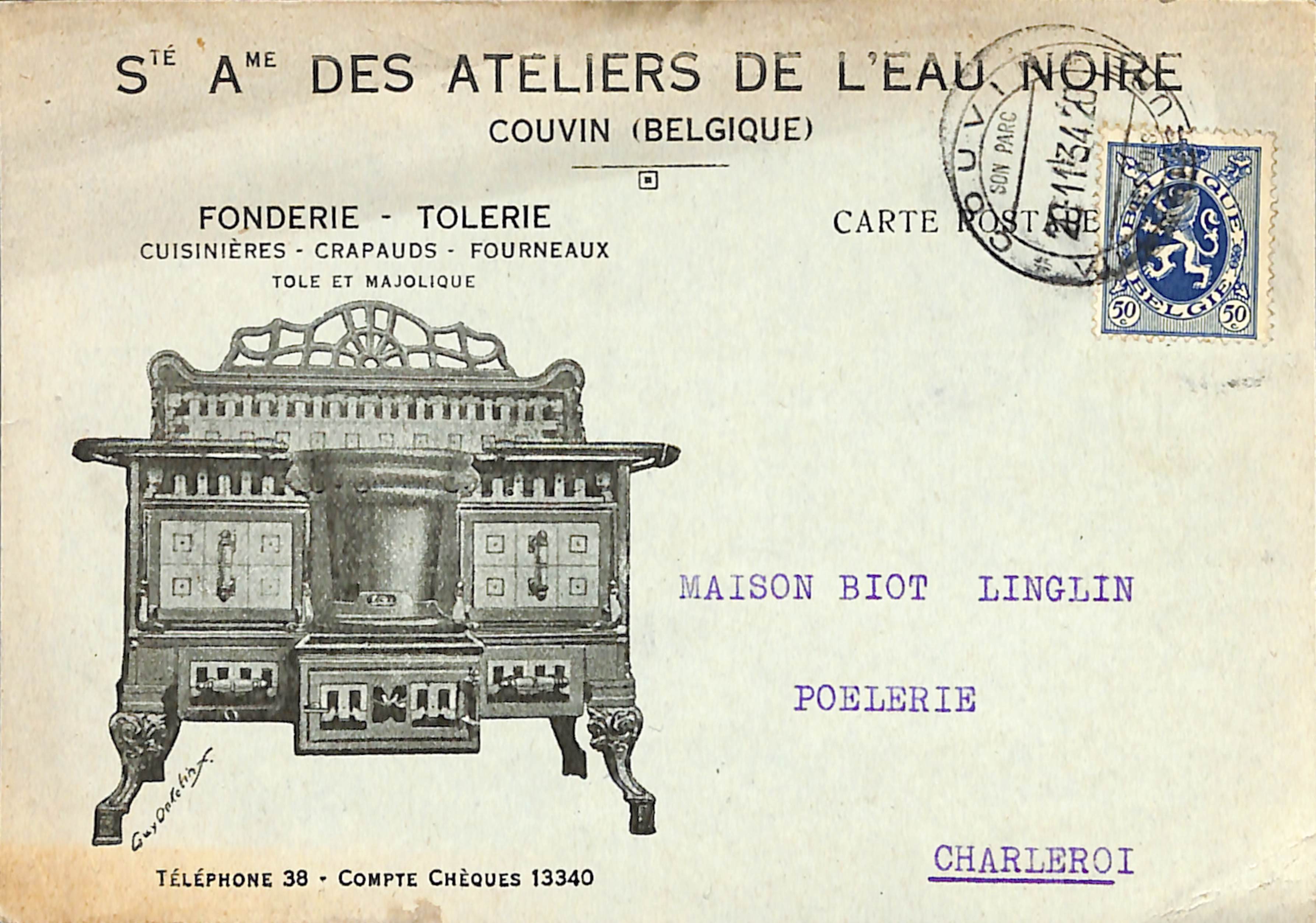 Reclameprentkaart S.A. des Ateliers de l'Eau noire (Couvin), gieterij en plaatwerkerij, 1934.
