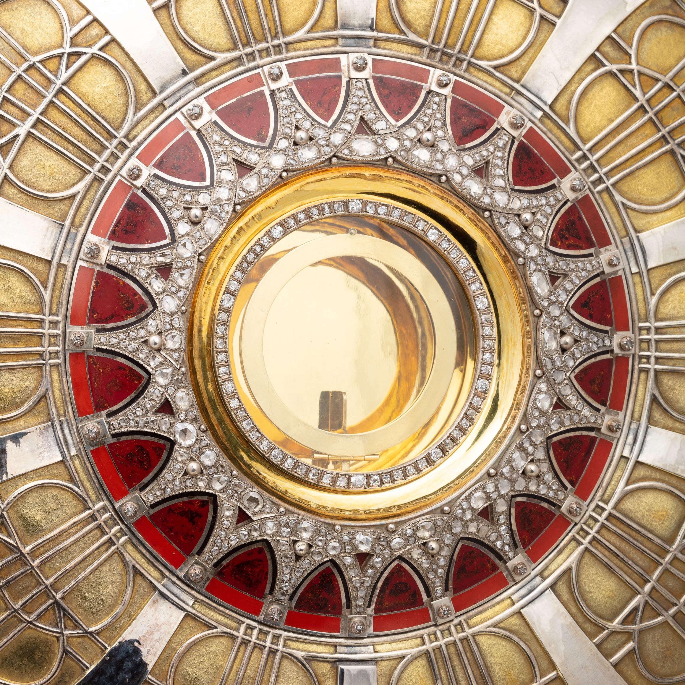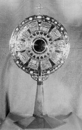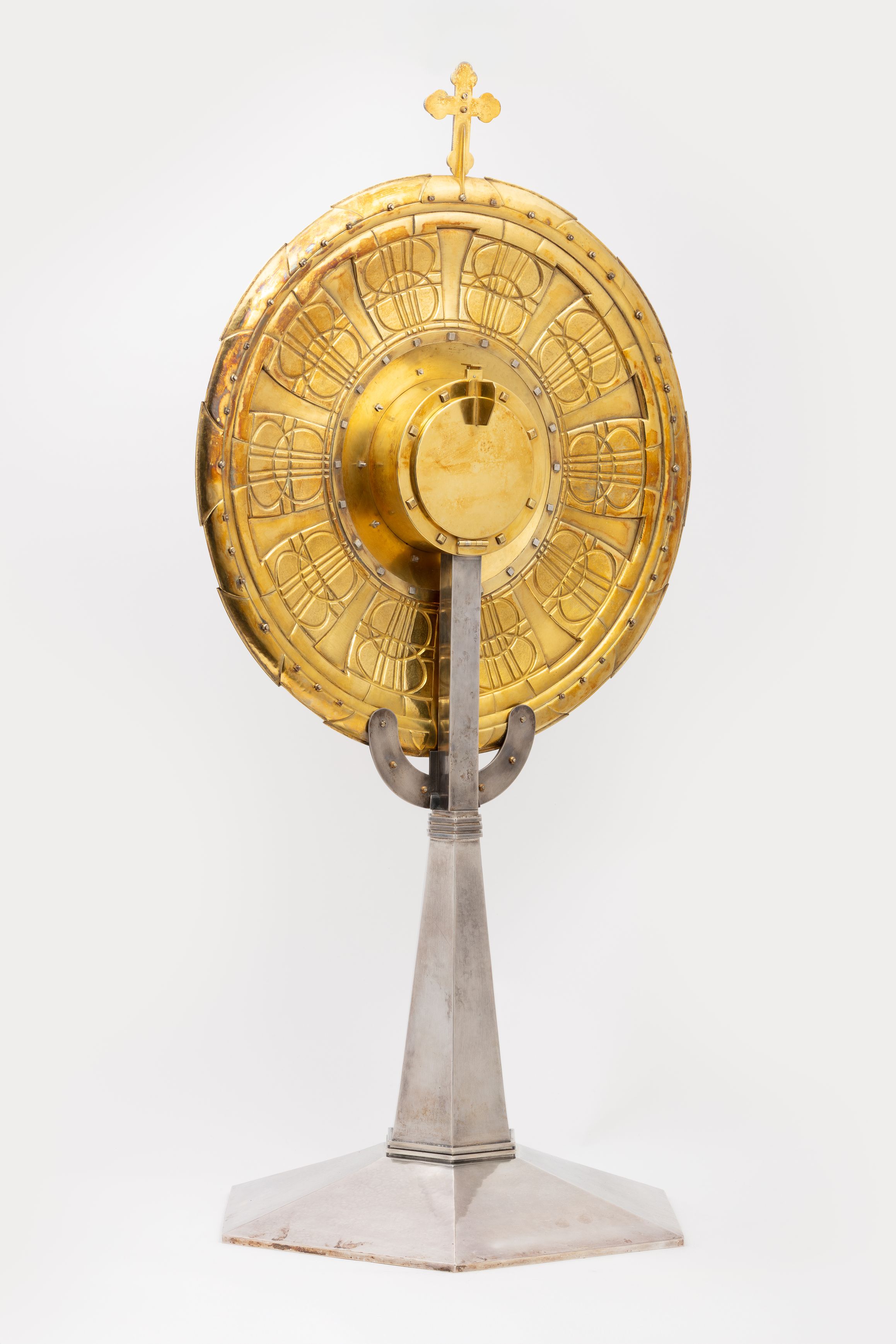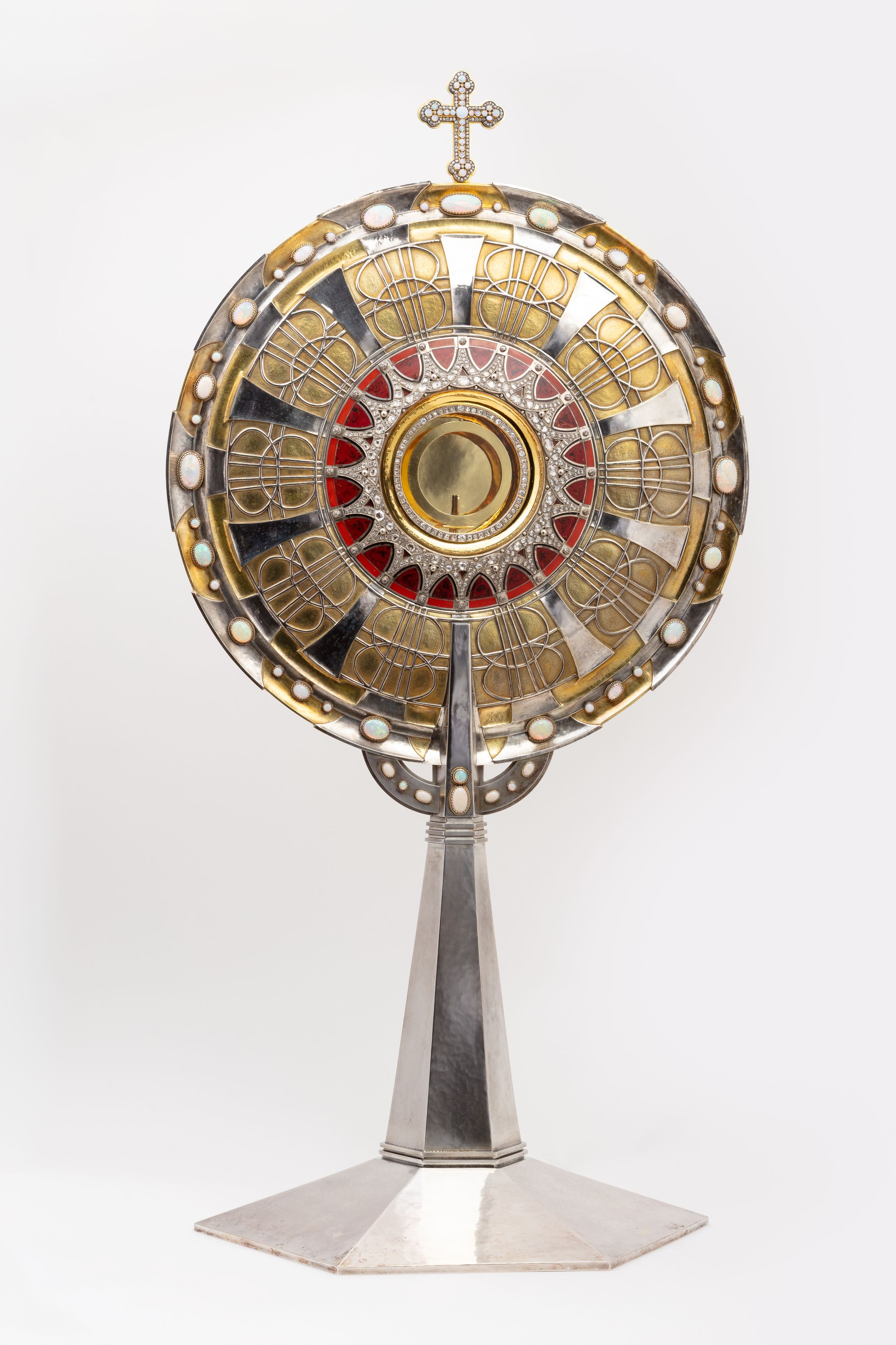 Deze monstrans werd in 1946 geschonken door de Eucharistische Kruistocht en is vervaardigd door de goudsmid Joseph Devroye (1892-1975) op basis van oude juwelen die door de prinses van Mérode werden geschonken. De archieven van de basiliek documenteren deze opdracht. Het zou gaan om een oud stuk, dat door Devroye in art-decostijl is bewerkt. De soberheid van de achthoekige voet en de steel contrasteert met de rijke en gedetailleerde versiering van het bovenste gedeelte. De rand van het centrale compartiment is versierd met edelstenen die een stralend motief vormen. Het geheel is versierd met edelstenen en cabochons van opaal en bekroond met een kruis met briljanten. De geometrische decoratieve stijl is uitgesproken. Hoewel de versiering zorgvuldig is uitgedacht en de verschillende materialen vakkundig zijn gecombineerd, blijft het object imposant en bereikt het niet de elegantie van de stukken die edelsmid Henri-Joseph Holemans voor de schat van de basiliek heeft gemaakt.