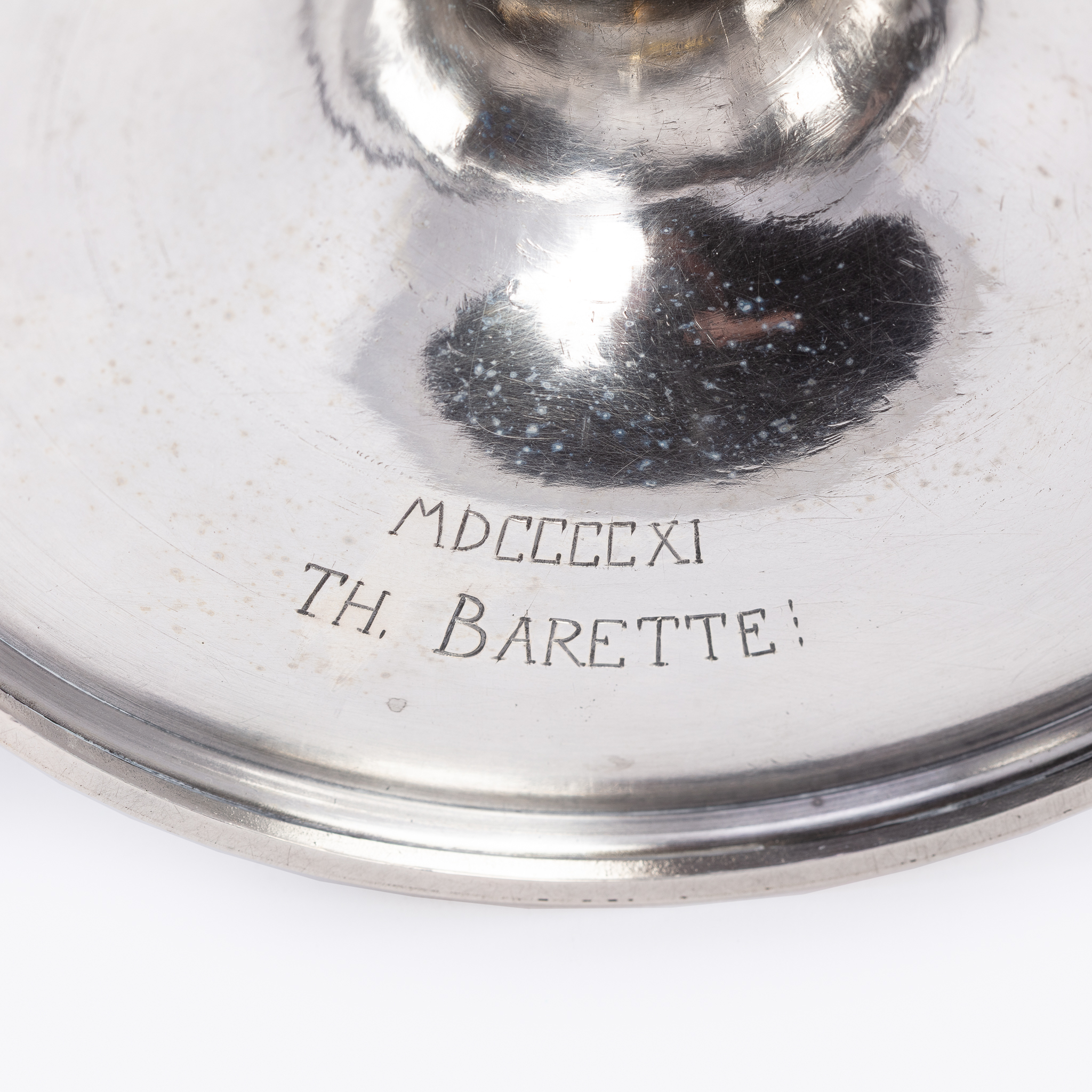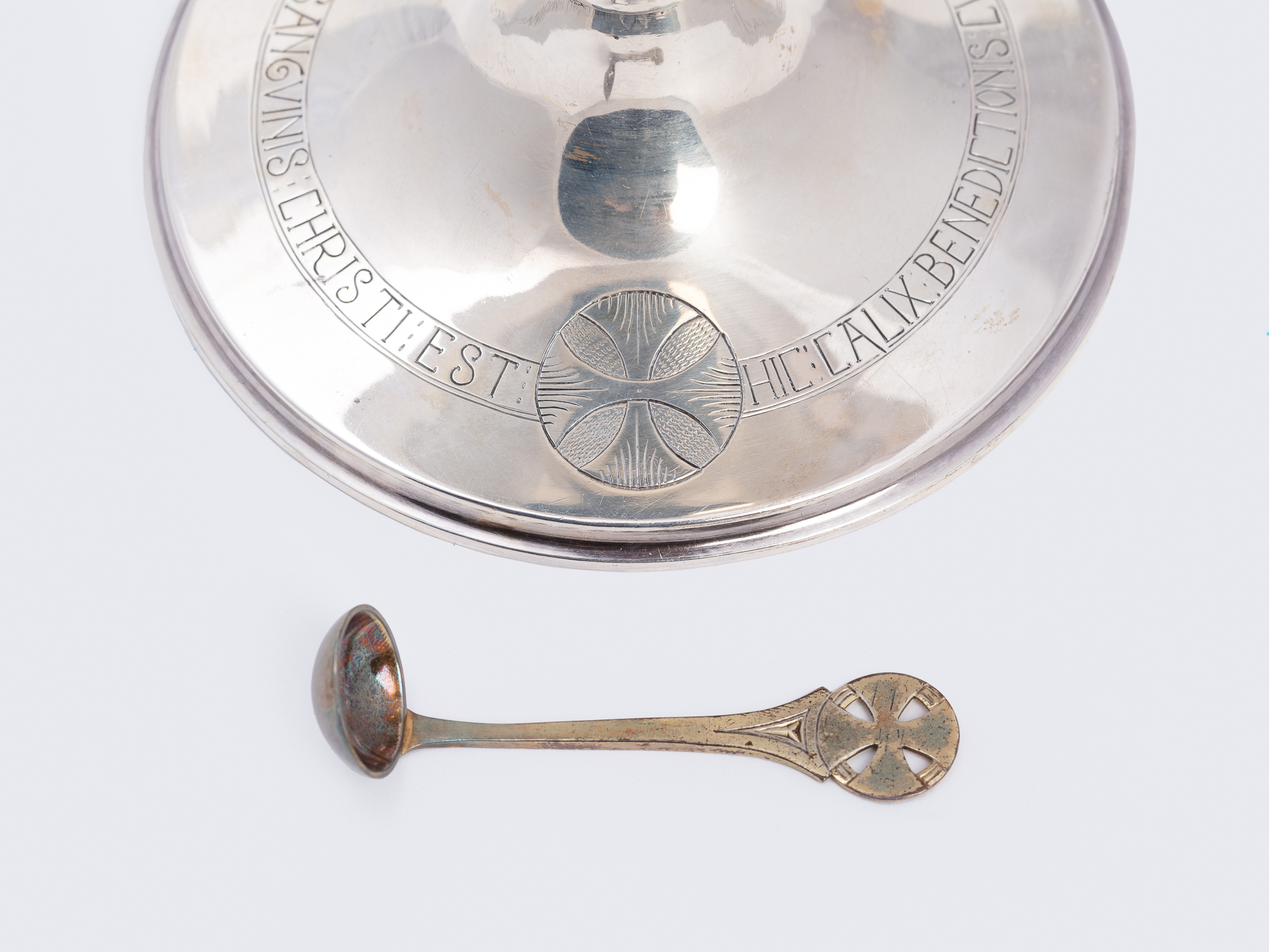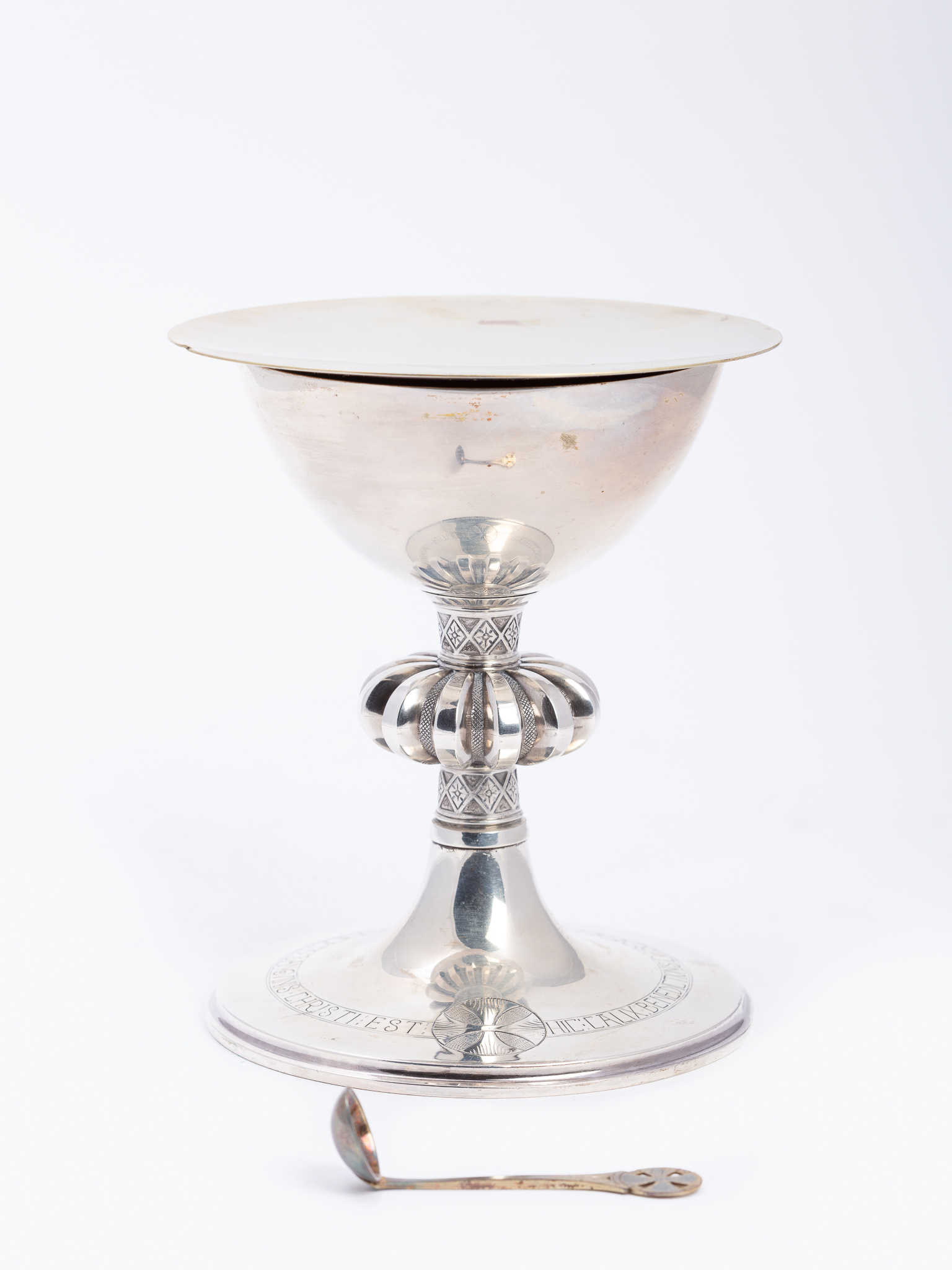 "Hic calix benedictionis cui benedicimus nonne communicatio sanguinis chriti est" (op de voet)