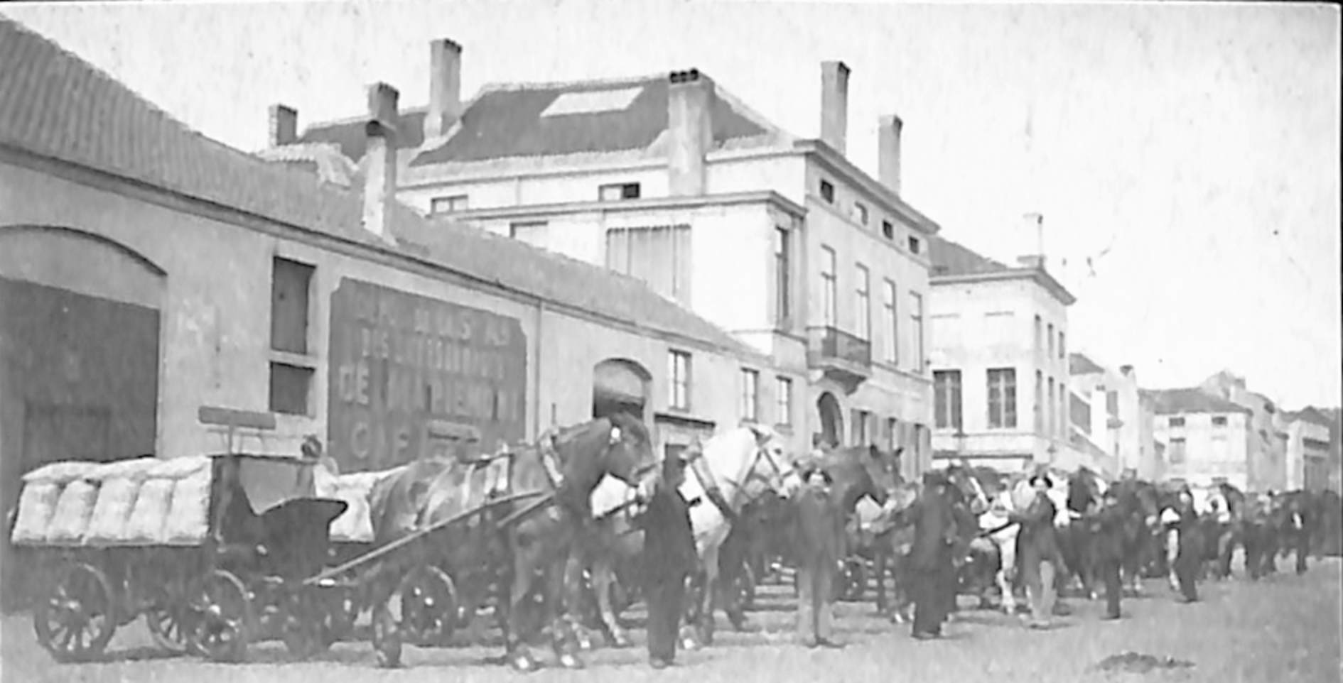 Foto Door paarden getrokken wagen van de kolenhandel G. Devis & fils, Mariemontkaai 2-14, Steenweg op Ninove 6 (Sint-Jans-Molenbeek), fotogr. onbekend, 1910.