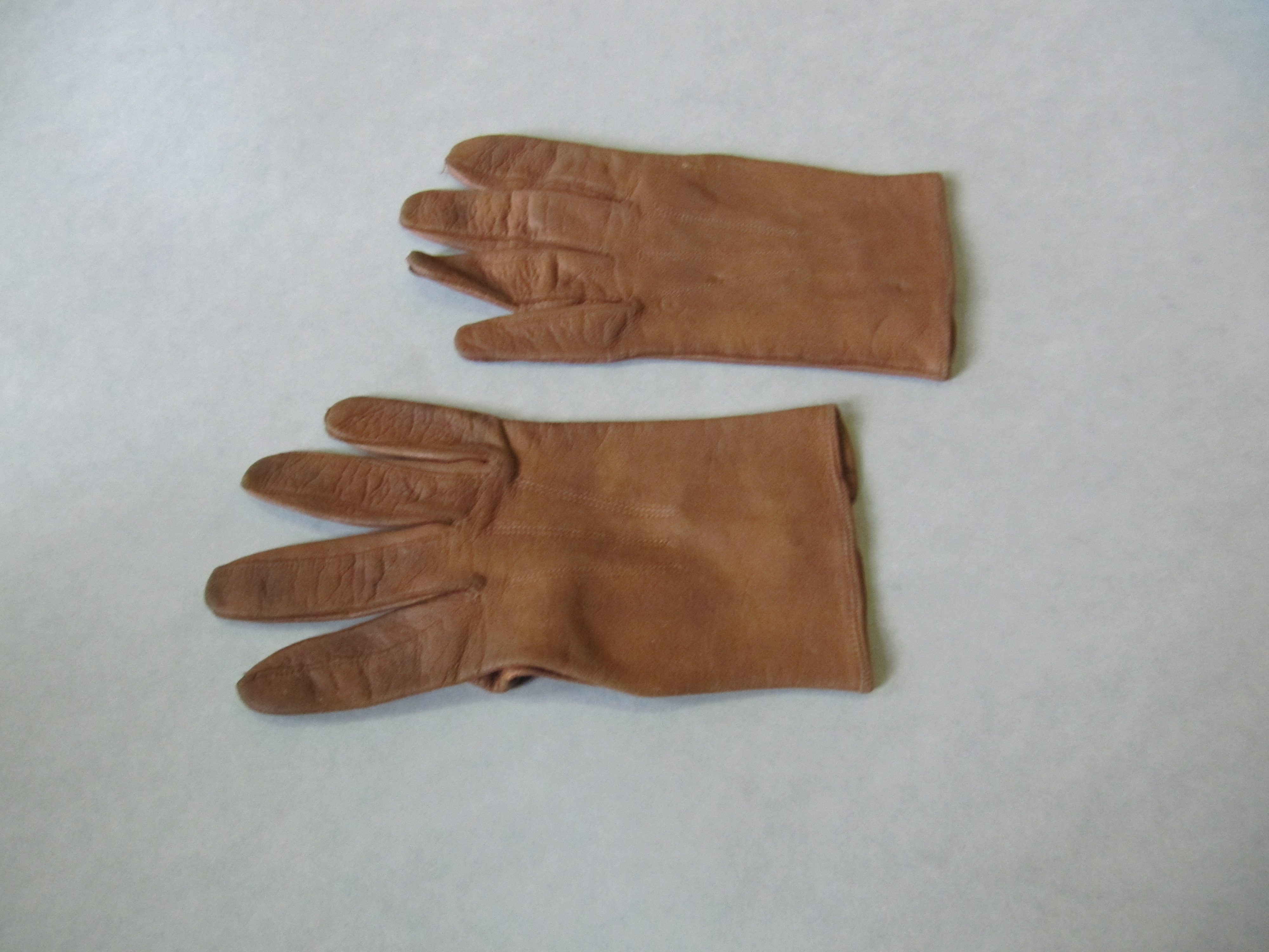 Een paar bruine leren handschoenen, met op de wreef drie naden ter versiering en één knoop aan de pols, s.d. [1950].