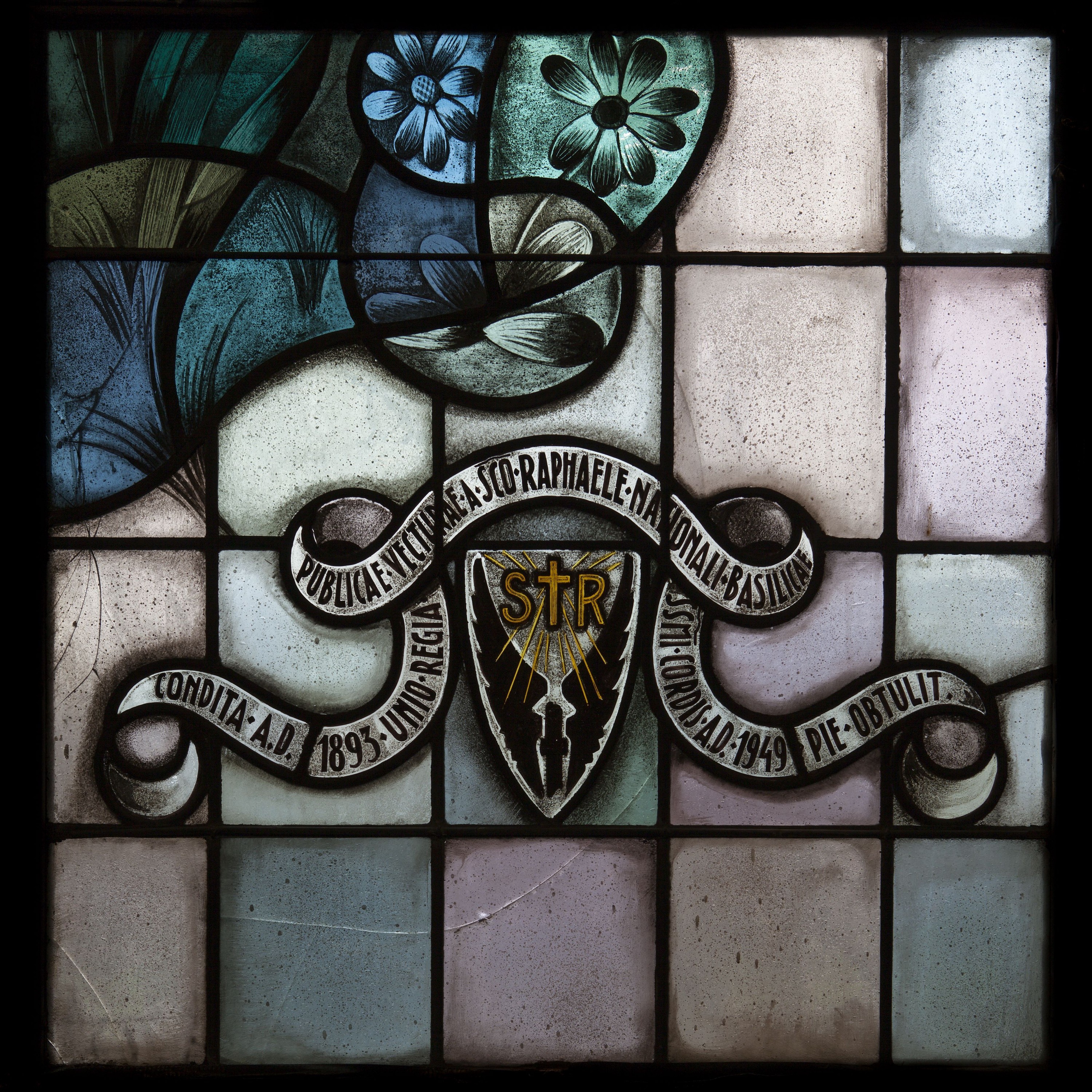 "CONDITA A.D. 1893 UNIO REGIA / PUBLICAE VECTURAE A SCO RAPHAELE NATIONALI BASILICAE /SSMI CORDIS A.D. 1949 PIE OBTULIT" (geschilderd, onder rechts)