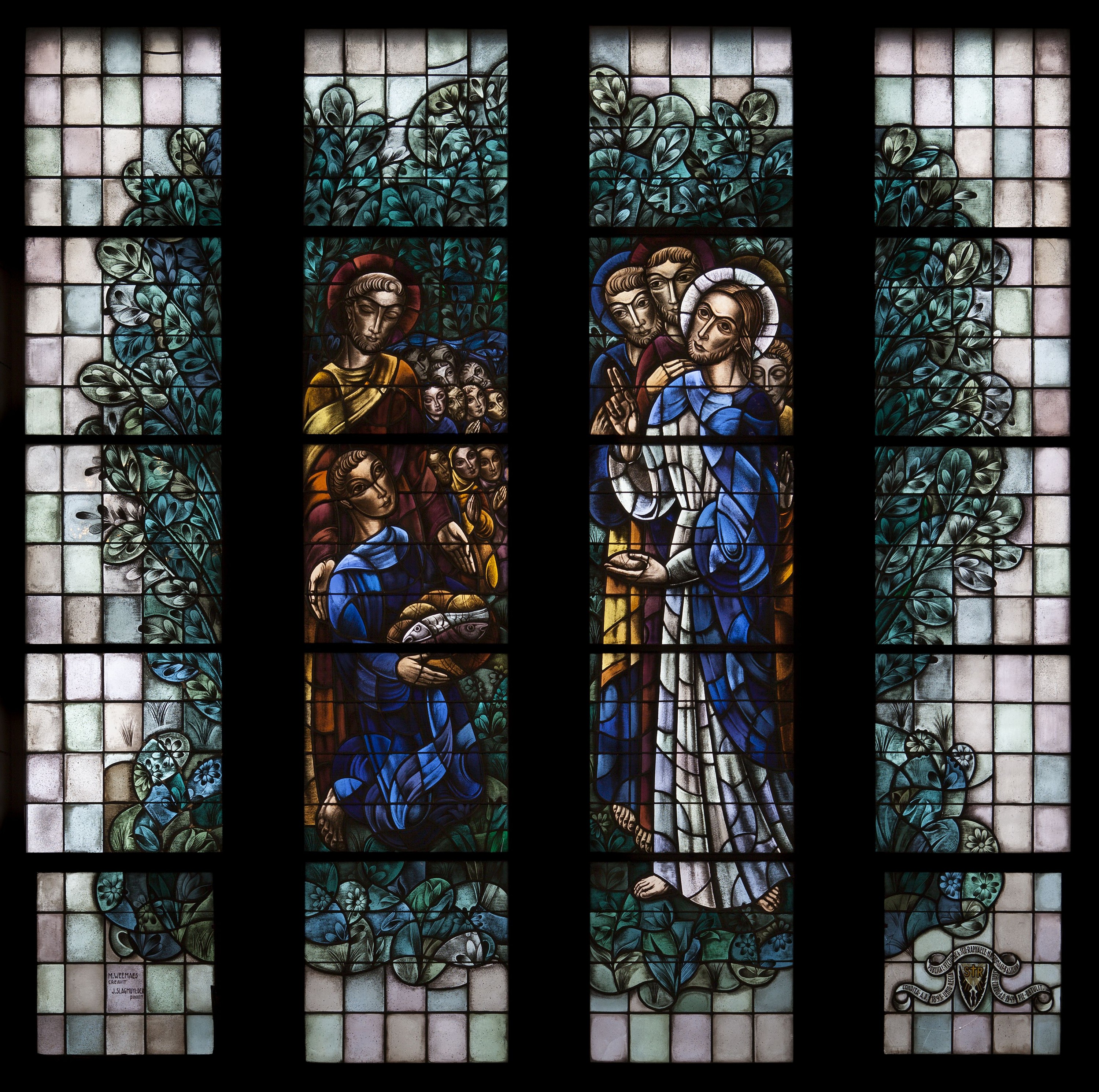 Het ontwerp van alle glasramen in de zijbeuken van het parochieschip was aanvankelijk toevertrouwd aan Margot Weemaes, die uiteindelijk alleen de kartonnen ontwerpen maakte voor dit glasraam, waarop de Vermenigvuldiging van de broden en vissen is afgebeeld. Het werd in 1949 geplaatst door Jean Slagmuylder. Het maakt deel uit van een reeks van zes glasramen, waarvan de iconografie gewijd is aan de Eucharistie.