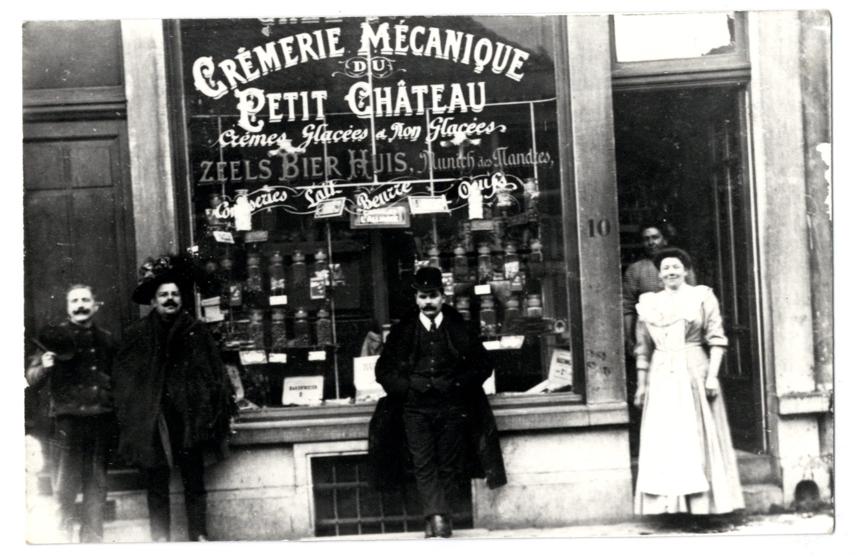 Fotokaart Vitrine van de “Crémerie mécanique du Petit Château” (Sint-Jans-Molenbeek?), fotogr. onbekend, s.d. [rond 1910-1930].