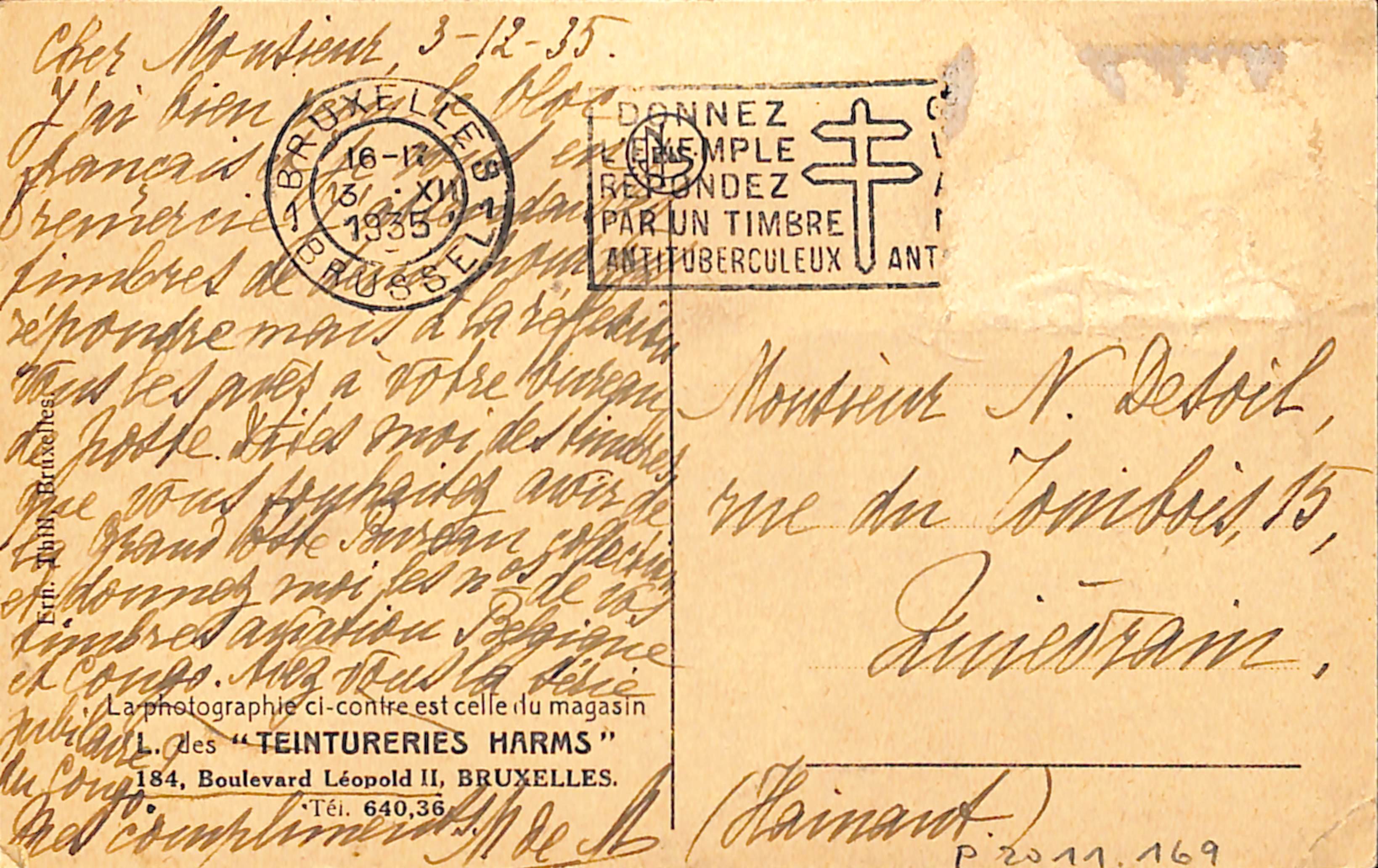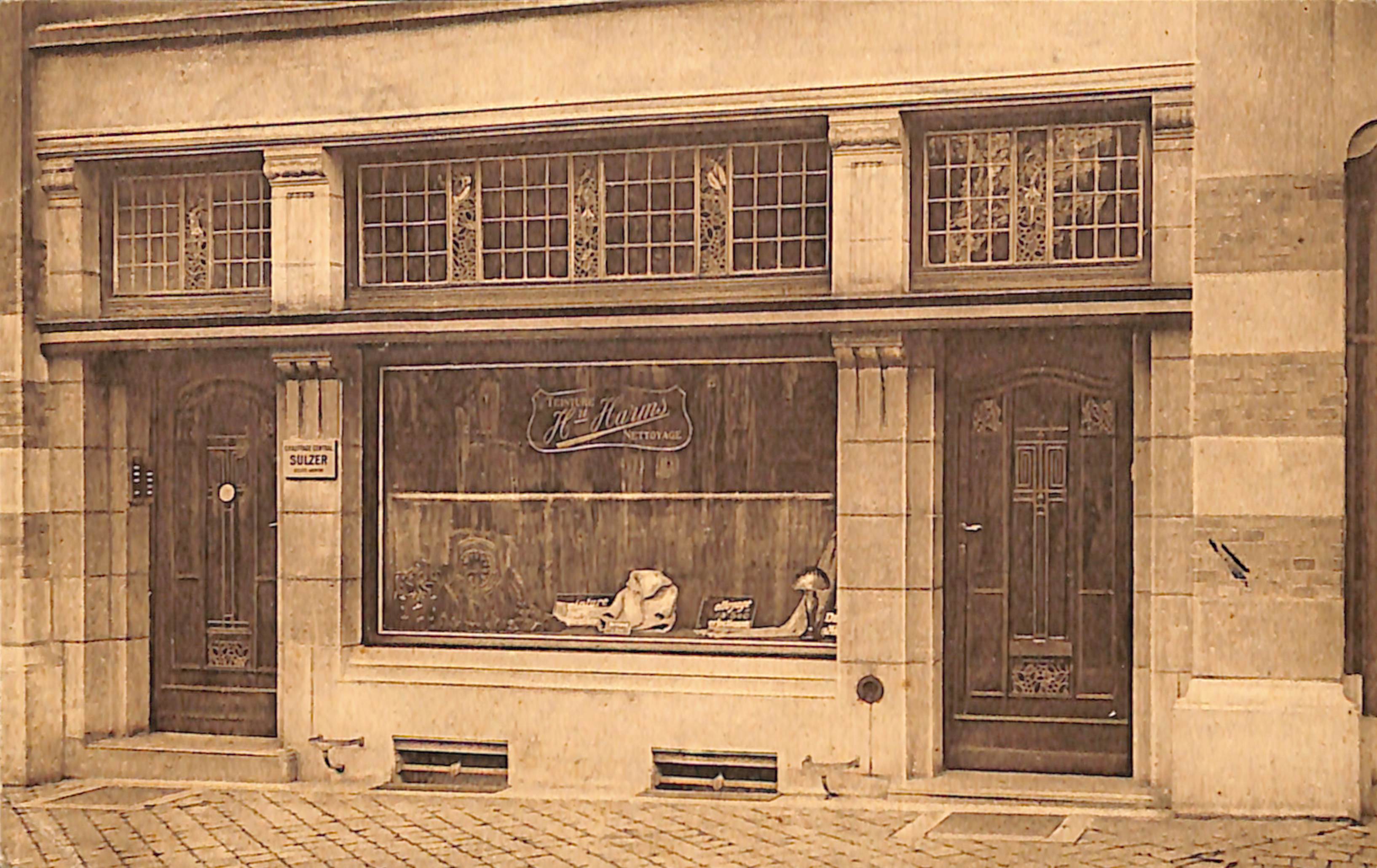 "La photographie ci-contre est celle du magasin / L. des "Teintureries Harms" / 184, Boulevard Léopold II, Bruxelles. / Tél. 640,36. "