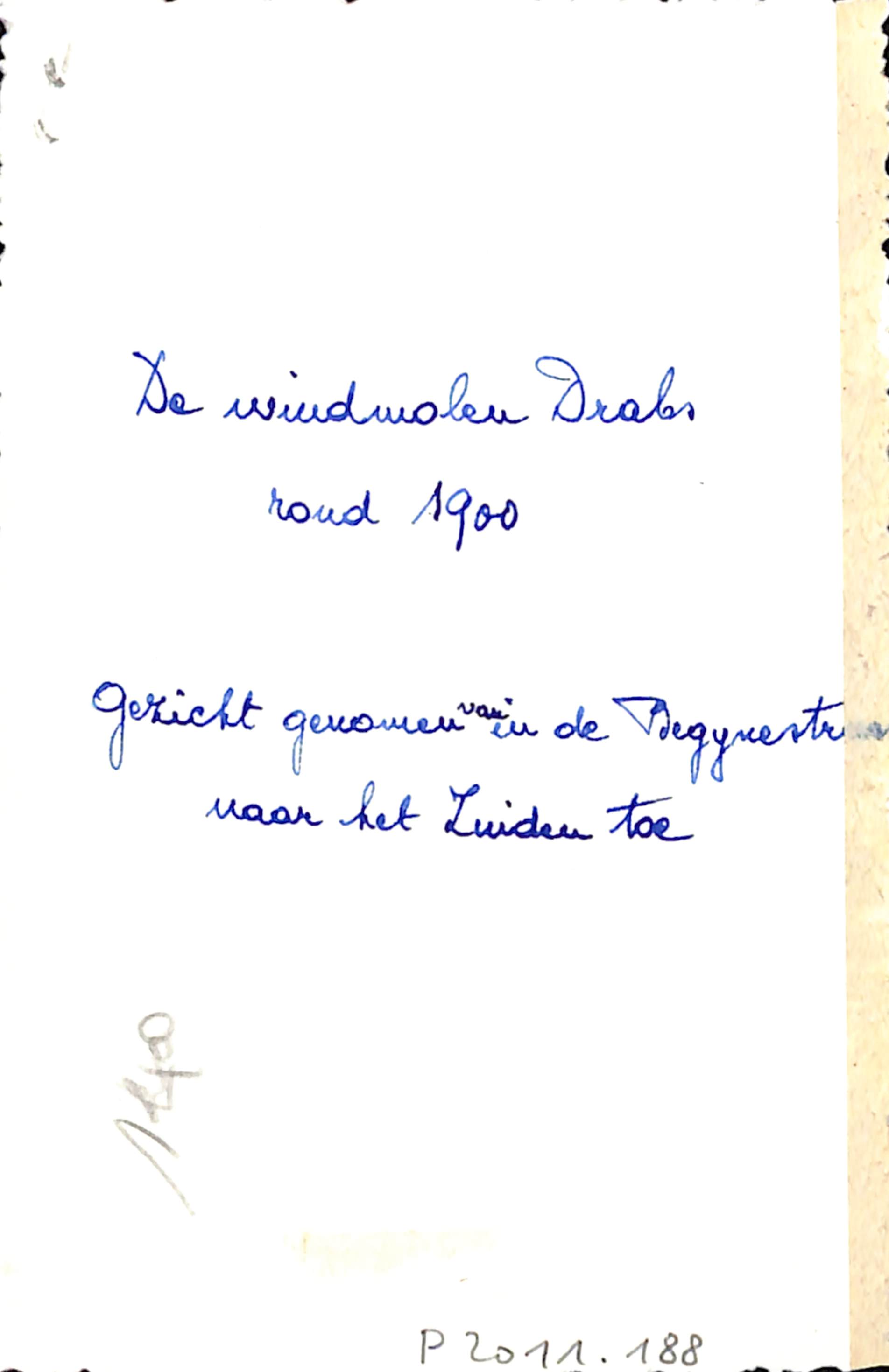 "De windmolen Drabs / rond 1900 / Gezicht genomen van in de Begynestraat] / naar het Zuiden toe "