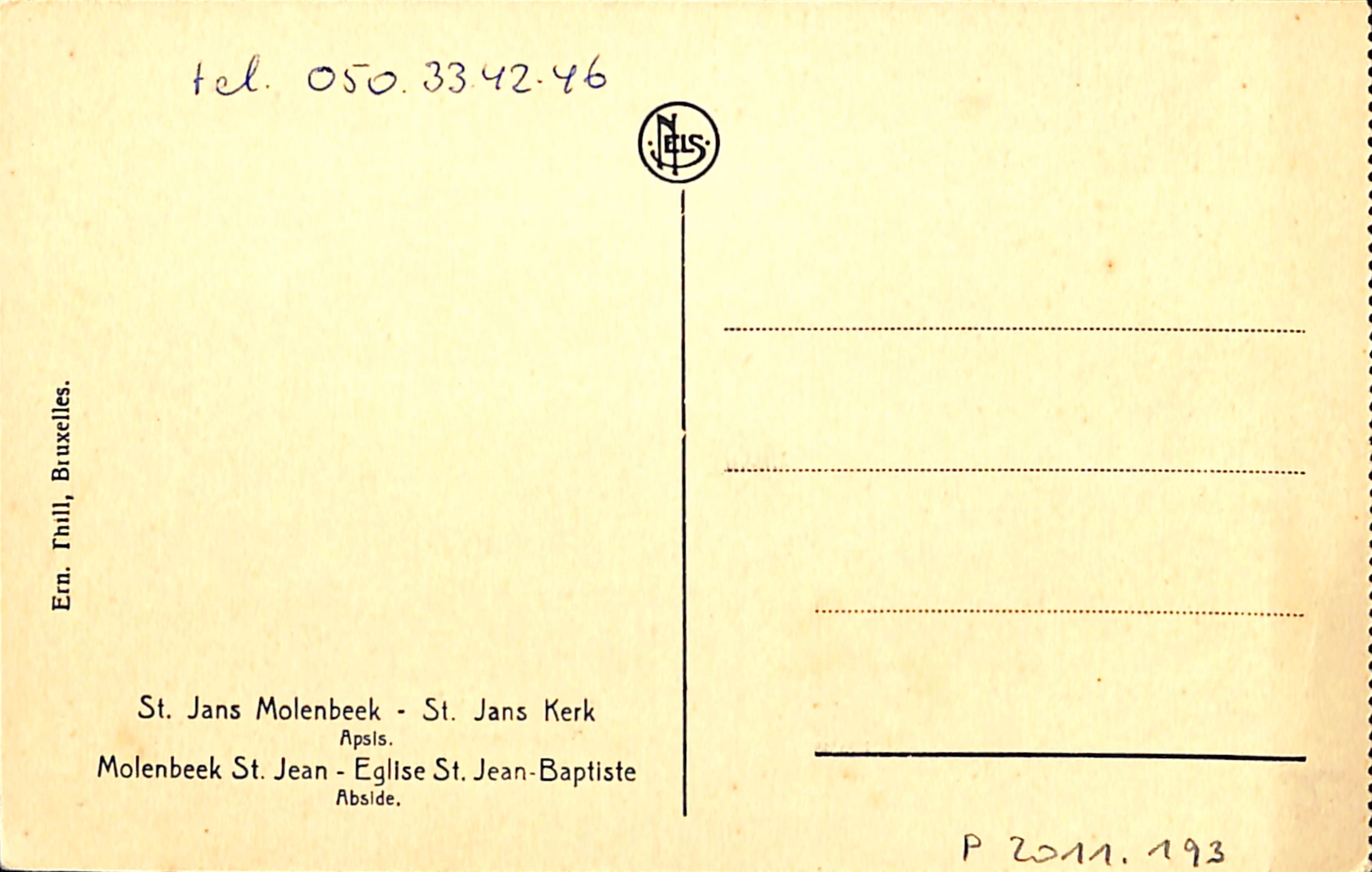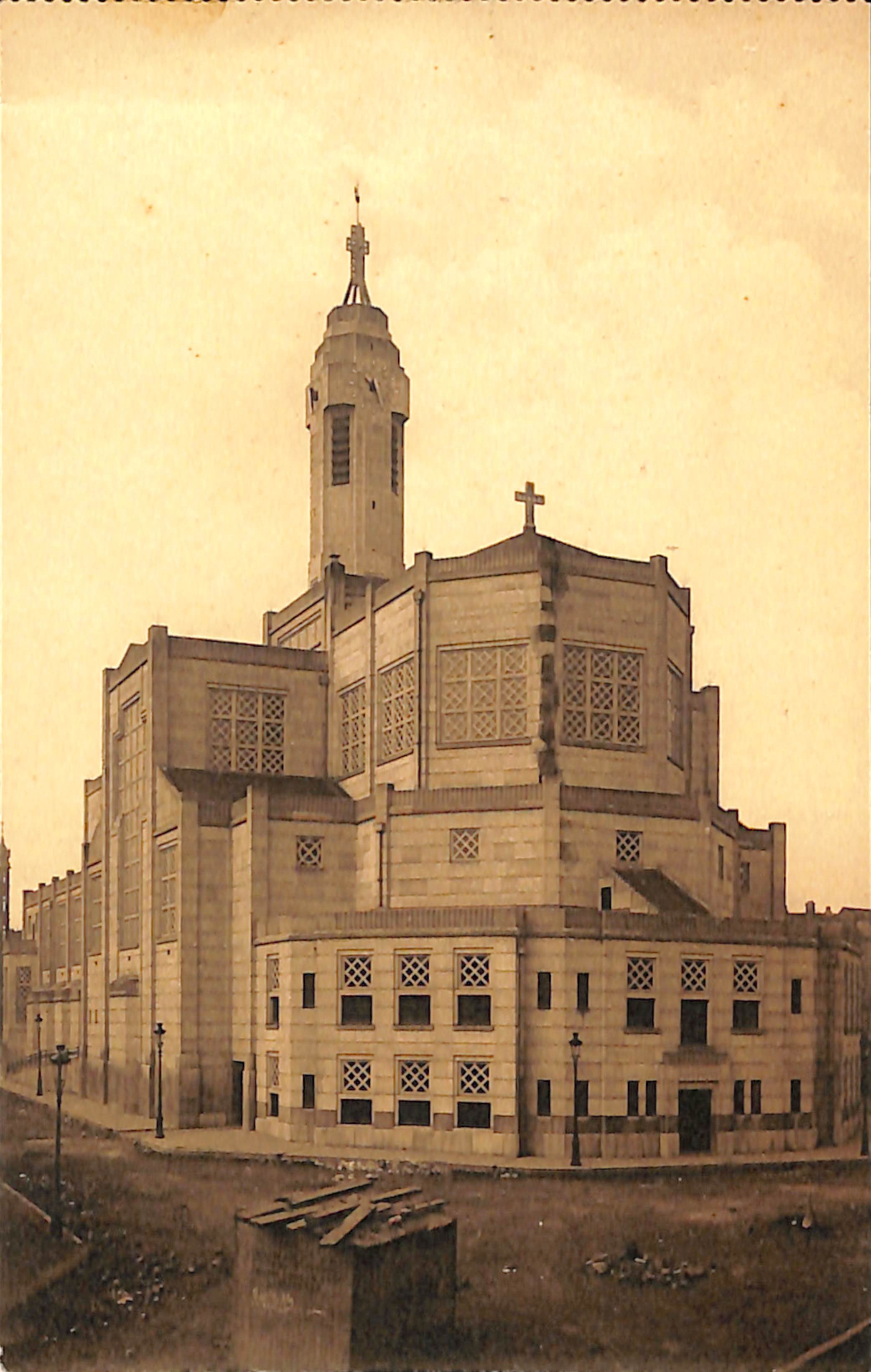 Prentkaart Sint-Jan-de-Doperkerk in aanbouw (Sint-Jans-Molenbeek), zijgevel en apsis, uitg. Ern. Thill - Nels (Brussel), s.d. [rond 1931-1932].