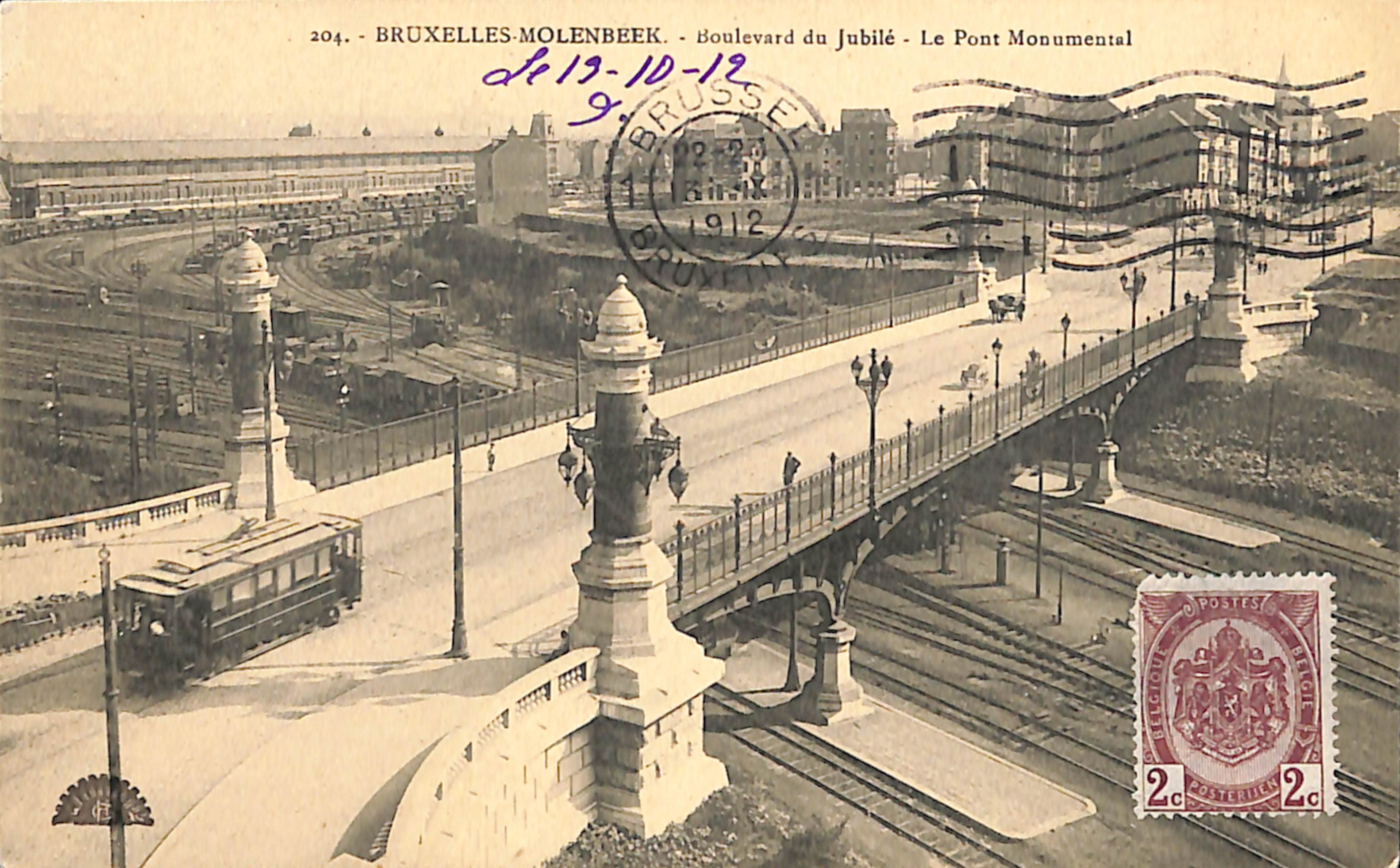 Prentkaart Monumentale brug tussen de Emile Bockstaellaan (Brussel) en de Jubelfeestlaan (Sint-Jans-Molenbeek), uitg. Henri Georges (Brussel), 1912.