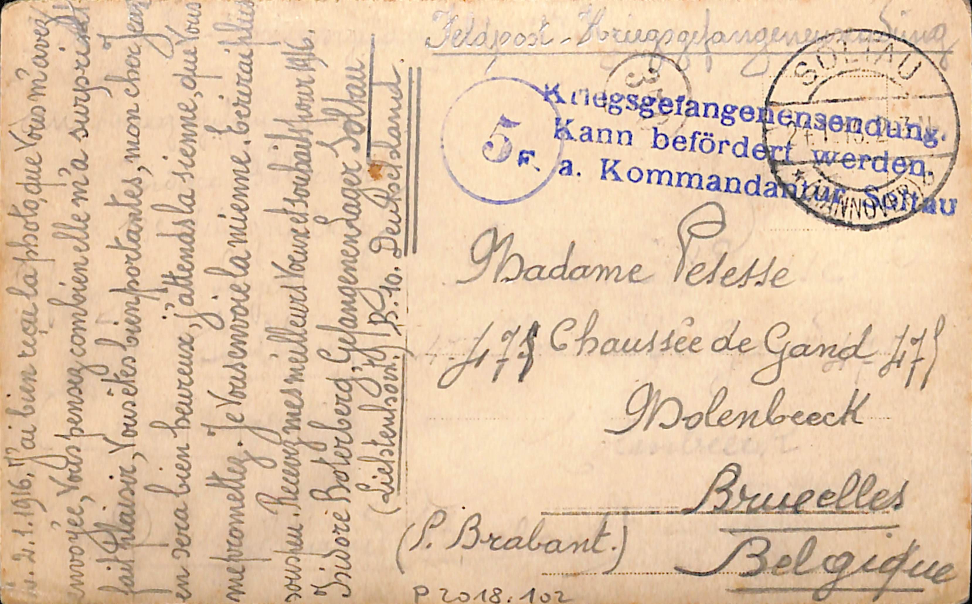 "Kriegsgefangenensendung. / Kann befördert werden. / E. (?) a. Kommandantur Soltau" (stempel op de achterkant)