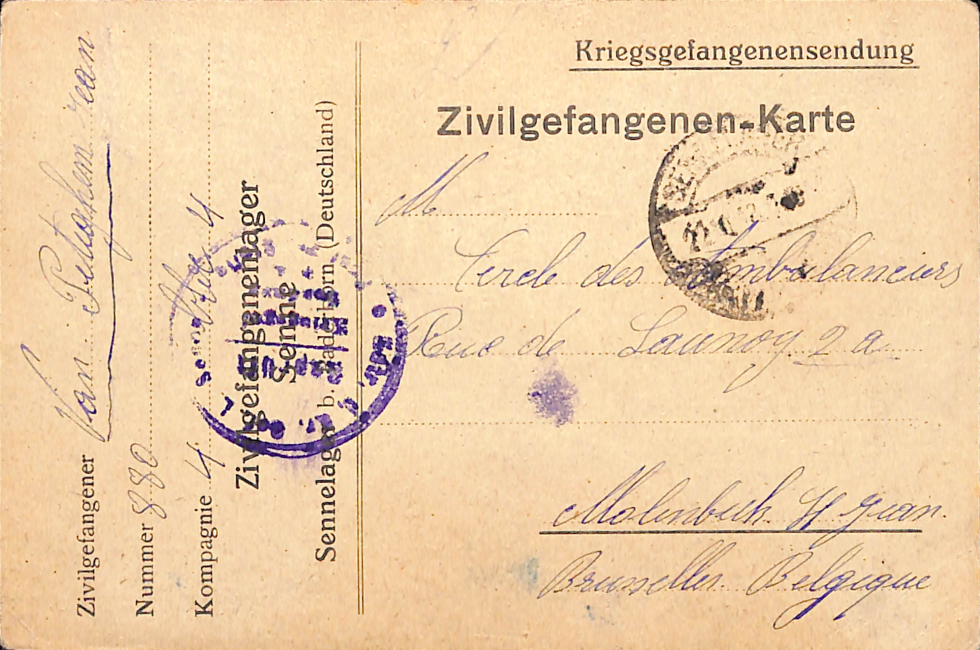 Postkaart van de Belgische krijgsgevangene Jean Van Peteghem, verzonden vanuit het kamp van Sennelager naar Sint-Jans-Molenbeek, 1918.