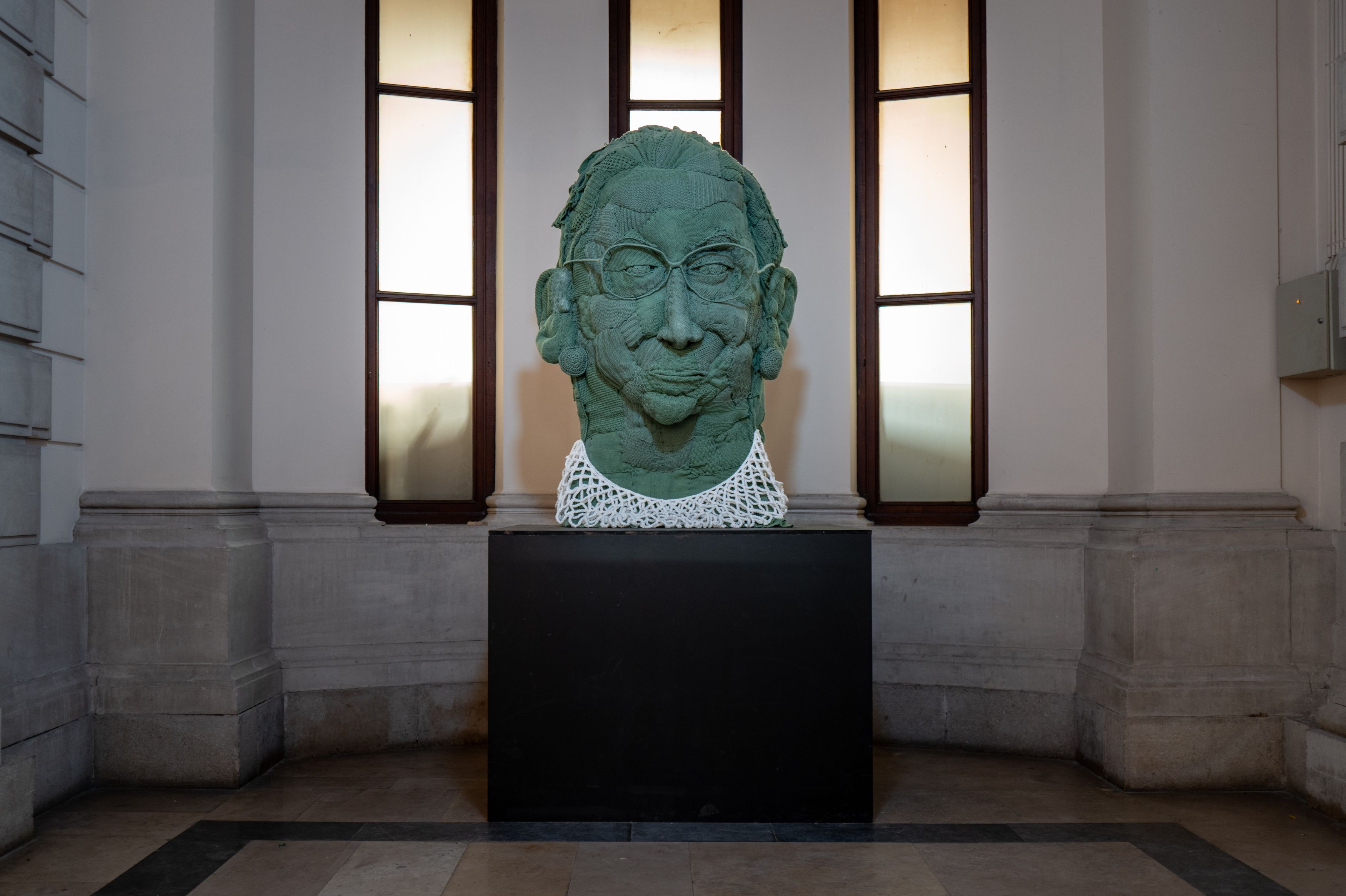 Dit collectieve werk, gemaakt van gebreide, gehaakte en geweven stoffen door 70 deelnemers, is een eerbetoon aan de beroemde Amerikaanse rechter Ruth Bader Ginsburg, voorvechtster van vrouwenrechten en gelijkheid. Dit is de eerste keer dat een vrouwelijke rechter vertegenwoordigd is in het Justitiepaleis.