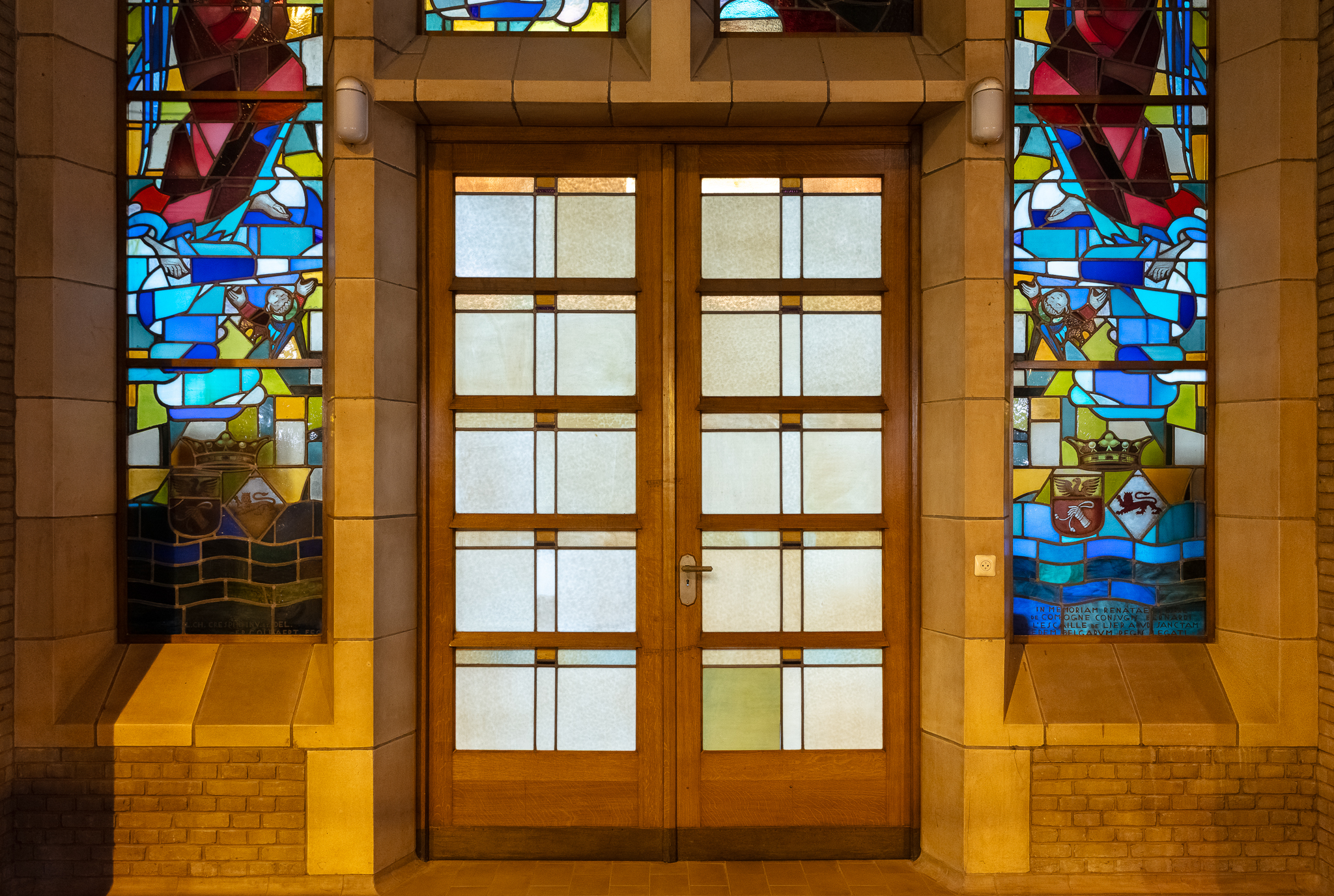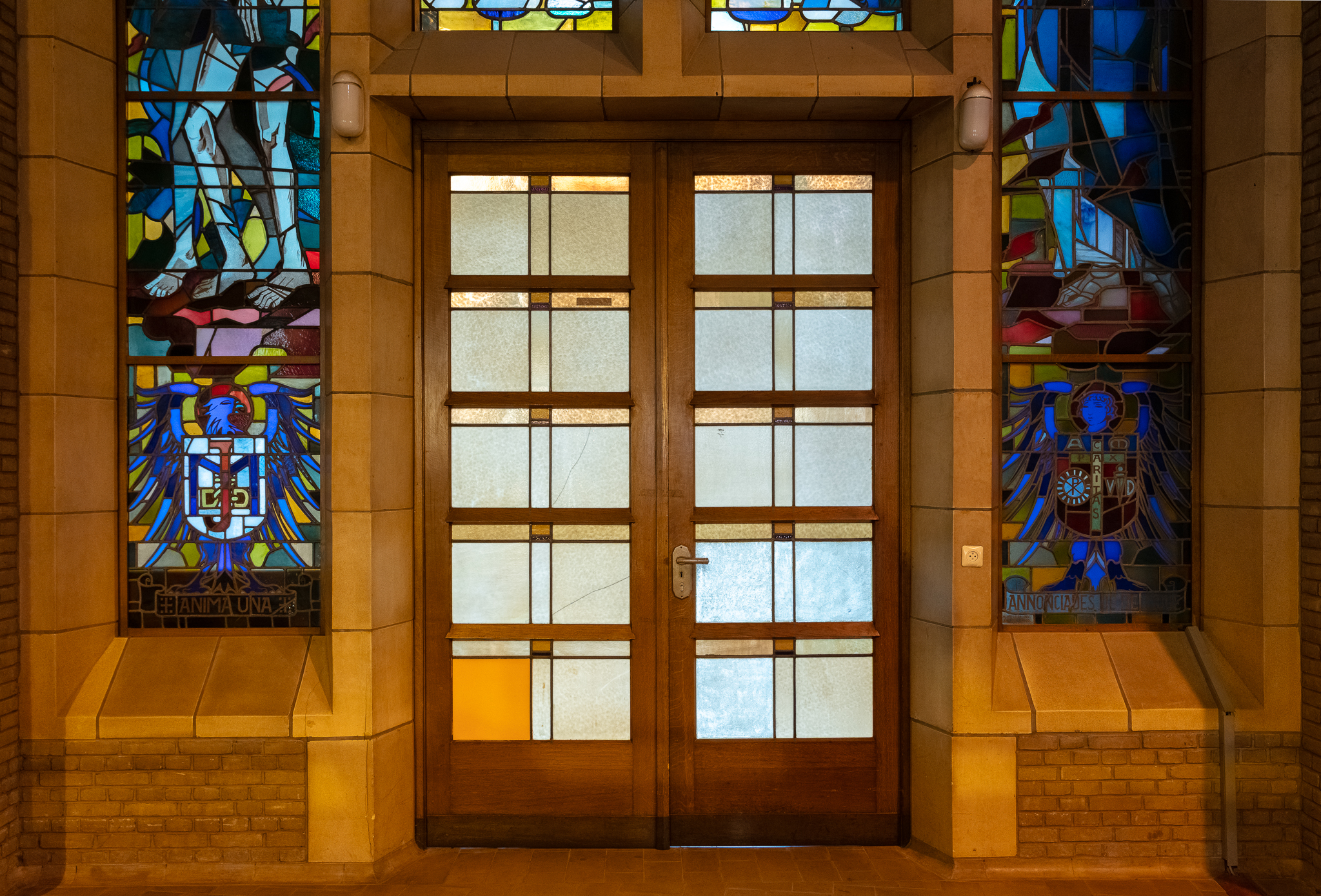 Elke dubbele deur is omlijst door glas-in-loodramen (vier lancetvensters) die van links naar rechts de Annunciatie, de verschijning van het Heilig Hart van Christus aan Marie-Marguerite Alacocque en de belofte van een Verlosser voorstellen.