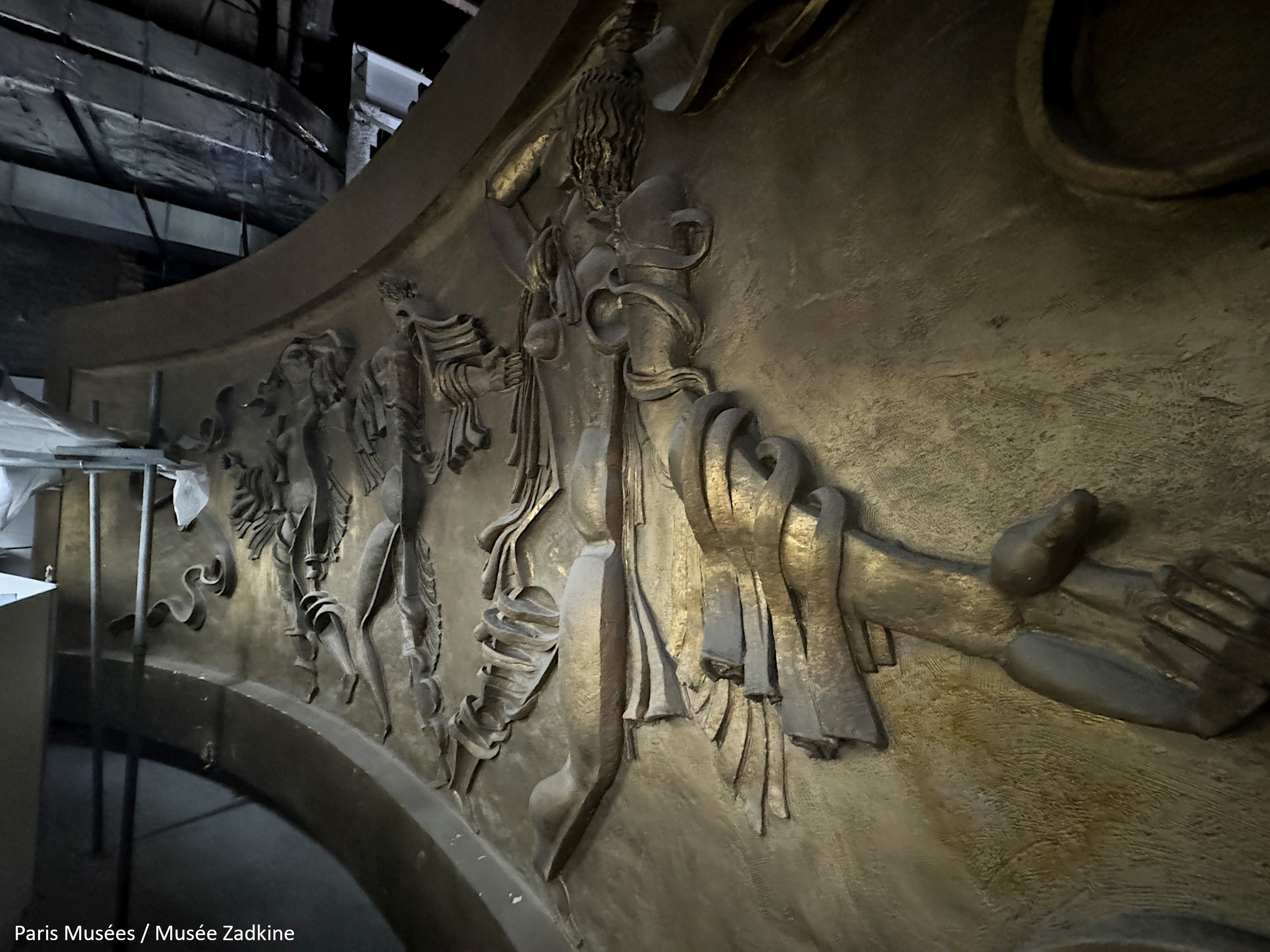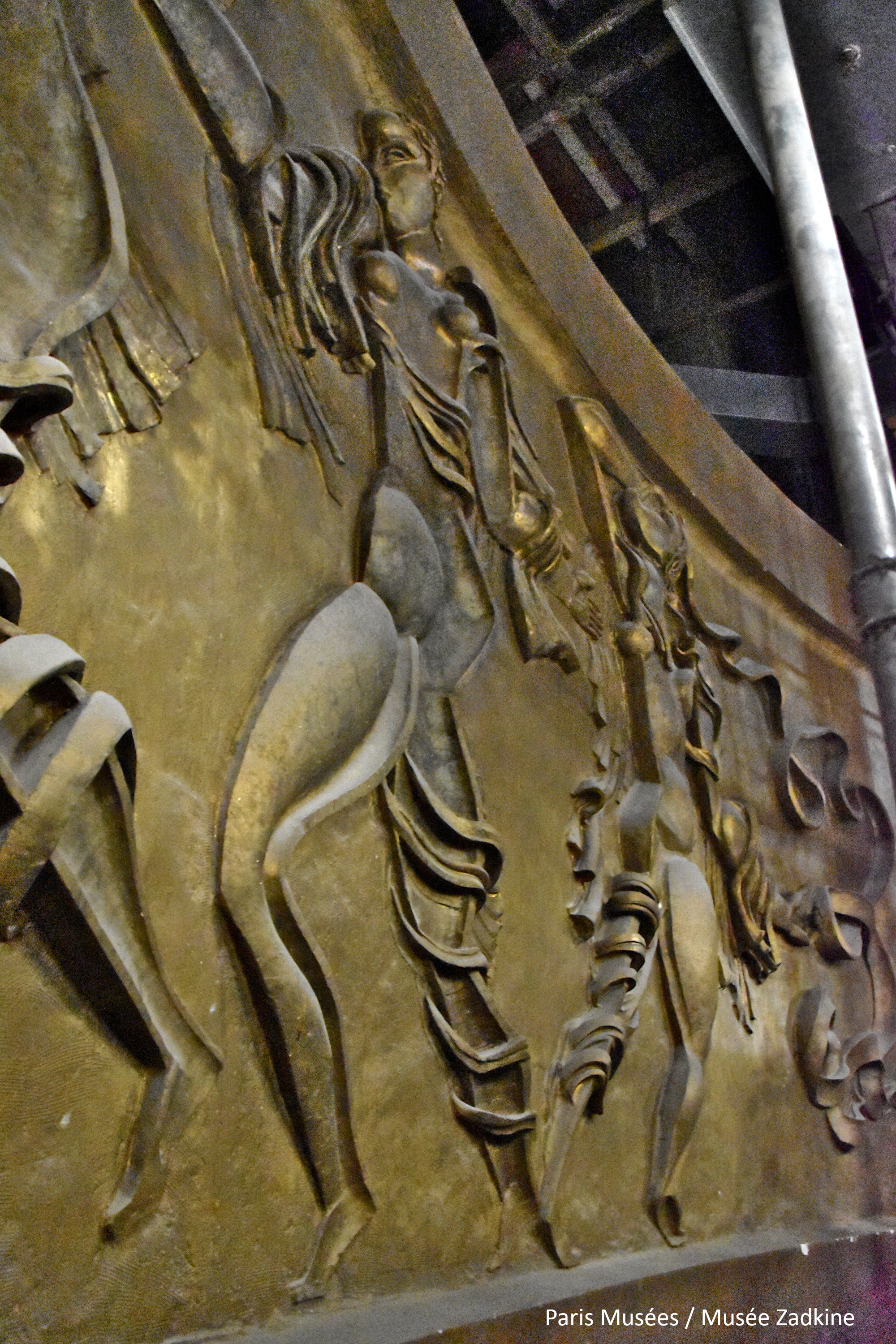 Zadkine vervaardigde dit monumentale reliëf zelf, in situ, tijdens de bouw van de zaal. De drie dansende figuren met linten – die filmstroken zouden kunnen oproepen – doen denken aan de friezen van Griekse antieke monumenten die de beeldhouwer bewonderde. Het reliëf, uitgevoerd in gips, is bedekt met een goudbronzen patina.