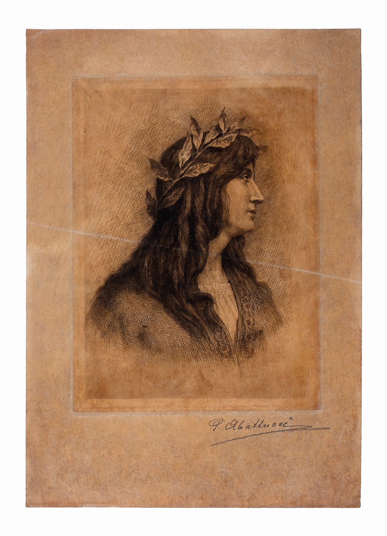 Pierre Abattucci, zonder titel (Busteportret van een vrouw met een lauwerkrans), gravure, s.d.