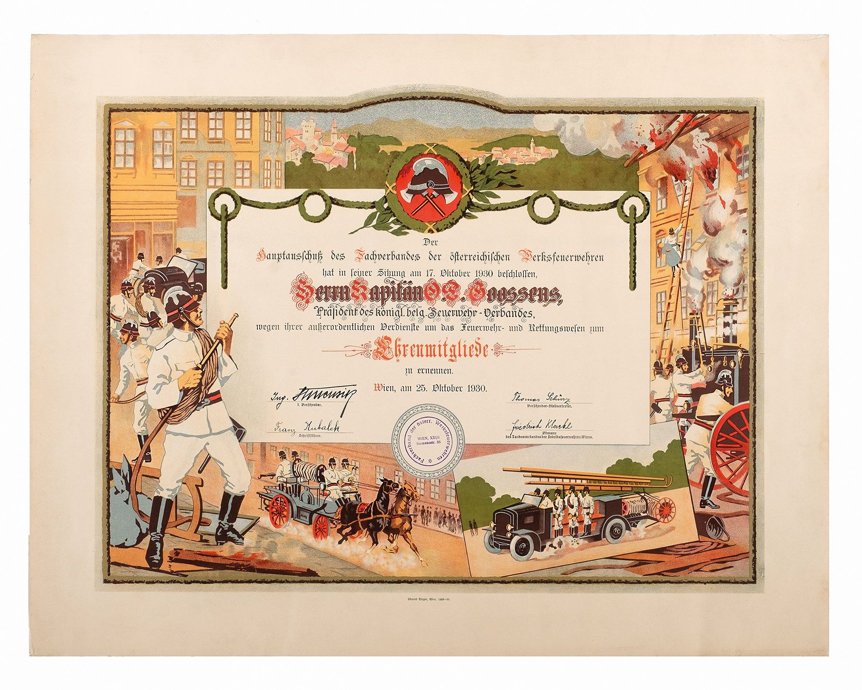 Diploma van Ere-lidmaatschap toegekend door de Fachverband der österreichischen Werksfeuerwehren aan Oscar Goossens, kapitein van de brandweer van Sint-Jans-Molenbeek, 1930.