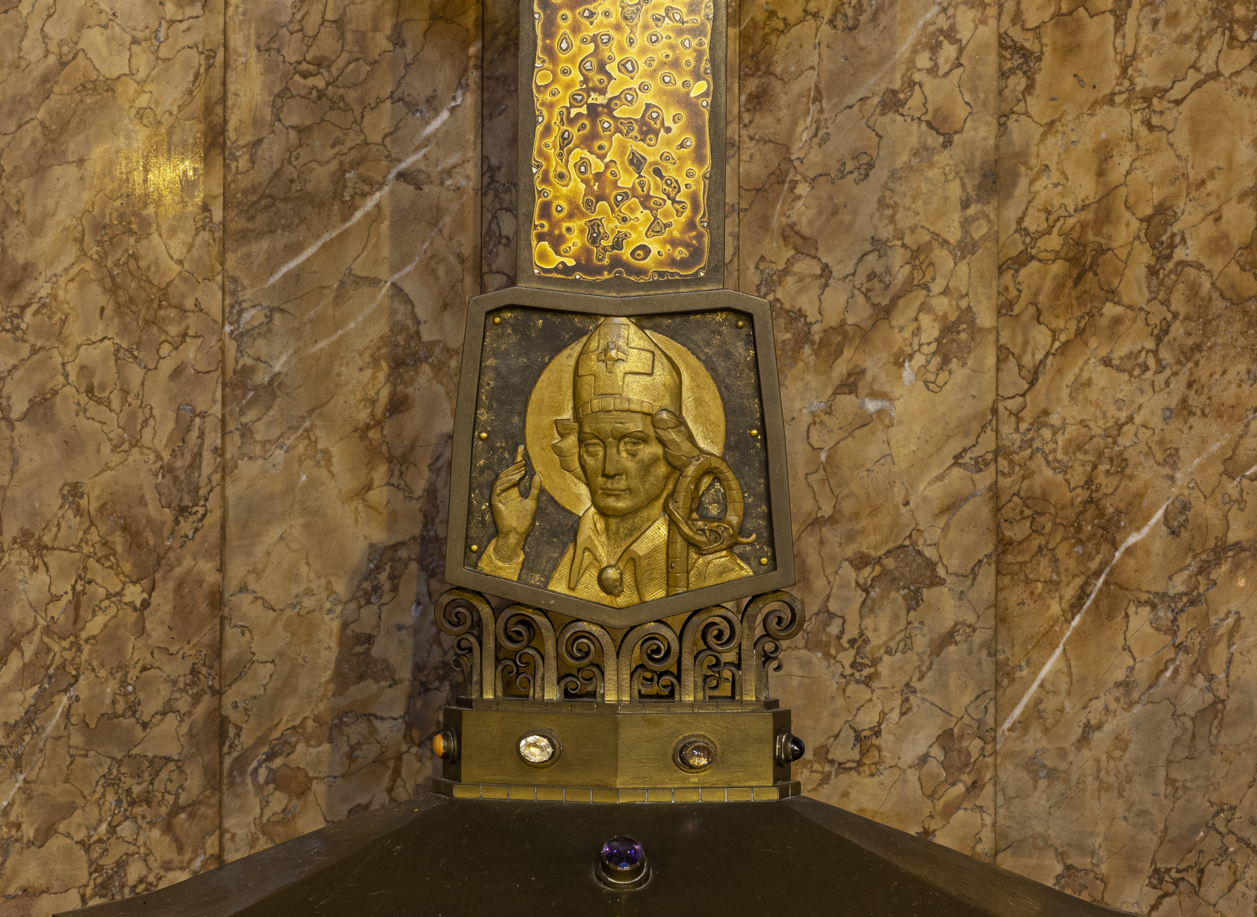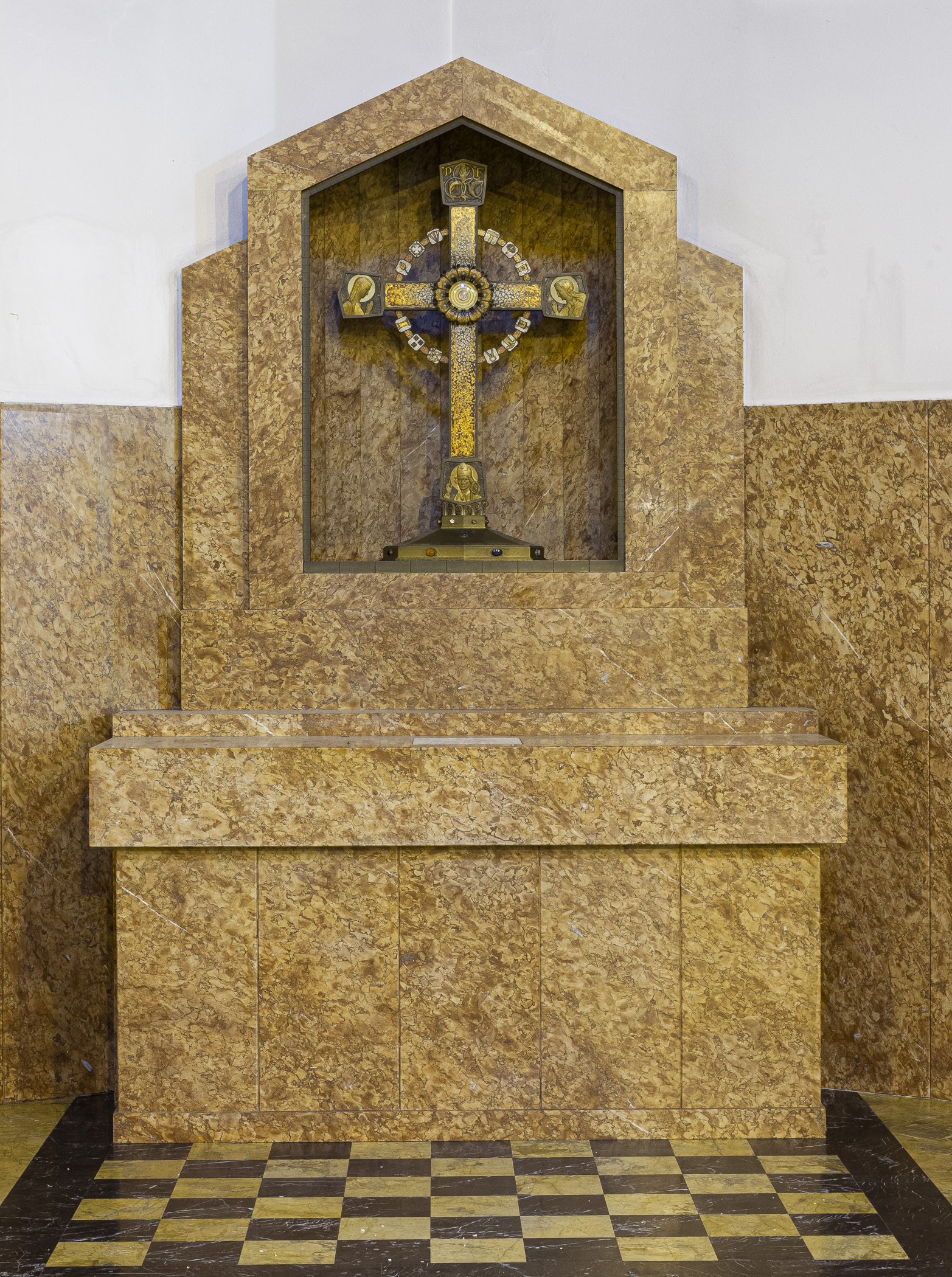 Dit reliekschrijn van het Heilig Kruis, dat in een nis boven een van de zijaltaren is geplaatst, is gemaakt door de Brusselse edelsmid Henri-Joseph Holemans. Deze laatste heeft ook verschillende prestigieuze werken gemaakt voor de schatkamer van de basiliek van Koekelberg.