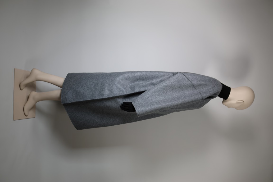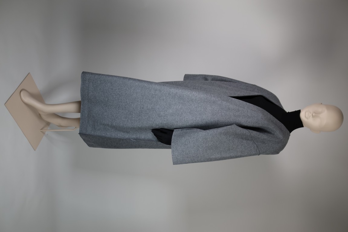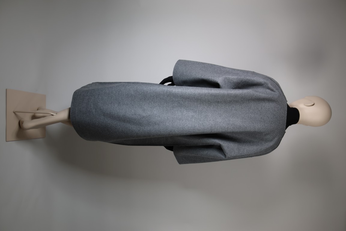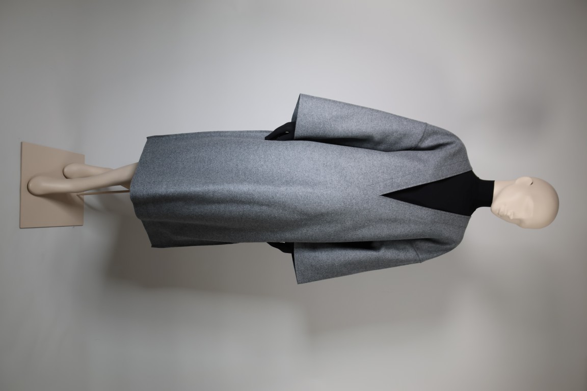 Grijze wolvilt, zwart nylon en elasthane jersey, zwart leder.