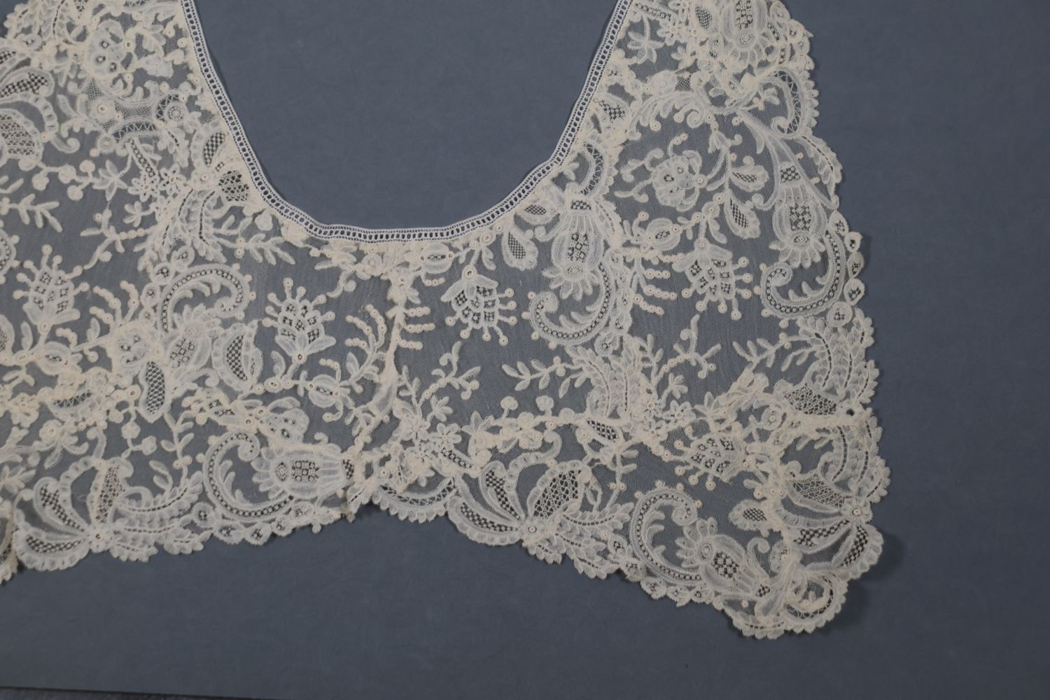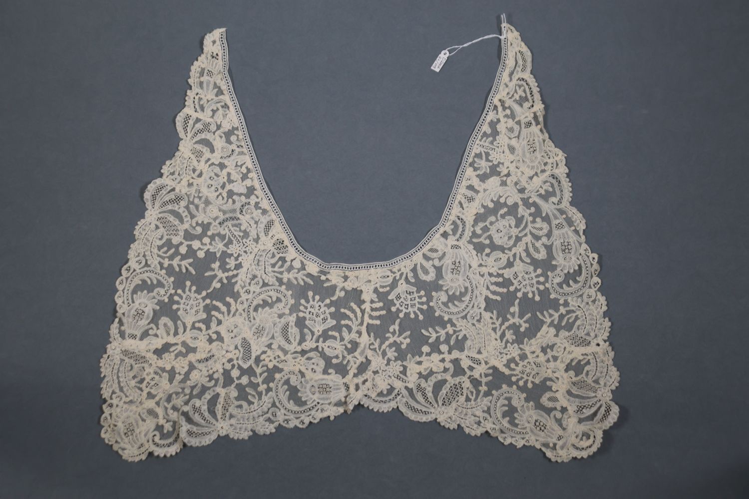 Bloemmotieven met kleine bloemen in het midden en grote bloemen in krullen aan de randen. Geschulpte bovenrand.