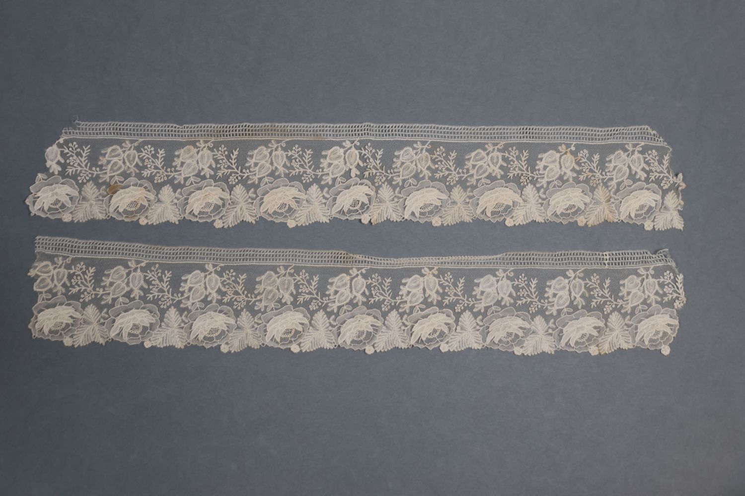 Grote rozen in reliëf op een achtergrond van gaas en inlegwerk van bladmotieven met de naald.