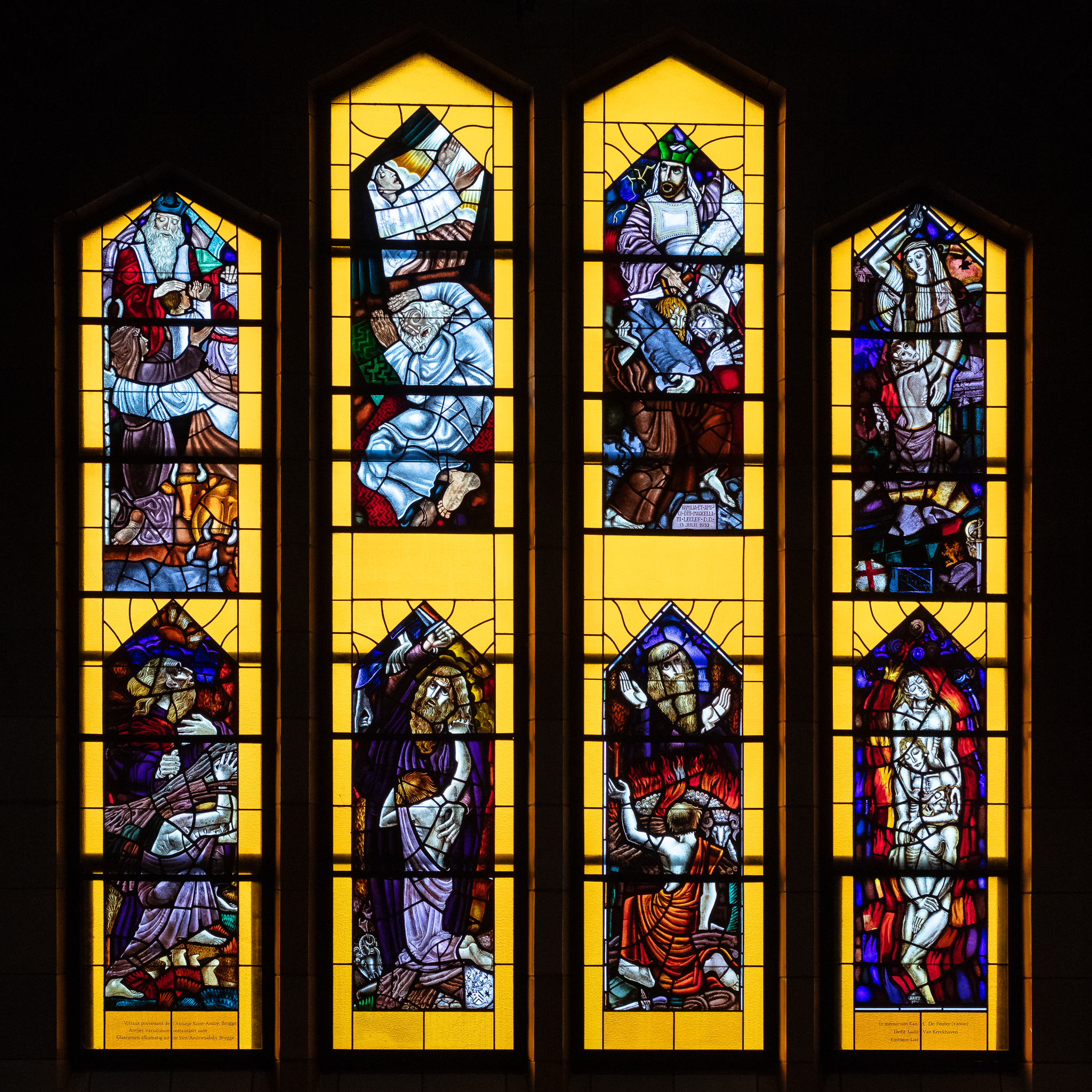 "Vitraux provenant de l'Abbaye Saint-André, Brugge / Atelier Versicolore restauravit 2016 / Glasramen afkomstig uit de Sint-Andriesabdij, Brugge"