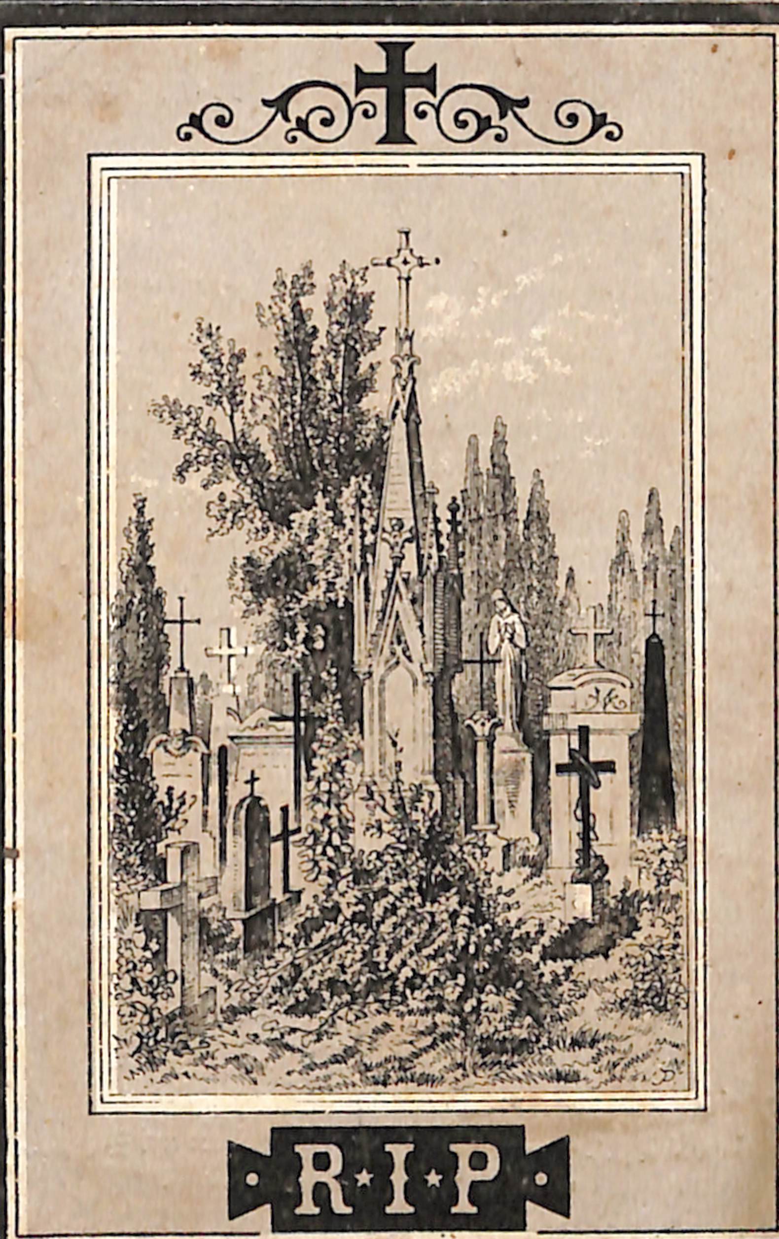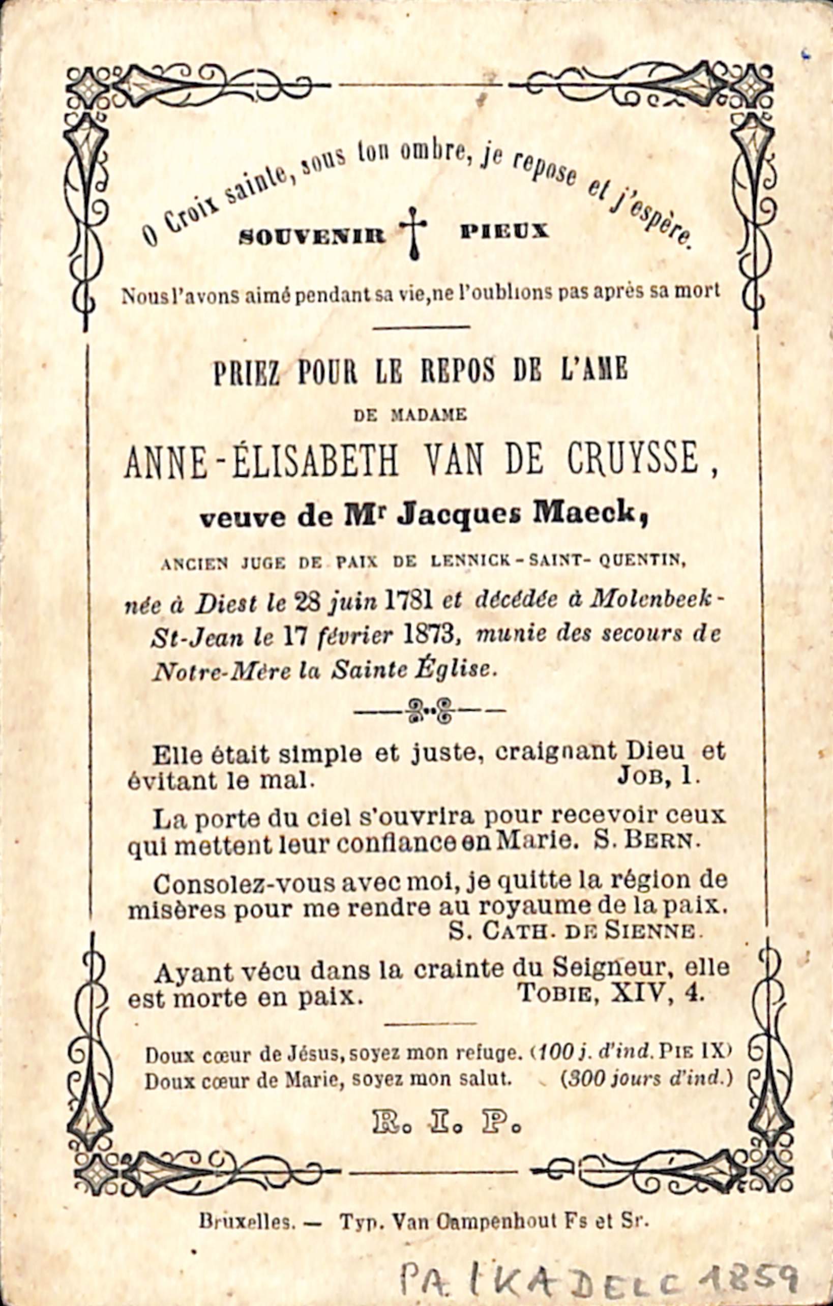 Doodsprentje Anne-Elisabeth Van de Cruysse (Diest, 1781 - Sint-Jans-Molenbeek, 1873), drukk. Van Campenhout Fs et Sr, 1873.